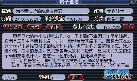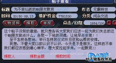 为了迎接梦幻十周年,叶子猪将独家推出梦幻美文回顾系列,从2013年11月13日开始至12月底,每天回顾一篇经典美文,看看梦幻十年间那些名人留下的名言以及玩家在梦幻中的爱恨情仇,欣赏他们优美的文笔。 点击此处查看更多>>>> 今天是11月25日,第13篇回顾美文《香格里拉万人垂泪送别:非凡小三》。本文由′后庭菊花开于2010年9月17日发表于叶子猪论坛,由墨荷推荐。 推荐理由:香格里拉服务器一名服战玩家因工作事故离开了人世,全区玩家自发组织为这个同区友人哀悼送行,对一个逝去的生命表示哀思。这在游戏史上是史无前例的,相信当年参加过送行的玩家回忆起这个事件,更能体会到,人间有情,大爱无疆。 浮生一梦幻,方寸声声慢,非凡源菩提,西游多罹难。 痛君长去去,生者倍郁郁,香格里拉情,愿卿天堂顾。 ———走好小三 【前言】 对于香格里拉的玩家来说,今晚是个难忘的日子。 全区人民为一个逝世的同区友人哀悼送行 对一个逝去的生命表达哀思 二、小三意外逝世 几天前小三由于工作事故离开人世。 区里的服战人员和具有号召力的人们为他哀思 将在晚8点(编者注:16日晚) 在香格里拉区里举行哀思 在此邀请各位闲着的猪友一同为 同是梦幻玩家的 非凡小三 送上深切的哀思。 我刚刚了解到情况 时间紧迫 报道简陋 请见谅 慢慢会补完报道 今晚持续报道哀思活动情况 愿非凡小三 安息。 三、好友纷纷三界发帖,思念惋惜之情,油然而生 【区里具有影响力的人员和小三的好友们 的发帖】 (区里著名LG-元霸转世) 整个悼念活动进行了一个多小时,我们是有血有肉的梦幻玩家,游戏里虽然充斥着各种小丑、骗子,但是多数是有爱的梦幻玩家。 至此我们回顾一下小三之前在某论坛的采访 86年的小三,一个年轻的生命 他的梦想与执着,他的友情与奋斗 不得不让人在此感到惋惜 感到生命的脆弱,但也感到游戏中的真情 再次祝愿小三在天国能够安息! 最后为小三道上一句: 一路走好! 下面是部分叶子猪猪友的留言: 痛君长去去,生者倍郁郁,香格里拉情,愿卿天堂顾。 ———走好小三 曾经的挚友,现在却两地相隔~~愿你在另一个世界能登上更广阔的梦幻舞台~~ ——挚友:轻狂如我-老邓 破三,一路走好,希望你在那边,也过得幸福。冷月,黯伤,我,我们都会很想念你.....都会想你..... ——爬树的小猪 留 真可惜,这几天没有上号,不知道区里给小三举行的活动,三哥 一路走好!总是难以忘记冷月带队,你、我、还有小白,我们一起刷任务的日子,那段时间是我玩梦幻最快乐的时候了,后来冷月走了,慢慢的,你、小白、丸子级别高了,不经常在一起玩了,后来好友都删掉了,呵呵,但还是忘不掉那些快乐的日子。 一直都叫你啊三,一路走好! ——孤独せ小生 留 下页为玩家为送别非凡小三的各场景,大家纷纷作出难过,惋惜之情