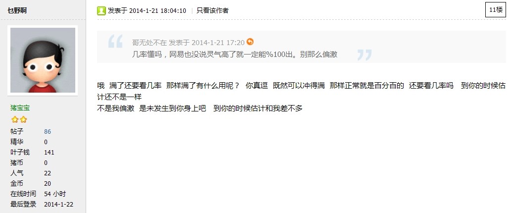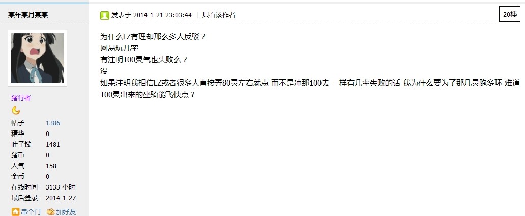 相关文章: 本文观点来源玩家,不代表叶子猪任何观点与立场。 又到了周二,叶子猪特色栏目“每周玩家心声”——倾听玩家,让梦幻更美好。这期是第十二期。 (注:每周玩家心声主题若被选择奖励50猪币,50猪币=50点卡>>>>征集入口<<<<) 我们将认真收集和整理玩家的心声,将其中合理的部分摘录出来,努力架构一条桥梁让策划与玩家形成良性互动。欢迎大家踊跃参与叶子猪梦幻平台发布的各类资讯、活动等,并发表自己的心声。 《梦幻西游2》十岁了!作为国产第一网游,能够这么多年风风雨雨走下来而不倒,可以说是玩家倾注了无数的心血的支持。 十年来每一点改动,都是一份成长。 这一期我们关注到有玩家在论坛说自己孵化飞行器时,已经满灵可依旧失败,认为网易不应该单用几率来解释一切,否则就是纯坑钱,于是希望: 满灵孵化飞行器应该100%成功! 玩家乜嘢啊:表示自己按照任务需要花费几百万游戏币满灵孵化,结果失败,在线投诉GM,GM却各种借口说这是几率。 玩家认为GM解释不到就遁走,这是逃避,要求网易赔偿。 玩家无聊赖看看aaaaa:系统已经解释了灵气高几率大,没有说满灵一定成功。 该玩家回应:这不应该是几率说了算,只是因为这样的事情没有发生到自己身上,所以很多人只是看热闹! 玩家某年某月某某:有理的是玩家,为什么还有人维护网易?就是网易那万恶的几率说,不注明100灵会失败! 玩家平看雪飘嘲讽:神奇的网易,神奇的概率,神奇的满灵气! 不难看出,大部分玩家还是认为这种几率的东西太不科学,而且游戏中的几率说到底还不是数值策划填的?只要根据需要,做一定修改,玩家的辛苦说不定就得白费! 有玩家更是直言:几率?我看是内鬼!什么都解释成几率,哪天网易倒闭也是几率? 不得不说,既然飞行器已经成为祥瑞一种,那么确实应该让玩家在获取上更为便利,满灵孵化时应该100%成功。 玩家才是一个游戏的核心,迅速为玩家排忧解难是策划工作职责所在!倾听玩家心声,让梦幻更公平更精彩。 对于此次玩家心声鸡翅收录整理到此,接下来的一周将继续关注玩家们的心声。 欢迎大家发表意见,也许你就是下一期的主角。