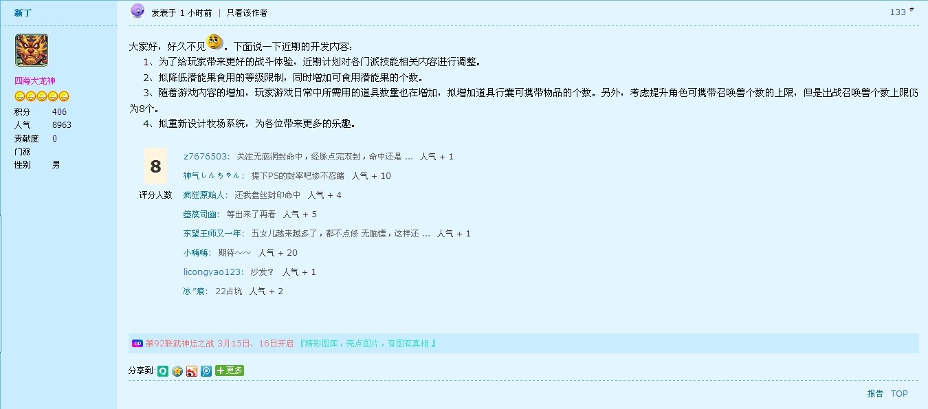 新丁是现在梦幻pc端的总策划人了。我们的白爷已经不是策划了,他现在是网易副总裁! 就在半小时前刚爆料出这些内容,有图有真相 具体内容给大伙复制下: 大家好,好久不见。下面说一下近期的开发内容: 1、为了给玩家带来更好的战斗体验,近期计划对各门派技能相关内容进行调整。 2、拟降低潜能果食用的等级限制,同时增加可食用潜能果的个数。 3、随着游戏内容的增加,玩家游戏日常中所需用的道具数量也在增加,拟增加道具行囊可携带物品的个数。另外,考虑提升角色可携带召唤兽个数的上限,但是出战召唤兽个数上限仍为8个。 4、拟重新设计牧场系统,为各位带来更多的乐趣。 吐槽: 门派又要修改了,我们的女儿村危险吗?还是要在五庄身上下手了? 提高修炼果等级限制,和食用个数,我们的129天科玩家有福了?换句话说,我们跟土豪的差距又要被拉开了。 物品跟召唤兽携带增加,难道以后8个神兽不是最屌的。是凑齐全部神兽吗?还有,战斗是不是要打得更久了呢? 牧场重新设计!我们不关注好玩不好玩,我们关注的是,四脚动物能卖多少钱!还有,修理牧场和清洁牧场能不能少点钱? 明天小编发个帖子,大家来讨论下! [编辑:墨荷]