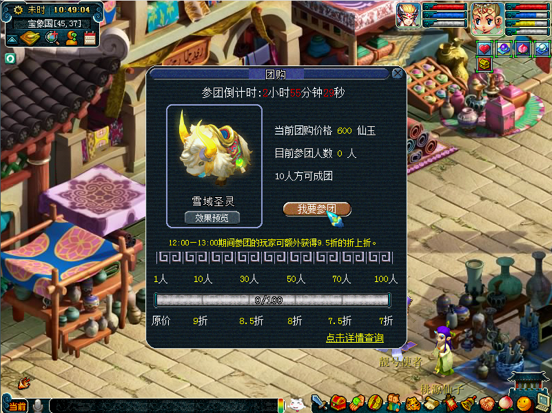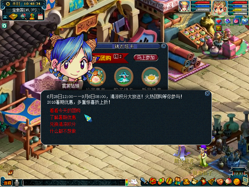 2、活动期间,购买锦衣、祥瑞、彩饰、炫卡以及在锦衣打折特卖场进行消费后,每消费1点仙玉即可获得1点暑期清凉积分。 ①、消费累计的积分可以用于抽奖,1000积分可抽奖一次。100%中奖! ②、消费累计的积分还可以自由兑换奖品,境外合成旗、神兽变身卡等奖品等你来拿!抽奖及积分兑换时间:2016年6月28日12:00~2016年10月11日08:00 积分可兑换奖品如下: 特别说明: 1、暑期活动优惠不能与其他优惠叠加(如优惠券、同款锦衣半价等)。 火热团购 活动时间: 2016年6月28日12:00~2016年9月6日08:00 商品确定时间: 中午12:00 每天参团时间: 中午12:00——下午16:00 商品付款时间: 下午16:05——晚上24:00 活动介绍: 活动期间,每天霓裳姑娘都会选择一款商品(锦衣、炫卡、彩饰、祥瑞)供大家团购。前往霓裳姑娘,点击选择“暑期优惠1”即可参加当日团购。当天参团玩家达到10人才能成团。 温馨提示: 1.参团玩家需要缴纳100万梦幻币作为保证金。 2.在当天商品付款期间前往霓裳姑娘处,如果组团失败可直接取回保证金,如果组团成功则在购买商品成功时自动获得保证金返还。 3.霓裳姑娘的特别提醒:保证金仅在当天返还,过时不取的话,我可是会没收的哦! 周周秒杀 活动时间: 2016年6月28日12:00~2016年9月6日08:00 活动期间每周六、周日晚间:19:00、20:00、21:00、22:00刷新物品 活动介绍: 活动期间,每周周六、周日晚间的整点时分,前往宝象国(48,39)处找到霓裳姑娘,点击选择暑期优惠2,马上参与即可看到最新的优惠信息。每件物品88点仙玉,数量有限,先到先得!