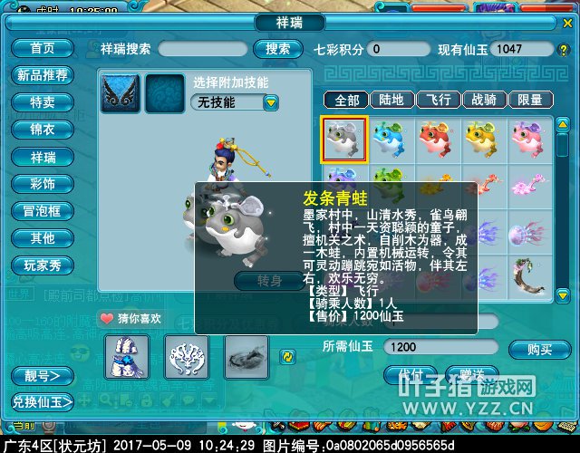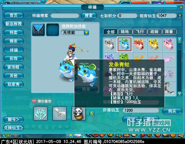 Hello,猪友们,今天小编给大家带来新飞行祥瑞“发条青蛙”的游戏效果图,因为是手工制作,所以不会眨眼睛算正常吧!不过那扭动的弧度倒是挺有趣的,貌似青蛙系列的设计不错,正好小编缺只座驾,直接用月卡送的咸鱼秒了,转动发条,我也能上天了!
