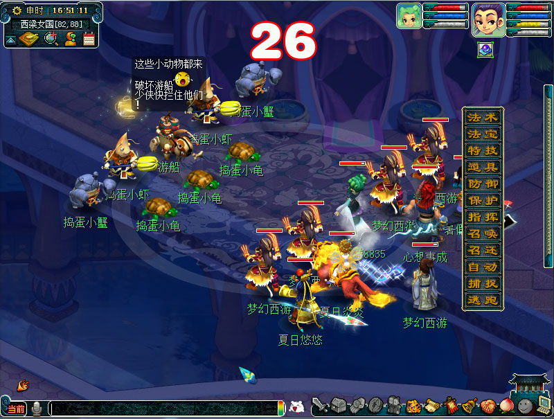 特别说明: 1、任务不受双倍、精修时间影响,死亡计算为非正常死亡,原地复活无损失; 2、任务时限40分钟,可以在儿时玩伴处取消任务,取消任务3分钟内不能再次领取任务; 3、完成任务将获得夏日积分,可以兑换召唤兽寿命和消暑西瓜,积分达到一定要求,还能领取暑假活动称谓、水晶冰盏和夏日赠礼抽奖机会。 朝雨连绵解谜团 活动时间: 2017年7月25日维护后至8月15日8:00 领取要求: 等级≥50级,队伍人数=5人 活动介绍: 渭城雨连绵不断,导致将士们无法出行,似乎是天宫遗失的雨灵珠遗落在此?其中谜团重重,还请少侠帮忙解开吧! 迷你副本。活动期间全天,玩家(角色等级≥50级,队伍人数=5)可找长安城(237,115)的儿时玩伴领取任务进入副本。完成任务后可获得丰厚的经验、金钱和物品奖励。 特别说明: 1、任务不受双倍、精修加成时间影响,死亡计算为非正常死亡,原地复活无损失; 2、每个玩家每天只可完成一次"朝雨连绵解谜团"(迷你副本)任务; 3、任务地图内可以使用飞行符、导标旗、灵光宝匣、回门派法术等方式离开。可再次通过找到长安城(237,115)的儿时玩伴处进入场景; 4、完成任务将获得夏日积分,可以兑换召唤兽寿命和消暑西瓜,积分达到一定要求,还能领取暑假活动称谓、水晶冰盏和夏日赠礼抽奖机会。 奇花异草觅蝉影 活动时间: 2017年7月25日维护后至8月15日8:00期间,白天(8:00-24:00)的整点和15分,及其他时间的整点 领取要求: 等级≥30级,队伍人数≥3人 活动介绍: 迷踪知了王带着昆虫们躲在了各种花草之间,然而这可没有消磨三界少侠们对捕蝉的乐趣。 整点投放怪玩法,活动期间,每天8:00至23:59期间每个整点及15分,0:00至8:00期间每个整点,玩家(≥30级,至少3人组队)可在东海湾和花果山等地完成任务,并可获得丰厚金钱、经验、物品奖励。白天(8:00-23:59)还将投放BOSS知了王哦! 特别说明: 1、任务不受双倍、精修加成时间影响,死亡计算为非正常死亡,原地复活无损失。 遨游四海展歌喉 活动时间: 2017年7月25日维护后至8月15日8:00 领取要求: 等级≥50级,单人任务 活动介绍: 悠悠长假,当然是要约上三五好友出游啦。遨游在外,红尘作伴,何不一展歌喉,唱出心中愿景呢? 特色玩法,活动期间每天12:25至13:00,18:55至19:30开放。角色等级≥50级的单人玩家可以通过长安城(237,115)的儿时玩伴进入妙音仙阁一展歌喉,根据积累的闯关关卡数还可以在儿时玩伴处兑换丰富奖励哦! 游戏形式为答题闯关,题型为猜歌词的选择题,共有25关,对应场内25个NPC。少侠答对某个NPC处的全部问题视为闯关成功(答错一题视为闯关失败,需要重新挑战本关),成功后前往指定的下一个NPC处继续答题闯关。每成功闯过一关扣除25点体力并获得经验奖励,闯关失败不扣除体力。 单场闯关排名前三的玩家,还能获得“妙音歌王”称谓奖励 随着关卡增加,难度递增。在整个活动期间,累积闯关到一定数量,可以在长安城(237,115)的儿时玩伴处领取丰厚奖励哟! 特别说明: 1、单人任务不受双倍、精修加成时间影响; 2、累积闯关奖励需要在2017年8月15日08:00前领取。 阶段三:风起清凉踏浪花--8月15日维护后至9月5日12:00 穿山越海阅红尘 活动时间: 2017年8月15日维护后至9月5日12:00 领取要求: 等级≥30级,队伍人数≥3人 活动介绍: 好天气岂可辜负?儿时玩伴约你一起去海滩啦,快快叫上三界的众人,一起享受盛夏的好风景吧! 重复领取式环任务。活动期间全天,玩家(角色等级≥30级,队伍人数≥3)可找长安城(237,115)的儿时玩伴领取任务。完成任务后可获得丰厚的经验、金钱、物品奖励。前100环为双倍奖励,101至160环为1.4倍奖励,161环后无奖励。 队长带队参与玩法,有概率获得“百果冰沙”,品尝可获得金钱或物品奖励。