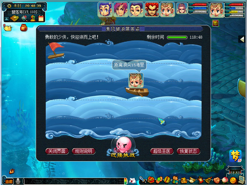 特别说明: 1、任务不受双倍、精修加成时间影响,死亡计算为非正常死亡,原地复活无损失; 2、每个玩家每天只可完成一次"风起山间咏情歌"(迷你副本)任务; 3、任务地图内可以使用飞行符、导标旗、灵光宝匣、回门派法术等方式离开。可再次通过找到长安城(237,115)的儿时玩伴处进入场景; 4、完成任务将获得夏日积分,可以兑换召唤兽寿命和消暑西瓜,积分达到一定要求,还能领取暑假活动称谓、水晶冰盏和夏日赠礼抽奖机会。 赤岩丛林戏蝉趣 活动时间: 2017年8月15日维护后至9月5日12:00期间,白天(8:00-24:00)的整点和15分,及其他时间的整点 领取要求: 等级≥30级,队伍人数≥3人 活动介绍: 雷霆知了王得意的以为躲在赤岩之上就不会被发现,可还是被发现啦,少侠们何不去与它戏耍一番呢! 整点投放怪玩法,活动期间,每天8:00至23:59期间每个整点及15分,0:00至8:00期间每个整点,玩家(≥30级,至少3人组队)可在东海湾、花果山等地完成任务,并可获得丰厚金钱、经验、物品奖励。白天(8:00-23:59)还将投放BOSS知了王哦! 特别说明: 1、任务不受双倍、精修加成时间影响,死亡计算为非正常死亡,原地复活无损失。 解暑偷闲制冰沙 活动时间: 2017年8月15日维护后至9月5日12:00 领取要求: 等级≥50级,单人任务 活动介绍: 夏日炎暑,何不自制一杯清凉的冰沙来尝尝?将冰块打碎,再冲入果汁,哇,这可是童年最喜欢的味道! 特色玩法,活动期间,角色等级≥50级的单人玩家可以通过花费体力与其他玩家“交换”来收集冰沙食谱,将收集齐全的冰沙食谱上交给位于长安城(237,115)的儿时玩伴可获得丰富奖励哟! 特别说明: 1、单人任务不受双倍、精修加成时间影响; 2、收集齐全的冰沙食谱需在2017年9月19日8:00前上交给位于长安城(237,115)的儿时玩伴; 3、若在2017年9月05日12:00后食谱未收集齐全,也可将未完成的食谱上交给儿时玩伴,兑换部分经验奖励; 4、若不慎丢失冰沙食谱,可在长安城(237,115)的儿时玩伴处重新领取。 全阶段:水泳一夏乐畅游--7月5日12:00至9月5日12:00 乘风破浪展英姿 活动时间: 2017年7月5日12:00至9月5日12:00期间,每日12:00至24:00开启 领取要求: 角色等级≥30级,队伍人数≥3人 活动介绍: 踏浪冲锋可是别样的英姿飒爽,有胆识的少侠们快来海边结伴冲浪吧! 挑战玩法,玩家(角色等级≥50级,队伍人数≥3人)可找长安城(237,115)的儿时玩伴或傲来国(111,109)水泳裁判长处领取任务进入挑战。完成任务后可获得丰厚的经验、金钱和物品奖励。 少侠们组队来到碧落海迎接怪物挑战,如果挑战的速度过慢或者战斗失败,将会从浪尖被冲至浪尾,被冲下海浪则结束挑战。最终,裁判将根据少侠在浪花上的位置来颁发奖励哦! 在浪尖上移动规则如下: 每累计进入战斗3回合,就会被海浪向后冲1海里; 每成功挑战了一次,则向前移动2海里; 战斗失败、逃跑了则后退3海里; 在碧落海中有不同的怪物,他们各有优缺点,针对其特点进行特别的筹备,能够更好的逆流而上哟! 特别说明: 1、任务不受双倍、精修时间影响,死亡计算为非正常死亡,原地复活无损失; 2、碧落海开放时间为每日12:00至24:00,其他时间内无法参与玩法; 水乐无穷游碧波 活动时间: 2017年7月5日12:00至9月5日12:00期间,竞速赛在周一至周六12:00-16:30和18:00-22:30各举办一场预赛,决赛于周日晚18:00-20:00举行。 领取要求: 等级≥30级,队伍人数≥3人 活动介绍: 水泳竞技大会可是每年暑假的重头戏,每每此时,弄潮的少侠都会相聚一堂,共享水乐无穷。 游泳竞速玩法,玩家(≥30级,至少3人组队)可在傲来国(111,109)水泳裁判长处开启任务。周一至周六12:00至16:30和18:00至22:30各举办一场预赛,每周一至周六为预赛阶段,预赛中获得过前十名的玩家都可以参加周日18:00举行的决赛。决赛于周日晚18:00至20:00举行,技艺精湛者将获取特别嘉奖。 竞速赛中,玩家将会在途中遭遇暗雷怪物的挑战,如果挑战失败,需要报到的裁判编号将倒退至之前的裁判。最终以到达十五号竞速裁判处所花费的总时间来排定名次。队伍中不同门派数量过少将无法参与玩法,同时比赛成绩将根据队伍中不同门派的数量进行调整。 竞速赛裁判坐标如下表所示: 特别说明: 1、任务不受双倍加成时间、精修时间影响,死亡计算为非正常死亡,原地复活无损失; 2、每人每场比赛只能完成一次水乐无穷游碧波任务; 觅海寻珍潜深幽 活动时间: 2017年7月5日12:00至9月5日12:00期间,每日12:00-16:30和18:00-22:30各举办一场。 领取要求: 等级≥30级,队伍人数≥3人 活动介绍: 东海宝窟藏珍纳宝,趁此夏日水趣,眼馋宝藏的少侠可不能错过,一定要潜入宝窟,一探究竟。 深潜玩法,玩家(≥30级,至少3人组队)在傲来国(111,109)水泳裁判长处报名参加后,即能获得行舟符的法力,法力持续30分钟,法力有效期间通过水泳裁判长进入“东海暗流”,即开始参加深潜比赛。 与东海暗流中每一层的暗流守卫对话,完成他们的要求,即能下潜一层,行舟符有效期间内下潜的层数越多,获得的奖励越多,前三名的玩家还能获得额外奖励,下潜期间亦能获得各式各样的道具,增添潜水的乐趣! 特别说明: 1、任务不受双倍加成时间、精修时间影响,死亡计算为非正常死亡,原地复活无损失; 2、每人每场比赛只能完成一次觅海寻珍潜深幽任务; 佳期畅玩赠利来 活动时间: 2017年7月5日12:00至9月5日12:00 领取要求: 角色等级≥30级,单人参与 活动介绍: 积极参与暑假活动的