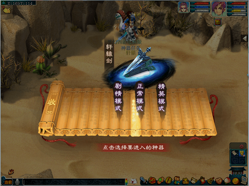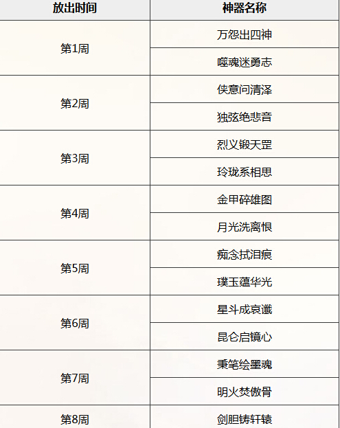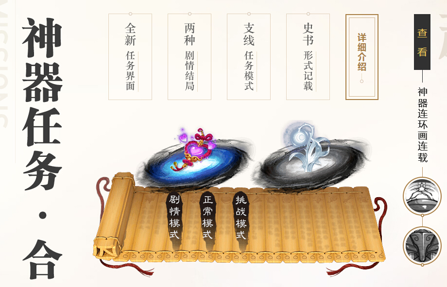 新剧情---神器任务·合 背景设定 轩辕不断在三界中破坏神器,虽陈潇然、凌雨露等人拼死对抗,然而最终不敌,神器尽数被毁,三界生灵涂炭。巫礼不满众生所为,扬言毁灭三界。为了拯救三界,借助神器之书的力量,三界的少侠们踏上了轮回时光,拯救三界的旅程。 领取条件 等级为飞升以上的玩家完成“神器任务·序章”后,可以前往大唐境外(170,113)轩辕处领取“神器任务·合”的相关任务。 难度模式 “神器任务·合”将分为三种难度模式:剧情模式、正常模式、精英模式。其中正常模式和精英模式将会采用“挑战模式规则”。 放出顺序与时间 神器任务·合将在资料篇放出后每周一凌晨三点刷新(需要服务器有至少一名玩家完成了所有神器任务·起和转的任务)。每次按照固定顺序刷新两个,领取时间为每天8:00~24:00,玩家每周只能领取一次“神器任务·合”的任务。神器放出顺序如下: |