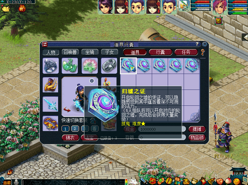 伴随着“神器”的出现,一些神秘的事物也悄悄的降临在三界:一名自称来自轮回之墟的使者——方丹出现在了长安城;而三界少侠在斩妖除魔维护三界安定之时,也发现了从未见过的物品“归墟之证”。利用这股神秘的力量,三界少侠发现自己进入了一个陌生的世界,而往常熟悉的挑战,也变得危机四伏。 玩法说明: 1.需要大于等于50级的5名玩家组队,使用“归墟之证”,方可进入轮回之墟 2. “归墟之证”将在常规玩法中随机掉落,可交易。方丹处每日也会出售一定数量的“归墟之证”,种类随机。 3.“轮回之墟”中死亡将无损失原地复活。 4.每环任务有120分钟时间限制,超时将导致任务失败。 5.开启轮回之墟的玩家将在完成任务后获得额外的队长礼包。 6.每人每天最多进入5次轮回之墟。
