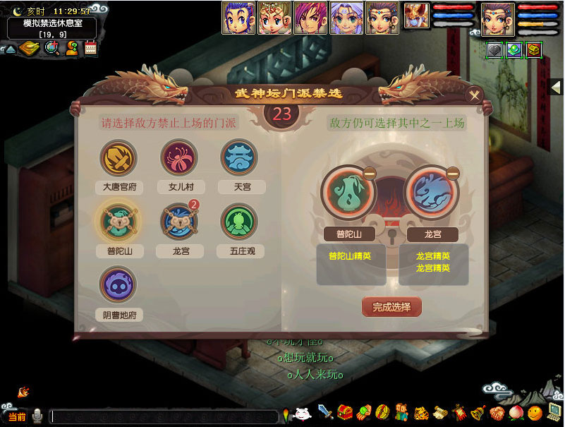 巅峰挑战 武神坛明星赛总决赛的四强赛、季军争夺赛和冠军争夺赛作为梦幻西游的顶尖赛事,将首次引入“禁选”机制!在比赛开始前30分钟左右,将由裁判指引双方5人组队通过“休息室服务使者”同时进行“禁选”。 打破常规套路 禁选过程中,队长可选择任意的对方阵营中的两个门派,目的是使得这两个门派的角色无法同时在比赛中上场,以达成己方战术压制。 与此同时,对方队长也指定两个己方阵营的门派,在接下来的一场比赛中无法同时登场。诸位队长需在5分钟(300秒)内做出选择。 如下图所示,对方的报名门派为:大唐官府、女儿村、天宫、普陀山、龙宫、五庄观、阴曹地府(其中同属龙宫门派的有两名队员);可在这些门派中任意选择两个门派,使得接下来的比赛中这两个门派无法同时参与比赛;图例中选择的是普陀山和龙宫两个门派,即若普陀山门派参与比赛时,龙宫门派无法参与比赛(同属龙宫门派的两名队员都不可以参与),若龙宫门派参与比赛(无论是龙宫门派的一名队员还是两名同时参与)时,普陀无法参与比赛。 尔虞我诈 完成禁选后,将公布双方的禁选结果。此后,双方将有20~25分钟的时间,来参考禁选的结果调整自己的阵容。对方究竟会选择哪个门派上场?而己方又要如何跳出对方的禁选陷阱?一切只有在战斗开始时,才会大白于天下。 在双方进行完禁选后,进行结果的公示,如下图所示: 细则 1、在休息室内5人组队才可进行禁选,仅有队长可进行禁选操作,队员可以观看。 2、在禁选过程中,若不小心关闭禁选界面,可以5人组队在NPC处点击选项“禁选门派”,继续禁选操作。 尝鲜体验 为了让诸位在比赛前及早体验“禁选”玩法,玉帝特派禁选使者来到长安城模拟禁选的流程,宣扬法道和规则。 时间:2017年12月26日22:00-2018年1月9日8:00 地点:长安城344,66 参与要求:仅限武神坛明星赛参赛队伍成员(含替补)且队伍已指定替补个数≥2 玩家们在上述时间范围内可到禁选使者处选择体验“禁选”选项,开始体验“禁选”。 [编辑:墨荷]
