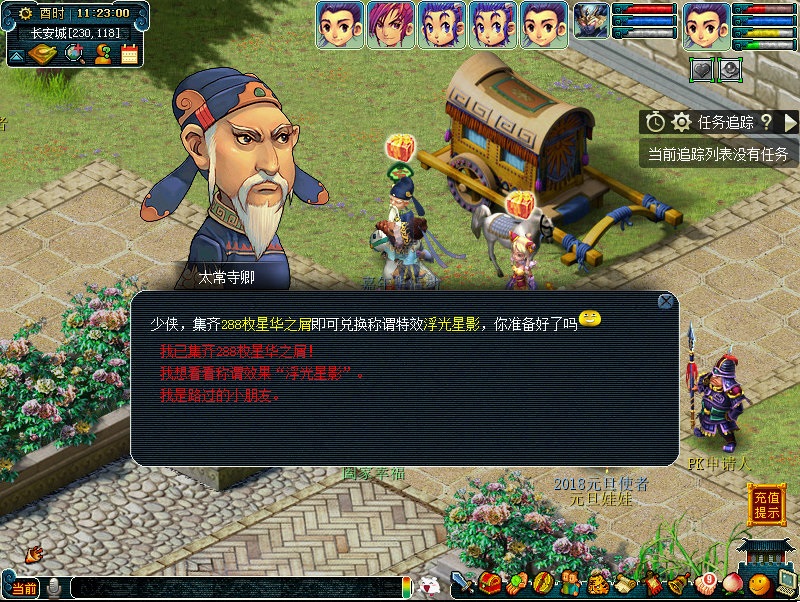 星有灵犀一点通 活动时间 2018年1月2日维护后至1月23日8:00期间全天 活动条件 角色等级≥30级,单人 活动介绍 乘云飞百尺,只手染星尘。星尘之光,可化作神秘的宝物,伴随少侠共游三界。 玩家可在环任务、迷你副本等玩法中获得“星华之屑”。 集齐288个“星华之屑”即可前往长安城主NPC太常寺卿处选择“我已集齐星华之屑(休闲)”兑换特殊称谓“浮光星影”。 |
