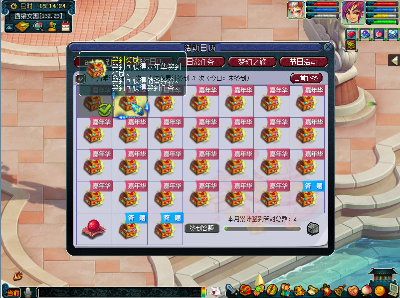嘉年有礼喜相逢 活动时间 2017年12月12日12:00至2018年1月9日12:00期间全天 活动条件 角色等级≥10级 活动介绍 为了表彰各位侠士在嘉年盛典的热心帮助,太常寺卿为各位侠士准备了丰厚的礼物,只要上线即可领取哦!玩家(≥10级,单人)上线即可领取嘉年华签到奖励。 |