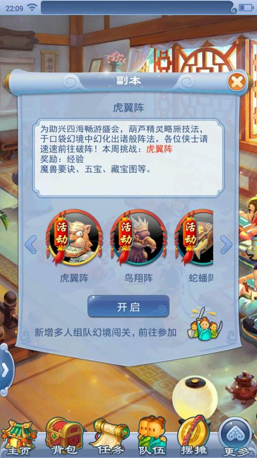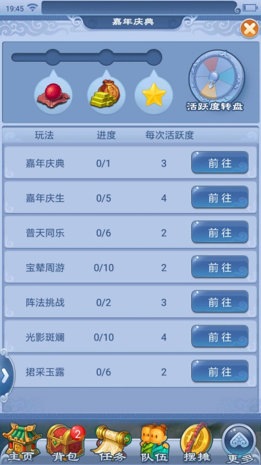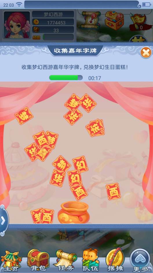 口袋版全阶段活动:幻境瞰长安。 每日登陆 活动时间 2017年12月12日00:00至2018年1月9日24:00 活动介绍 嘉年华活动期间,玩家每天登陆口袋版即可在日常登陆奖励中领取“嘉年华活动登陆奖励”。领取不消耗精力,将会获得经验及“嘉年庆典”特殊葫芦。葫芦需要前往“宝库”-“特殊葫芦”中开启,每次开启消耗100精力,必定获得经验、储备金和嘉年华活跃度,还有机会额外获得五宝、魔兽要诀、超级金柳露等物品奖励。 活跃度与欢乐值 活动时间 2017年12月12日12:00至2018年1月9日12:00 活动介绍 嘉年华活动期间,玩家参与嘉年华活动消耗精力时,可以获得嘉年华活跃度。当玩家当天获得的嘉年华活跃度达到40和80时,将获得一定的经验和储备金奖励;若玩家当天获得的嘉年华活跃度达到100,可获得一颗梦幻幸运星。 集齐4颗梦幻幸运星可获得一次幸运星转盘抽奖的机会,必定获得五宝、魔兽要诀、如意丹、星辉石等物品奖励。 嘉年华活动期间将在主界面设置嘉年华“活跃度与欢乐值”彩色进度条。“活跃度”彩色进度条将根据玩家的当日嘉年华活跃度呈现出不同的颜色,“欢乐值”彩色进度条将根据嘉年华活动期间全服玩家的活跃程度呈现出不同的颜色。点击“活跃度与欢乐值”进度条可查看当日的嘉年华活跃度,兑换幸运星转盘奖励。 阵法挑战 活动时间 2017年12月12日12:00至2018年1月9日12:00 活动介绍 为助兴蟠桃盛会,蟠桃童子略施技法,于口袋幻境中幻化出诸般阵法。各位侠士请速速前往破阵! 一年一度的嘉年华破阵玩法。活动期间,每周将为口袋版玩家们布下五种阵法副本进行挑战,挑战成功后将获得装满丰厚奖励的阵法葫芦,一定不容错过! 玩家可从"副本"进入选择相应的阵法进行挑战。各周开放阵法分别为: 成功挑战阵法副本可以获得副本葫芦奖励。开启副本葫芦必定获得经验、储备金和嘉年华活跃度,还有机会额外获得五宝、魔兽要诀等物品奖励。 嘉年庆生 活动时间 2017年12月12日12:00至2018年1月9日12:00 活动介绍 2017年12月18日是《梦幻西游》14岁的生日。为庆祝这一重要日子幻境内准备了梦幻生日蛋糕。 活动期间,玩家参与收集字牌小游戏,集齐14个字牌(“梦幻西游嘉年华”字牌每种2个),就可以兑换一块梦幻生日蛋糕。兑换蛋糕必定获得经验、储备金和嘉年华活跃度,还有机会额外获得特赦令牌、红玫瑰等物品奖励。 普天同乐 活动时间 2017年12月12日12:00至2018年1月9日12:00 活动介绍 玩家参与“嘉年庆生”玩法,每兑换一块蛋糕,就能获得一次分享蛋糕的机会。玩家可以点击口袋版好友栏中的蛋糕图标,消耗一定的精力将蛋糕与好友分享,分享或者被分享都可获得奖励。如果玩家每天登陆《梦幻西游》互通版,则可以获得一次免费分享生日蛋糕的机会。 分享生日蛋糕可以获得高额经验奖励和嘉年华活跃度,还有机会获得五宝、魔兽要诀等额外物品奖励。 被分享生日蛋糕的玩家也能获得经验奖励。每人每天在口袋版最多可分享5份梦幻生日蛋糕给好友,而每个玩家每天最多能被分享10份梦幻生日蛋糕。 宝辇周游 活动时间 2017年12月12日12:00至2018年1月9日12:00 活动介绍 嘉年华诞,三界同庆,唐王邀三界侠士乘宝辇周游三界。来而不往非礼也,玩家只要为周游盛会献上贺礼,便可获得一架宝辇云游三界了!虽说都是宝辇,飞行速度可不尽相同,侠士们赶快试试吧! 活动期间,玩家点击突发事件中的"宝辇周游"图标进入玩法界面,在界面中点击“启程!”即可驱辇周游。每人每天总计可以周游10次,每次消耗50点精力。 驱辇周游必定获得经验、储备金奖励和嘉年华活跃度,还有机会额外获得五宝、魔兽要诀、召唤兽内丹、如意丹等物品奖励。 光影斑斓 活动时间 2017年12月12日12:00至2017年1月9日12:00 活动介绍 光阴荏苒,似水流年。虽说幻境不大,却也留下了许多玩家的欢乐影像。为了留念这些欢乐的时光,梦幻影像馆向广大玩家开放了。影像馆内,每期都有不同的主角,还有一些有趣的玩法,少侠不妨来试试吧。 活动期间,玩家每天登陆口袋版,即可在“突发事件”中点击“光影斑斓”按钮参与该玩法。影像馆每期会有一个种族角色作为主角,游戏开始后,玩家自下而上依次选择同一排胶片的三个角色中属于主角种族的那个角色,即为正确,同时胶片会自动下降;成功完成30次胶片,可获得胶片末端的“时光葫芦”中的丰厚奖励。 每天最多成功获得10次葫芦中的奖励,每次消耗100精力。精力在成功游戏时扣除。 特别说明 1.游戏中若选择错误可继续游戏,但会增加5秒的游戏总时间。 2.玩家可以在进入游戏界面查看成绩排行榜。 捃采玉露 活动时间 2017年12月12日至2018年1月9日每天12:00-16:00,18:00-22:00 活动介绍 嘉年华云游盛会在即,车辇周游三界所需的凌霄玉露尚不充足。甘露灵仙已经降临于口袋幻境之中,各位少侠,快点前往讨要一些凌霄玉露吧! 活动时间段内,玩家点击突发事件"捃采玉露"图标即可进入玩法击杀投放怪。每个活动时间段内每人每天有3次成功击杀的机会,每次消耗50点精力。击杀后必定获得经验、储备金和嘉年华活跃度奖励,还有机会额外获得五宝、魔兽要诀、召唤兽内丹、如意丹等物品奖励。
