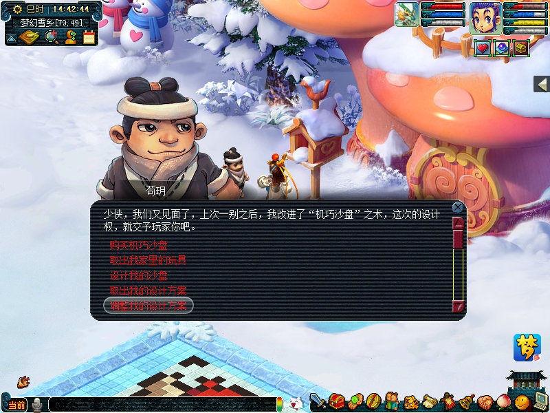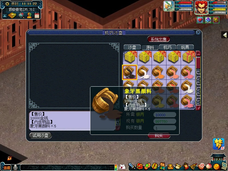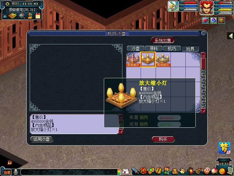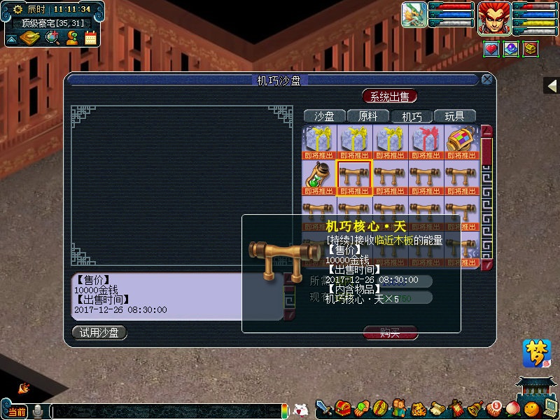 机巧沙盘 苟玥又带着他的神秘装置回来了,这次他对“机巧沙盘”进行了改进,更多酷炫的新功能等着你发现。 ·购买机巧沙盘: 1.高级庭院以上级别的庭院(包括高级庭院、大型庭院、仙玉庭院)直接与庭院场景中的NPC“苟玥”对话即可购买机巧沙盘。 2.所有玩家都可以与玩家之家中的管家进行对话,选择“机巧沙盘相关”子选项进行购买相关操作。 目前出售的机巧沙盘礼包和定价如下: