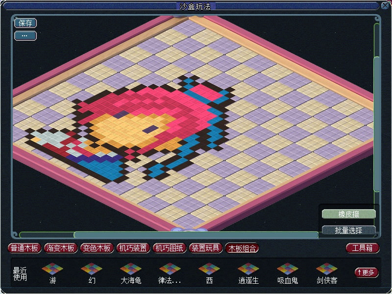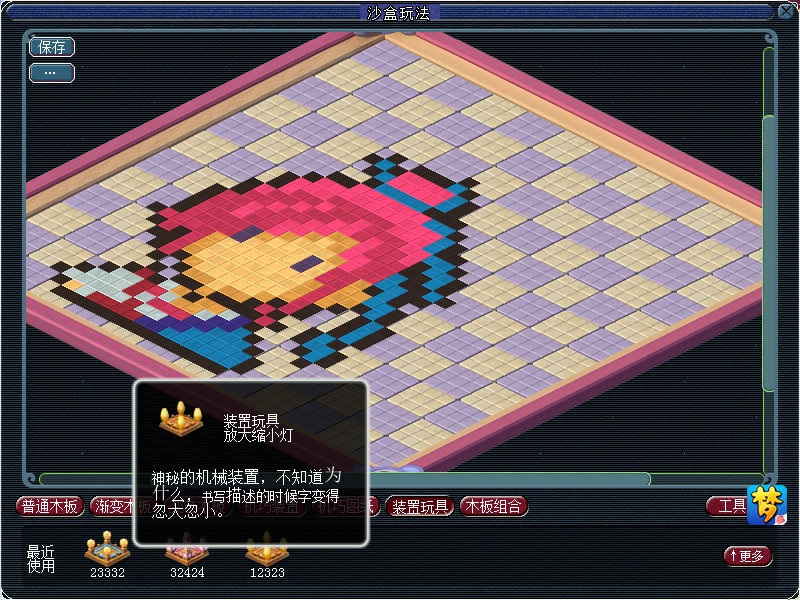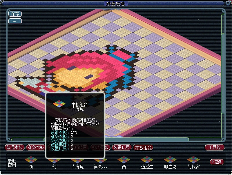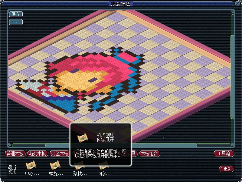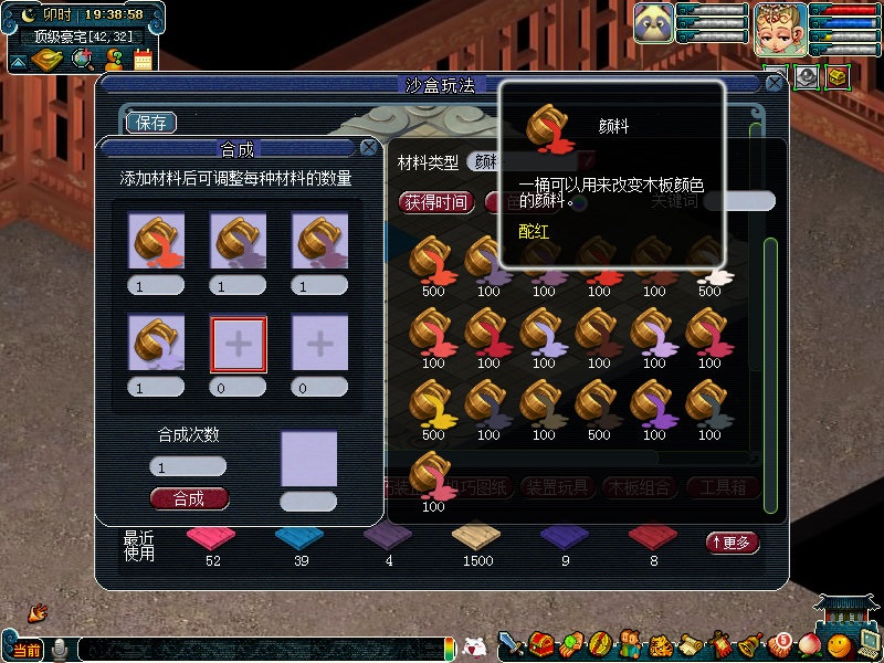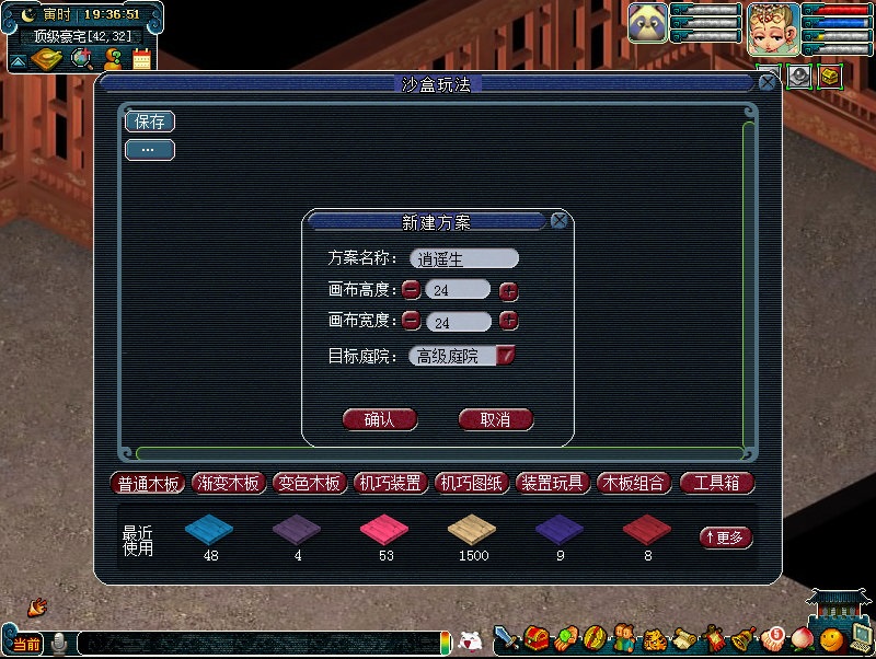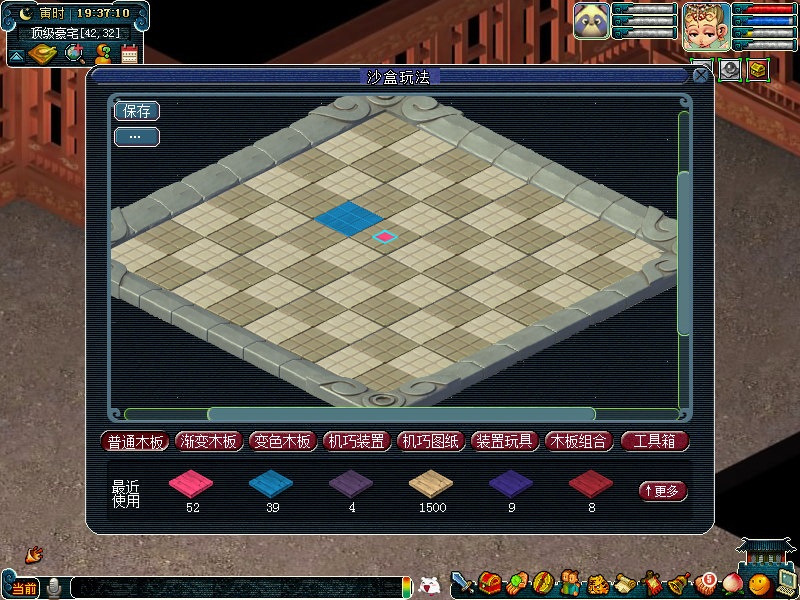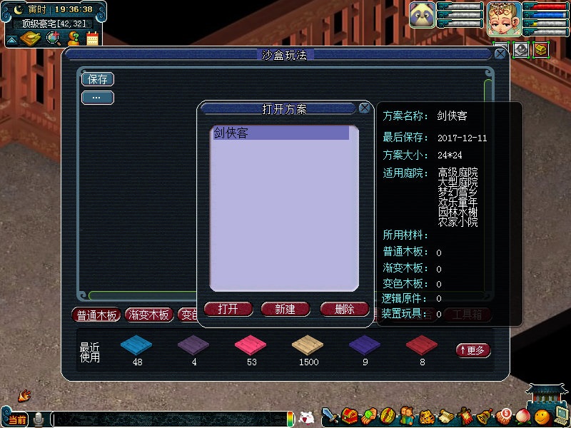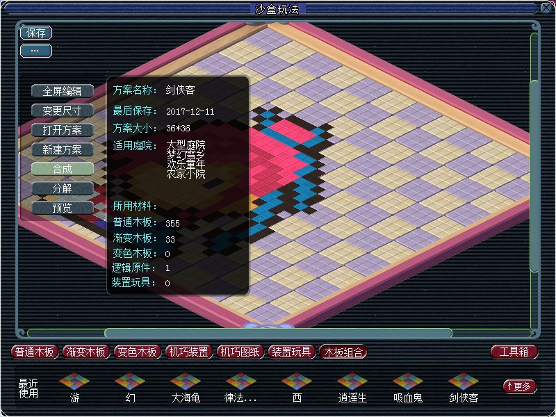 1.所有的机巧沙盘(包括从系统购买的沙盘)均可以进行个性修改和定制,具体操作请点击查看。 2.取出玩家之家中放置的“机巧沙盘”需要消耗“超级如意符”。 3.当玩家之家中存在“机巧沙盘”时,无法进行变更庭院等相关操作。 个性化机巧沙盘 苟玥不仅带来了一批全新的“机巧沙盘”,同时也带来了个性化沙盘的工具。勤劳聪慧的少侠们,赶紧去创造属于自己的个性沙盘吧。 个性化沙盘推荐按照以下几个步骤进行: 1.准备原材料 2.新建沙盘方案/调整原有沙盘 3.设计沙盘方案 4.合成和分解材料 5.取出并放置沙盘 ·准备原材料 定制自己的沙盘之前,我们需要提前准备好需要的材料。在购买沙盘的后3个分类中,我们可以购买到自定义沙盘所需要的材料: 原料—提供了各种各样的颜料供少侠选择,沙盘的颜色和造型完全由你做主。 机巧—提供了可以接受少侠能量,并传递给木板使其变化颜色的原件,使得你的沙盘变化万千。 玩具—提供了各种各样有不可思议效果的装置,给每个参观你沙盘的小伙伴们一个惊喜吧。 ·新建沙盘方案/调整原有沙盘 如果你想要对现在已有的沙盘进行调整,请参考以下步骤: 1.在苟玥处选择“调整我的设计方案”这个选项;向NPC给予你所要调整的沙盘。 2.在苟玥处“设计我的沙盘”处点击打开对应的方案进行编辑。 如果你想要新建一个沙盘方案,请参考一下步骤: 1.在苟玥处“设计我的沙盘”处点击打开界面。 2.打开界面后,点击“新建”按钮,输入你想要的沙盘名字和设定大小。(名字和大小之后可以在“变更尺寸”功能中修改) ·合成和分解材料 进行“设计沙盘方案”时你一定会发现很多材料并不能通过购买获得,你可以在编辑器中通过“合成”功能来获得,同时你不需要的材料也可以通过分解来获得更底层的材料。 苟玥偷偷的泄露了一些合成的秘诀: 颜料+颜料=颜料 颜料+普通木板=普通木板 普通木板+延迟核心+变色核心=渐变木板 颜料+普通木板+延迟核心+变色核心=变色木板 机巧核心·天+机巧核心·地+机巧核心·人=机巧装置
