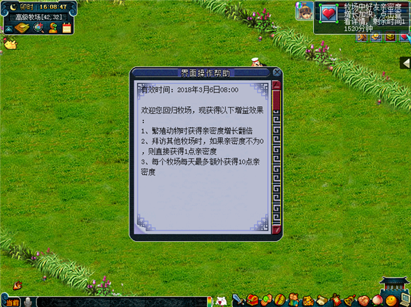 注意:道具过期时间为2018年3月6日08:00,请注意及时使用。 贺岁好礼来 活动时间 外测时间:2018年2月1日12:00 - 2018年2月2日12:00 全服时间:2018年2月20日12:00 - 2018年3月6日08:00 活动内容 担心春节期间无暇繁殖动物导致断窝吗?来放心兑换宝宝窝吧! 活动期间 1、刷新积分兑换列表只需150积分,刷新列表时出现珍稀宝宝窝的概率提高; 2、所有宝宝窝的兑换上限提升至每日5个。但每次兑换所需积分增加10%。 故友喜重逢 活动时间 外测时间:2018年2月1日12:00 - 2018年2月2日12:00 全服时间:2018年2月20日12:00 - 2018年3月6日08:00 活动内容 啊哦,假期忙着走亲访友,却没时间拜访牧场里的好友啦。不用担心,节后回流,牧场亲密度增长加倍,好友再也不会和我破裂啦。 活动对象: 1、玩家牧场为高级牧场/专精牧场 2、玩家和配偶5天内均没有拜访任何其他玩家的牧场 活动内容: 1、活动期间,满足条件的玩家在拜访繁殖动物操作中获得亲密度增长翻倍 2、活动期间,满足条件的玩家拜访其他牧场的时候,如果亲密度不为0,则直接获得1点亲密度(和同一个牧场每天只能获得1次) 3、每个牧场每天最多额外获得总计10点亲密度