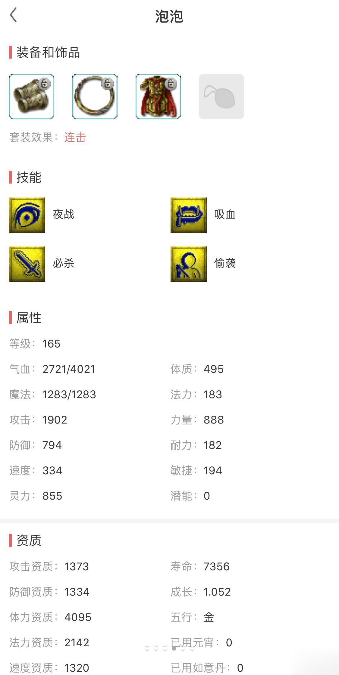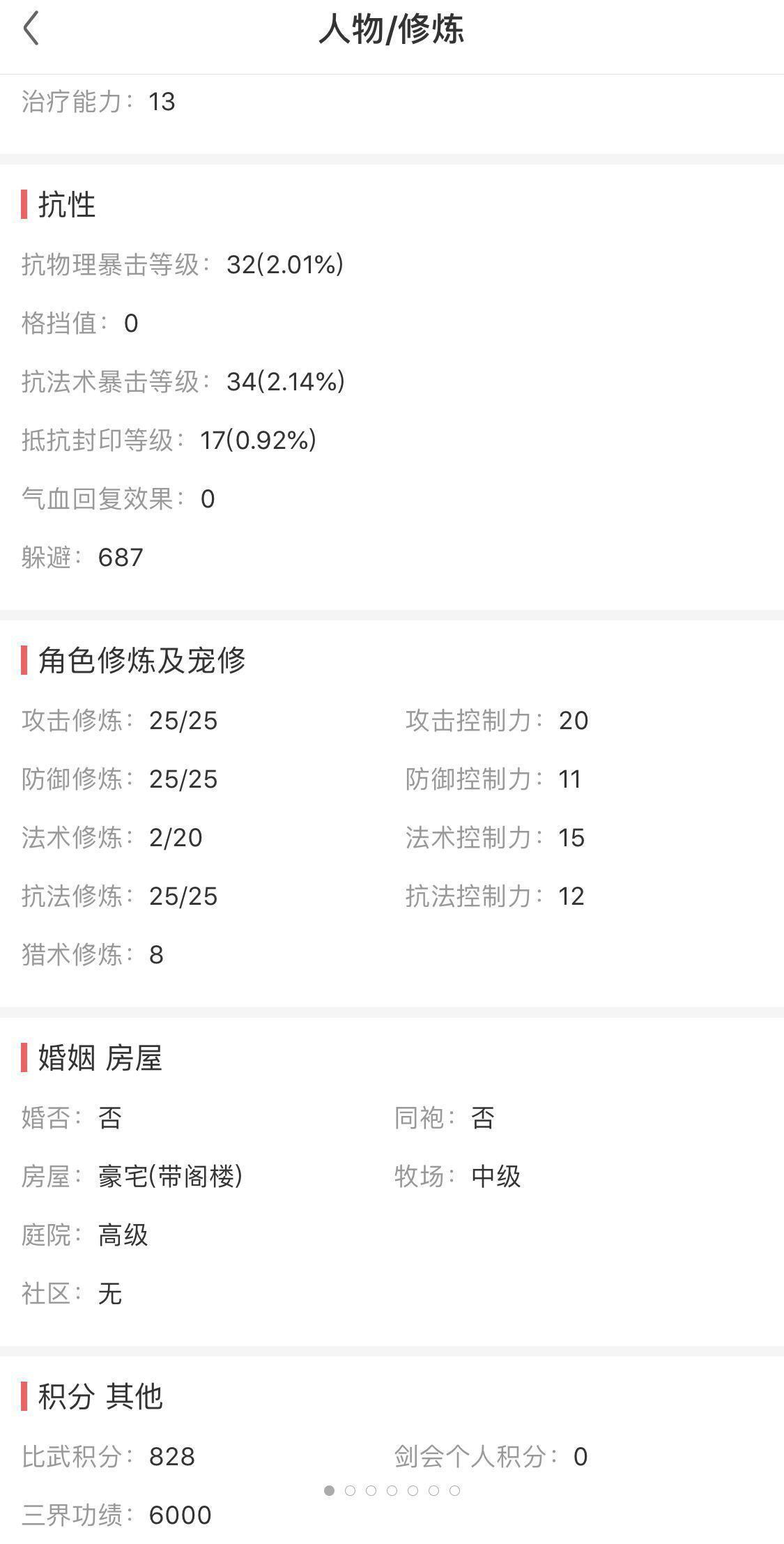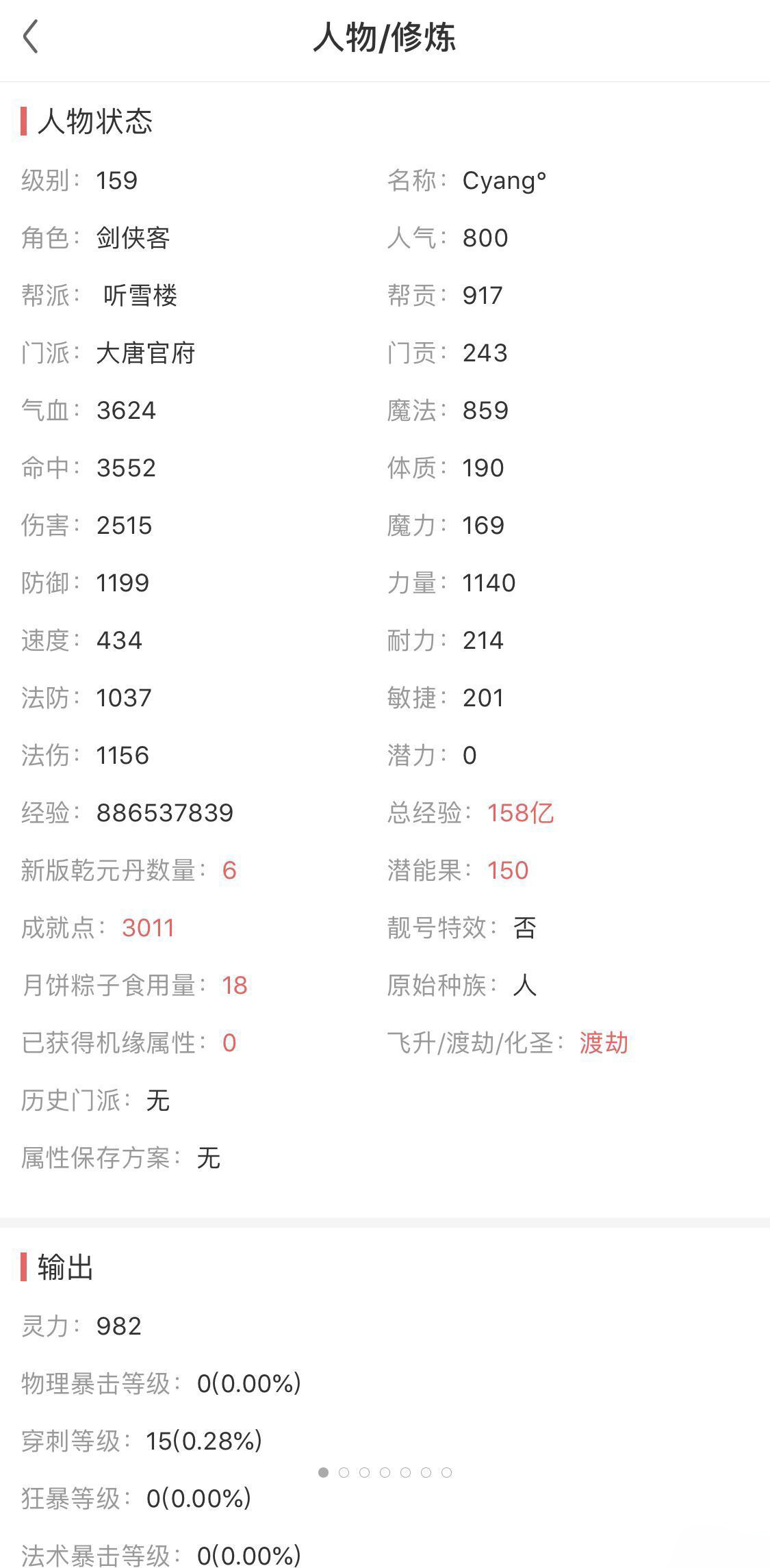 近日,一位玩家在藏宝阁里面花了6500块买了个159级的大唐官府,角色中有什么亮点呢?我们来看下吧! 首先是6500块的付款图,买家已经取走。 ![]() 游戏截图 面板属性,3624的气血,气血属性肯定是低了,2515的伤害,伤害还算可以。1199的防御属性,不算高,勉强够用?总经验是158亿,经验并不算多,150的满潜能果加上月饼加机缘总共是18个。 ![]() 游戏截图 修炼方面,人物主要三修全满,猎术有8点。召唤兽修炼,攻击20,防御11,法术15,抗法12,总体感觉还可以,单凭这个修炼,这个角色起码得6000块左右了吧? ![]() 游戏截图 师门技能,4本164级,一本150级,一本140级,神兵鉴赏是100级,师门技能也算小有亮点吧,毕竟满了4个。 ![]() 游戏截图 80级的腰带,5锻黑宝石,43防御和160的气血,非人造的腰带,属性并不算太好。破血狂攻的特技,用还是肯定可以用的。 ![]() 游戏截图 70级的项链,7锻舍利子,开了3孔,同样是破血狂攻的特技,两个特技重复了,可以考虑换一个。 ![]() 游戏截图 80级的鞋子,5锻黑宝石,38的防御和31的敏捷,属性不强,有永不磨损的特效,不过整体感觉不值什么钱。 ![]() 游戏截图 130级的铠甲,6锻月亮石,291的防御,体质加了13点,耐力加了24点,双加是可以用的,至于防御属性并不算高。只开了1孔,算是件任务装备吧。 ![]() 游戏截图 110级的头盔,10锻混打宝石,熔炼后65的防御,开了4孔,附加弱点击破的特技,这个头盔应该能值点钱,毕竟是高锻。 ![]() 游戏截图 140级的剑,5锻混打宝石,命中610点,伤害544点,单加了19点耐力,总伤害是744点,伤害属性没什么亮点。 ![]() 游戏截图 80级的戒指,主属性加了17点防御,下排是速度加伤害,2锻星辉石。 ![]() 游戏截图 80级的耳饰,主属性法术防御,下排是伤害加穿刺等级,2锻星辉石。 ![]() 游戏截图 角色里的一只泡泡,认证了地狱烈火,技能中有三本蓝法书加上须弥真言,面板属性3000出头的气血,1200出头的灵力。 ![]() 游戏截图 又是一只泡泡,4本蓝书技能,带的是连击套装,成长低了,但是凑合可以用。 ![]() 游戏截图 一只血宠雾中仙,没有什么特别的亮点。 ![]() 游戏截图 角色里带了一个化生寺的小孩。 叶子猪梦幻西游玩家群:1群 325703083 (2000人),2群: 330102322 (千人);3群: 424986787 (游戏疑难解答);4群: 330518295 (商人物价);5群: 1063086037 (疑难解答);6群: 1045753197 (春心萌动);7群: 787195090 (活跃互动);8群: 720665628 (全民PK) [编辑:小麦]