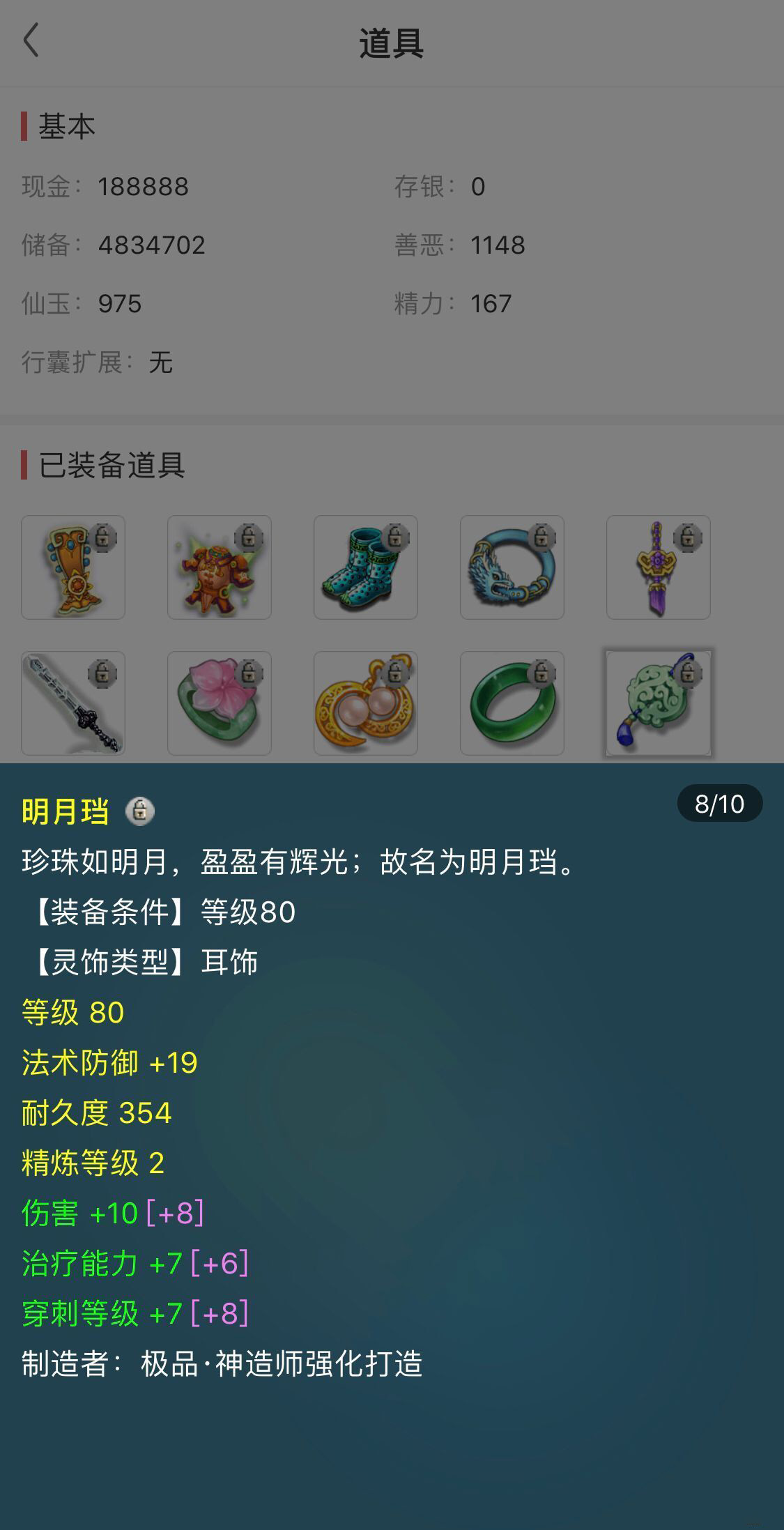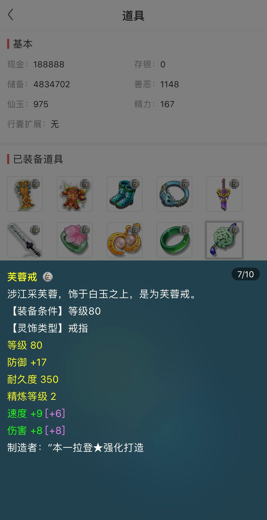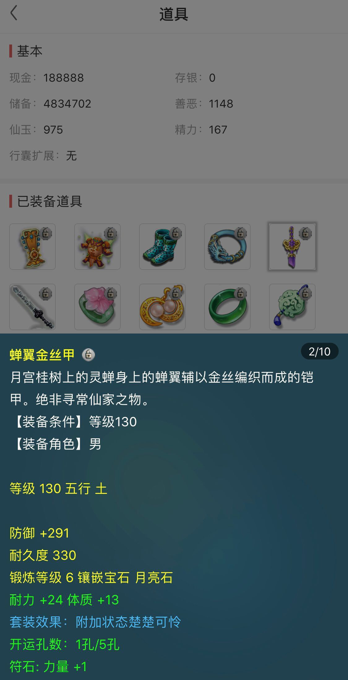 近日,一位玩家在藏宝阁里面花了6500块买了个159级的大唐官府,角色中有什么亮点呢?我们来看下吧! 首先是6500块的付款图,买家已经取走。 ![]() 游戏截图 面板属性,3624的气血,气血属性肯定是低了,2515的伤害,伤害还算可以。1199的防御属性,不算高,勉强够用?总经验是158亿,经验并不算多,150的满潜能果加上月饼加机缘总共是18个。 ![]() 游戏截图 修炼方面,人物主要三修全满,猎术有8点。召唤兽修炼,攻击20,防御11,法术15,抗法12,总体感觉还可以,单凭这个修炼,这个角色起码得6000块左右了吧? ![]() 游戏截图 师门技能,4本164级,一本150级,一本140级,神兵鉴赏是100级,师门技能也算小有亮点吧,毕竟满了4个。 ![]() 游戏截图 80级的腰带,5锻黑宝石,43防御和160的气血,非人造的腰带,属性并不算太好。破血狂攻的特技,用还是肯定可以用的。 ![]() 游戏截图 70级的项链,7锻舍利子,开了3孔,同样是破血狂攻的特技,两个特技重复了,可以考虑换一个。 ![]() 游戏截图 80级的鞋子,5锻黑宝石,38的防御和31的敏捷,属性不强,有永不磨损的特效,不过整体感觉不值什么钱。 ![]() 游戏截图 130级的铠甲,6锻月亮石,291的防御,体质加了13点,耐力加了24点,双加是可以用的,至于防御属性并不算高。只开了1孔,算是件任务装备吧。 ![]() 游戏截图 110级的头盔,10锻混打宝石,熔炼后65的防御,开了4孔,附加弱点击破的特技,这个头盔应该能值点钱,毕竟是高锻。 ![]() 游戏截图 140级的剑,5锻混打宝石,命中610点,伤害544点,单加了19点耐力,总伤害是744点,伤害属性没什么亮点。 ![]() 游戏截图 80级的戒指,主属性加了17点防御,下排是速度加伤害,2锻星辉石。 ![]() 游戏截图 80级的耳饰,主属性法术防御,下排是伤害加穿刺等级,2锻星辉石。 ![]() 游戏截图 角色里的一只泡泡,认证了地狱烈火,技能中有三本蓝法书加上须弥真言,面板属性3000出头的气血,1200出头的灵力。 ![]() 游戏截图 又是一只泡泡,4本蓝书技能,带的是连击套装,成长低了,但是凑合可以用。 ![]() 游戏截图 一只血宠雾中仙,没有什么特别的亮点。 ![]() 游戏截图 角色里带了一个化生寺的小孩。 叶子猪梦幻西游玩家群:1群 325703083 (2000人),2群: 330102322 (千人);3群: 424986787 (游戏疑难解答);4群: 330518295 (商人物价);5群: 1063086037 (疑难解答);6群: 1045753197 (春心萌动);7群: 787195090 (活跃互动);8群: 720665628 (全民PK) [编辑:小麦]