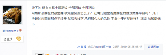 不过也有玩家看到线下交易,称:“线下所有交易全部活该,这么安全的藏宝阁,收点服务费怎么了?还有比藏宝阁更安全的游戏交易平台吗?不贪小便宜也不会这样。” (说实在的,不是买家贪小便宜,而是太好人了,主动帮别人省手续费,结果别人不记情,黑了3000元找回宝宝!诚信啊,诚信啊!) ![]()