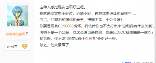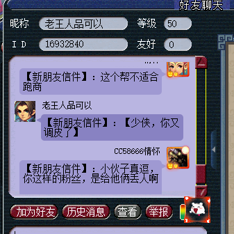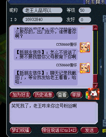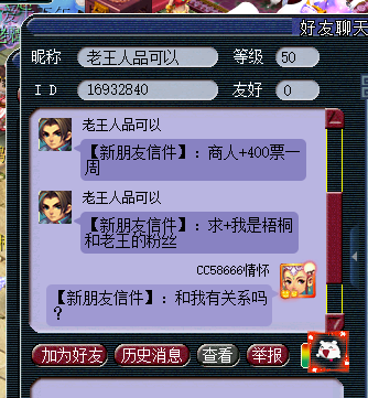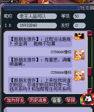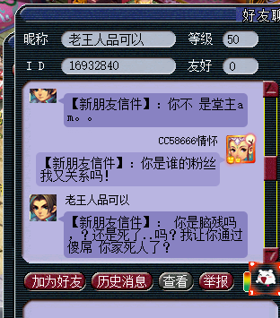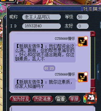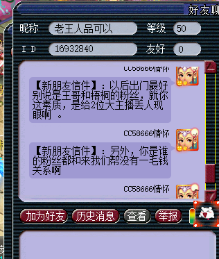 每个游戏都有主播,他们有属于自己的粉丝。粉丝一般都拥戴自己的主播,不过也有一些素质比较低的粉丝借着自家主播的名气耀武扬威。近日,有位主播爆料,自己遇到了一位借着其他主播名气的“奇葩”粉丝强行加帮。究竟发生了什么事情?让我们一起来看看。 主播向我们叙述了事情的经过:“今天刚下播,整理东西后准备下号睡觉。突然有人加好友,问自己在不在?说要加入帮派跑商,还说是老王和梧桐的粉丝,给我整懵逼了。”本想好心好意的说帮派的资金是满的,跑商不划算,结果对方直接开喷。 主播贴出了对话的截图。 对方表示;“商人+400票一周,求+我是梧桐和老王的粉丝。” 这时主播一脸懵逼:“这和我有关系吗?” 结果对方直接来了一句:“你不是堂主吗?” 主播并不想理会他,最后还是回了句:“你是谁的粉丝和我有关系吗?” 结果对方直接开喷:“你是脑残吗?我让你通过你就得通过。”这嘴未免太臭了吧。 主播称:“这个帮没法跑商,资金是满的,跑商不划算。你确直接满嘴喷粪,上来给我说是谁的粉丝,和我有一毛钱的关系吗?这和加帮有任何关系吗?” 不过对方仍旧还是开口成脏,系统直接屏蔽了。 主播称:“以后出门最好别说是网格和梧桐的粉丝,就你这素质,是给两位大主播丢人。出门在外,到底谁惯着你了?” 看到这,就有玩家表示:“这种人感觉现实也不好过吧?而且他都不知道你和老王、梧桐不是一个公会的吗?总之,他太暴躁了。” 也有玩家称:“楼主取的这个名字,人家肯定认为你是直播圈的,套个近乎,给个方便,对方的逻辑没问题,楼主的逻辑有问题。” 不知道各位网友如何看这件事情呢? 叶子猪梦幻西游玩家群:1群 325703083 (2000人),2群: 330102322 (千人);3群: 424986787 (游戏疑难解答);4群: 330518295 (商人物价);5群: 1063086037 (疑难解答);6群: 1045753197 (春心萌动);7群: 787195090 (活跃互动);8群: 720665628 (全民PK) [编辑:喵刃]