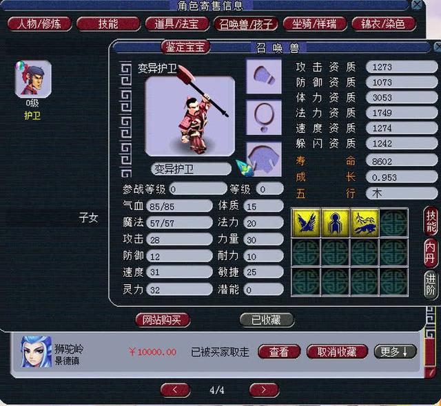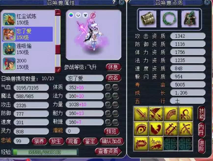 自梦幻西游诞生以来,人气最高的召唤兽就是人型宠。时至今日,这个群体已经太过庞大,小编整理过后,将其分解为人形篇、精怪篇、神女篇和护法篇四个篇幅来逐一阐述。 首先,先看人形篇。 一、皇宫护卫 梦幻西游中唯一的可以花钱买到的召唤兽,皇宫门口找到护卫首领,花2000块钱就能买一只护卫跟你行走江湖,怎么样,很帅气吧? 梦幻西游召唤兽护卫 随着越来越多的人喜欢标新立异,追求个性。无论是锦衣祥瑞,还是彩饰和召唤兽,玩家都要追求最特别的。那么,什么召唤兽才是梦幻西游里真正独一无二的呢? 是下面这只神兽级的护卫吗? 个性护卫 善恶力劈,资质成长爆表,够不够稀有? 不,还不够! 因为这种宠物虽然厉害,但是只要舍得下血本,还是能打造出来的,而且在服战中也是会经常出现,只论稀有程度的话,真的不够! 其实,全服最稀有的召唤兽是那只红色的变异护卫。 梦幻精灵是这样描述的:目前除了向其他玩家购买之外,已无法获得; 百度百科是这样描述的:变异护卫,网易公司所开发的《梦幻西游2》中最稀有的召唤兽,全服不超三只。某服战老板出千万天价却找不到货,目前处于有价无市状态。目前,游戏中的一只变异护卫由2019年春心萌动男生版冠军“看山”收藏,传闻中要给护卫上须弥真言兽决。 绝版变异护卫 关于变异护卫的由来,民间一共有传出了两种说法,第一种说法就是在皇宫当中购买护卫,买着买着就可能会无意当中购买到一只变异的护卫,但是这个说法有点太过于牵强。第二种说法则是放到动物园当中,有一定的概率会出现,但是因为版本的不断更新,现在这样的变异护卫已经绝版。 二、律法女娲 2004年第二部资料片《神鬼玄机》发布,新召唤兽灵符女娲、律法女娲和净瓶女娲三位御姐强势登场。 律法女娲可以说统治了一个年代,在资料片刚出来的时候,最火的就是律法女娲了,其独一无二的善恶有报成为当时最牛逼的技能,没有之一。当时PK的时候清一色律法,谁的律法先出手就能秒掉对方的律法,无敌一样的存在。 律法女娲 如今只有一个善恶技能的律法已经被遗忘了,基本上都是用来合宠,善恶有报+高级必杀+高级驱鬼打鬼魂生物的话,理论上可以出现8倍的伤害,极为恐怖。 值得一提的是,律法女娲不仅技能高效,长相恬美,进阶造型也是那么英武帅气,这个角色可以说是非常成功的。 进阶律法女娲 三、净瓶女娲 净瓶女娲的出现打破了芙蓉对于打书的垄断,因为芙蓉最高成长是3.75,而净瓶可以达到3.81。当然了,当时成长率这个东西是不显示的,需要用专门的计算器算出来。 净瓶女娲 净瓶女娲是必须打书才能用的,因为她的技能是法系,但是资质和成长非常高,很适合做攻宠,当年的主流是连击配吸血任务型,也有打隐身必杀做隐攻PK的。可惜净瓶女娲太难出,技能格子也少,没办法像律法女娲那样一统江湖。 下面让我们来做一件有趣的事: 打开梦幻藏宝阁,点到召唤兽,锁定变异净瓶女娲和死亡召唤技能两个选项,点搜索,OK,死亡净瓶出来了! 自带死亡召唤的变异净瓶女娲 相传远古时期的净瓶女娲是带死亡的,但是小编努力回忆当时的情形,只记得净瓶有一个上古灵符,并不记得有死亡召唤啊,难道是某位老板喝高了,将千亿兽决打到一只垃圾宠身上? 于是,小编在网上大量的搜索,各大论坛确实有这个说法,说是在变异宠物不能打书的年代,死亡净瓶就存在了,那就很有可能是在版本初期净瓶确实有过这个技能的,也不知道是不是策划搞错了,总之,存在了很短的一段时间后就被改掉了,因此遗留下来的死亡净瓶非常稀少。 至于事实是否如此,早已无法查证,除非让当时的策划亲自出来解释一波。 四、夜罗刹 一笑倾城,再笑倾国。 夜罗刹是天生的舞者,当年一经问世,便引起玩家们的高度重视。 小西天地图开放后,最热门的两只召唤兽,大力金刚和夜罗刹,他们两位有一个共同的特点,就是各自带一个专属的神秘技能。 倾国倾城夜罗刹 夜舞倾城,如今我们都知道,这是一个固定伤害类的技能,但是,最初这个技能是没有描述的,当年有很多玩家做了各种测试,仍旧没办法得出具体的伤害计算公式。 与大力金刚的霸气外漏不同,夜罗刹的高颜值以及灵动飘逸的造型尤其惹人喜爱,在当年,能够带上一只夜罗刹成为许多玩家完成飞升的动力,时至今日,夜舞倾城虽已不再神秘,但是夜罗刹仍是无数老玩家心中的暗夜女王。 进阶夜罗刹 五、修罗傀儡鬼 修罗傀儡鬼携带等级为155级,并不需要渡劫,技能却非常实用,高级必杀、高级夜战,必带技能嗜血追击很适合单人任务,只要成功打一本吸血上去,其实力就已经超过了大部分的四蓝书任务宠。 甚至不需要打书,洗出来满技能傀儡鬼,带个吸血套就可以用,性价比非常高,也是155未渡劫玩家最喜欢的暴力攻宠。修罗傀儡鬼刚出来的时候,非常多玩家喜欢洗4技能或者5技能变异来打书,代替极难出现的变异人形狂豹。 修罗傀儡鬼 六、人形狂豹 一般情况下,狂豹是以兽形出现的,当兽形狂豹气血降低至10%的时候,则有可能变身为人形狂豹。 人形狂豹需要渡劫后才可以携带,天生资质高、技能多且实用,因此,很快就受到玩家们的追捧,一举在高等级玩家心中取代了吸血鬼的地位。 当时有一种观点,说傀儡鬼5技能完爆狂豹,狂豹的时代会被傀儡鬼终结,因为狂豹没有高必是硬伤,何况傀儡鬼的成长还高了0.1,功资低了一点没什么,元宵可以
