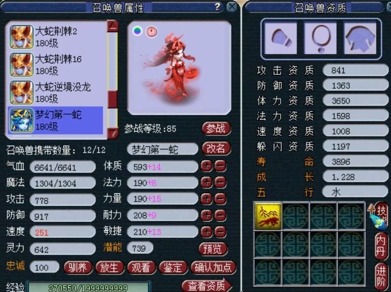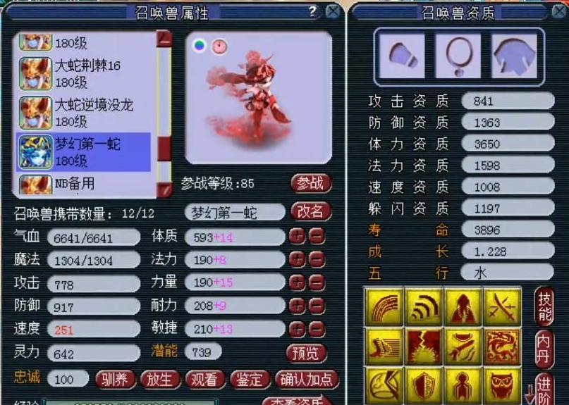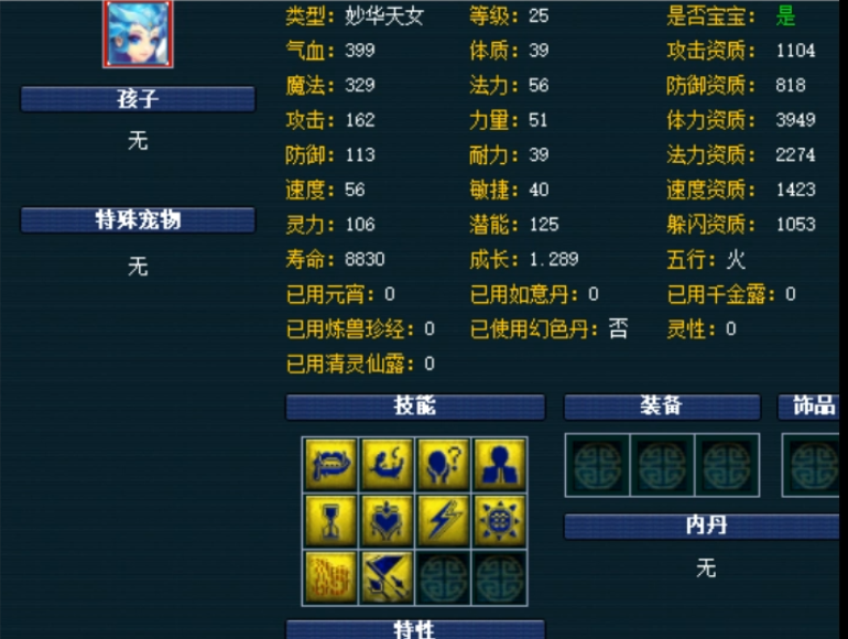 三、惊现10技能妙华天女 有玩家小号合出了10技能妙华天女,因为等级不够不能上藏宝阁,索性直接连号一起出售。妙华天女的攻资和防资有点低,成长和速度都不错,养两年没问题。 10技能的妙华天女,大概是想合凝光炼彩蛇卵,结果出了妙华天女。10技能的妙华天女比起凝光炼彩蛇卵要强很多,毕竟本身没必带技能,原地物理攻击,非常多玩家喜欢。