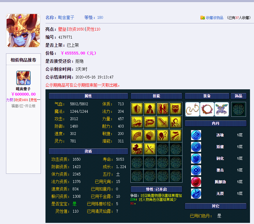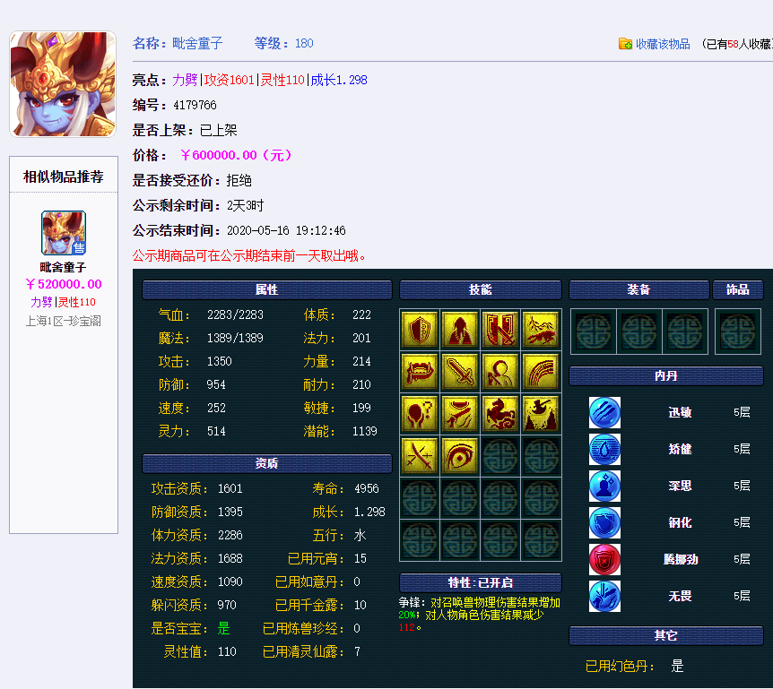 众所周知,梦幻西游这款游戏当中有着无数的神豪,神豪们在梦幻中的动向都在影响着自己的团队,自己的服务器,甚至影响着梦幻的大经济,今天给大家带来的主播,神豪以及PK团队的内容有:1.念总运出齐云楼神马童子;2.梧桐更新化生寺灵饰;给大家带来的玩家新鲜事有:3.新出9技能双特殊胚子;4.新出150无级别男衣。 一、念总运出齐云楼神马童子 最近齐云楼的藏宝阁上出现了两只力劈神马童子,其实了解齐云楼的玩家都应该知道,这两只神马童子的拥有者是念总。 念总前段时间刚刚加盟钓鱼岛担任传统法系的位置,念总号上原本就有一只神马壁垒力劈,如果这两只童子运到鱼岛,估计念总就是号上神马童子最多的法系了吧。 二、梧桐更新化生寺灵饰 前段时间铁柱将梧桐的化生寺跟珍宝阁涛哥的化生寺对比了一下,属性确实相差很多。 不过梧桐并没有因此放弃,梧桐则是选择了默默更新,又更新了一个10锻星辉石的双速度一治疗的戒指,还有一个手镯。大家也都知道梧桐跟其他顶级服战老板还是有些差距的,但是希望梧桐能够一步步的成长起来。 三、新出9技能双特殊胚子 最近大家都在搞双特殊的胚子,铁柱今天又看见一位玩家合出了一只9技能的须弥出其不意双特殊画魂。 这样的胚子现在非常受欢迎,而且神威跟天科的玩家非常多,市场也很大,不少老板都在更新这种宝宝,所以说,这样的胚子还是非常值钱的! 恭喜这位玩家成功当托啊! 四、新出150无级别男衣 铁柱感觉最近狗托实在是有点多,又有一位玩家鉴定出了一件150级的无级别男衣,初防246,单加敏捷22。 属性在稍微熔炼一下, 又是一件极品无级别衣服。虽然铁柱每天都很羡慕这些能当狗托的玩家,但是仔细想想,铁柱好像也没钱鉴定150级的军火,扎心了! 【叶子猪www.yzz.cn整理稿件。】 叶子猪梦幻西游玩家群:1群 325703083 (2000人),2群: 330102322 (千人);3群: 424986787 (游戏疑难解答);4群: 330518295 (商人物价);5群: 1063086037 (疑难解答);6群: 1045753197 (春心萌动);7群: 787195090 (活跃互动);8群: 720665628 (全民PK) [编辑:铁柱]