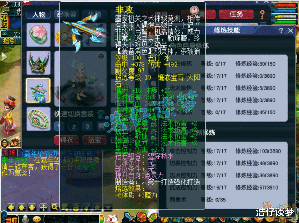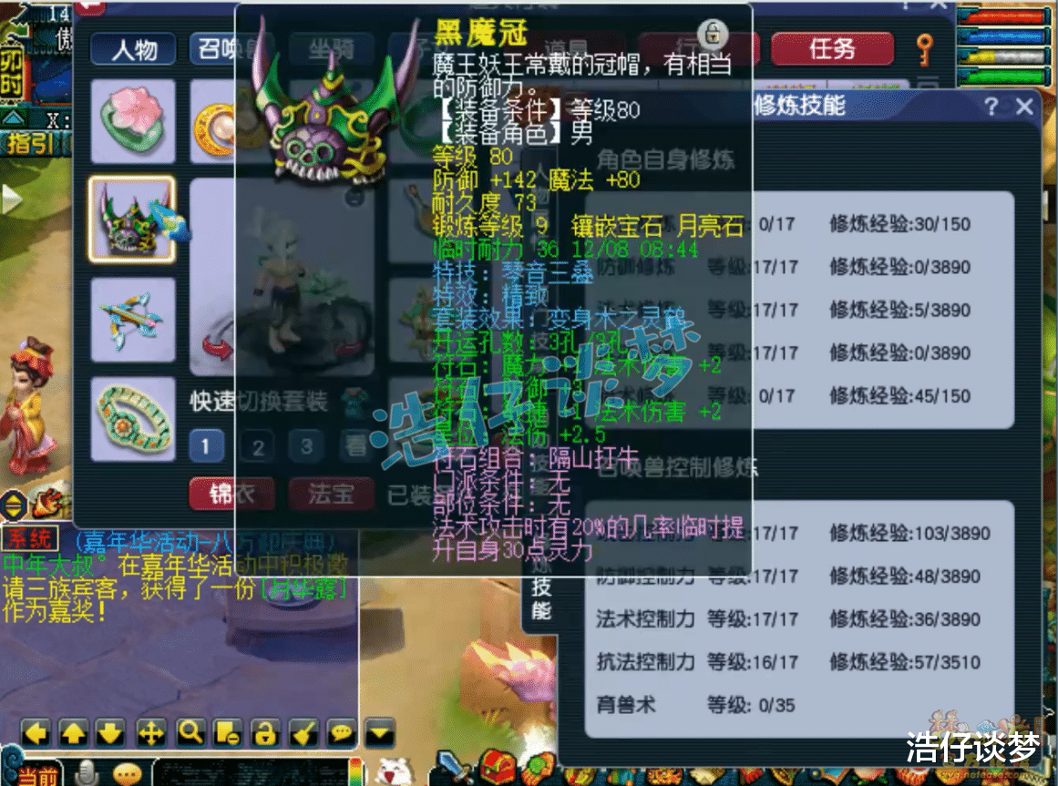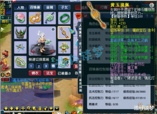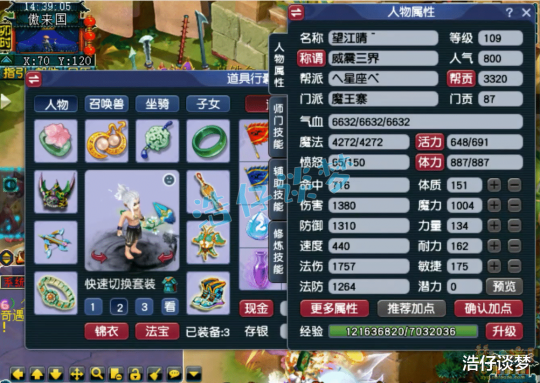Hello大家好,我是浩仔!关注浩仔,每天给你带来最新梦幻西游游戏资讯!以下点评仅代表个人意见,不代表官方或平台立场。 自从魔王寨的风火妖王经脉上线后,转魔王寨的玩家越来越多了!在我看来,主要是风火妖王经脉的“∞”突破了法伤上限,而且69级就可以点秘传飞砂走石这一丹,再垃圾的魔王寨,也有机会体验暴力输出的乐趣!当然也有魔王寨玩家喜欢感知经脉的,牛劲不但能增加法伤,还能获得感知能力,不需要再依赖幽冥鬼眼了,清隐身宠很快!本篇文章浩仔要给大家带来的,就是一个109级魔王寨的展示,他应该算是一个很不错的天地号,一起来欣赏一下吧! 109级魔王寨打符之后的面板属性,1757的法伤,对于109级法系来说已经很不错了,刷各种难度任务都够用了! 80级带琴音三叠的精致灵鹤套男头,打了9锻月亮石! 100级灵鹤套项链,初灵170非常不错,打了10锻舍利子! 100级灵鹤套铠甲,熔炼后加25魔、减2耐,打了10锻舍利子! 100级带光辉之甲的灵鹤套鞋子,打了9锻黑宝石! 100级带晶清诀的灵鹤套腰带,打了10锻光芒石,没有愤怒特效,PK中还是比较难放出晶清诀特技的! 100级高伤武器,熔炼后魔体双加35,打了10锻太阳石! 戒指下排双法伤一伤害,耳饰下排双法伤,佩饰下排双气血一防御,手镯下排双防御一格挡,特效都是4级血气方刚! 7技能高连血攻画魂,一只攻宠各种任务都能用了! 7技能须弥狐不归,也是偏向于任务的法宠,还有两只血宠和壁垒我没有截图!好了,这个109级魔王寨展示完毕,虽然不是标准的百套装备加身,但是属性不比百套号差,最关键的是他带了3个特技,比很多百套号操作灵活!这种号每天打好符,约上几个好友,绝对是杀天罡地煞的一把好手!偶尔还能体验一下PK,非常舒服! 叶子猪梦幻西游玩家群:1群 325703083 (2000人),2群: 330102322 (千人);3群: 424986787 (游戏疑难解答);4群: 330518295 (商人物价);5群: 1063086037 (疑难解答);6群: 1045753197 (春心萌动);7群: 787195090 (活跃互动);8群: 720665628 (全民PK)
