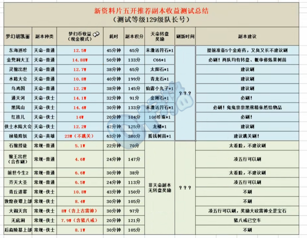 本周,《梦幻西游》电脑版进行维护后,除了上线2024首部资料片,还推出了全新副本模式。近日,一名测试服五开大神对此展开全面收益测试,哪些副本优先级最高?下面就让小生带大家一探究竟。 一、新副本模式五开收益&推荐表 副本改版后,多个副本的固定奖励被取消。不过,新引入了天命类型的副本,会不定期轮换,按照系统指令完成副本,会得到转盘奖励,有大神根据刷任务时长,总结了多个常规副本的收益表。由图可得,五开玩家想要收益最大化,优先挑选金钱多时间少的天命副本,例如红孩儿、黑风山等,以前高收益的秘境、大闹等副本要根据自身时间抉择。多开玩家能够灵活变通,还是可以赚一点零花钱的。 二、老王喜提大光无级别 昨天,老王接到了粉丝5亿梦幻币提升角色实力的资源,为此特意挑选一些武器来鉴定。结果仅用3亿梦幻币,就炸出一根130无级别法杖,它的属性爆了不少,关键是附加了敏魔双加49属性,整体来看属于X9固伤法系双用的任务小神器。 花费几千成本就赚了几万块,老王手气确实逆天,希望他在开年首个无级别之夜能够再接再厉。 三、12+8炼妖冲刺翻页诸天心猿 新资料片在测试区上线后,引发了一波炼妖热潮。有位大佬用一只8技能诸天心猿,回炉高资质的12技能童子,不管出主宠还是副宠,只要炸出翻页成就,将有机会得到炸裂的诸天胚子。 结果事与愿违,只得到12技能童子,还未能继承特殊技能。 只好找到5技能诸天心猿来套娃,再次向极品胚子发起冲刺。 结果终于圆梦“物理须弥”,可惜的是技能数量才9个,继续回炉也不太合适,及时收手尤为机智。 四、单开玩家逛场景收获巨款 今天,【如意岛】有一单开少侠刷完师门后,喜欢到处逛场景,尝试捉捉变异或稀有宠。少侠来到海底迷宫时,不一会儿就偶遇了变异虾兵,它属于跑环市场的热门“海鲜”。 少侠手握千万梦幻币巨款,却还是意犹未尽,于是跑到东界探险。结果财神爷继续附身,又抓到了不带须弥的持国宝宝,不过对它用上月华露后,其触发灵佑时领悟了须弥技能,相当于再次喜提千万大奖了。 不知爱挂场景的玩家们,最近有没令人深刻的经历呢?欢迎你们到评论区留言~今天的新鲜事到此结束,我们下期再见。 叶子猪梦幻西游玩家群:1群 325703083 (2000人),2群: 330102322 (千人);3群: 424986787 (游戏疑难解答);4群: 330518295 (商人物价);5群: 1063086037 (疑难解答);6群: 1045753197 (春心萌动);7群: 787195090 (活跃互动);8群: 720665628 (全民PK)