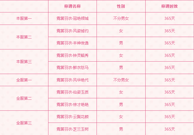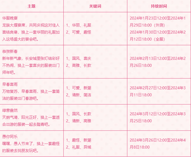 霓裳羽衣,幻彩斑斓。2024年新春华服大赛开始啦。每周一个新主题,选择符合主题的锦衣参赛,每周进行单服和全服的评选活动,名列前茅的玩家将获得丰厚奖励!积极参与活动投票也有几率获得物品奖励噢! 活动时间 测试时间:2024年1月23日 12:00 至 2024年1月30日 12:00 全服时间:2024年1月30日 12:00 至 2024年4月8日 18:00 报名参赛方式 点击主界面左上角华服大赛按钮,打开华服大赛主界面即可开始搭配外观,参与比赛。 还可以前往长安城(202,101)找到霓裳仙子,选择我来参加华服大赛即可开始参赛。 本次活动一共5期主题: 玩家需要选择符合对应关键词的外观穿着,才能保存参赛衣柜成功报名。 如果不清楚本期对应关键词外观是哪些,可以看看排行榜上其他玩家的搭配参考哦。 如果自己的锦衣数量不够多也不用担心,本次华服大赛设置了系统配饰栏,提供海量外观,让各位少侠随意挑选搭配,但是上衣/下衣部件一定要穿戴属于自己的外观才能参加比赛哦。 本次比赛还加入了祥瑞维度的评选,可以选择你心爱的祥瑞搭配参赛。 使用系统配件的搭配达到一定的分数时,还能获得以折扣价格购买本套配件的机会! 成功报名并保存参赛衣柜后,可以制作宣传单发放给游戏好友拉票。 (制作宣传单) 特别说明 1、保存衣柜时,将会根据符合主题关键词的层级和数量给予衣柜基础分。当前主题的总分数=当前主题所有参赛衣柜的基础分相加+得票数。所以为了获得更高的分数,除了积极拉票外,尽量增加符合主题的衣柜数量也是一个好办法哦。 2、主题活动期间,玩家随时可以通过浏览衣柜按钮进入我的衣柜,对已经保存的参赛衣柜进行删除操作。一旦删除衣柜,被删除衣柜对应的基础分数和购买优惠将不会保留。其他参赛衣柜不受影响。 参与评选方式 投票方式1: 前往长安城(210,103)找到霓裳仙子,选择我想当评委,即可开始投票。 (评委投票) 将会随机给予2个玩家的搭配衣柜进行对比投票,少侠可以为你喜欢的那位投上一票。如果都不喜欢也没关系,点击下一组可以切换到下一组搭配。 投票方式2: 打开华服大赛主界面后,点击排行榜,就可以为排行榜上的玩家投票,也可以通过服务器和ID搜索你感兴趣的玩家进行投票操作。 (排行榜投票)