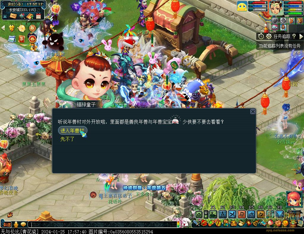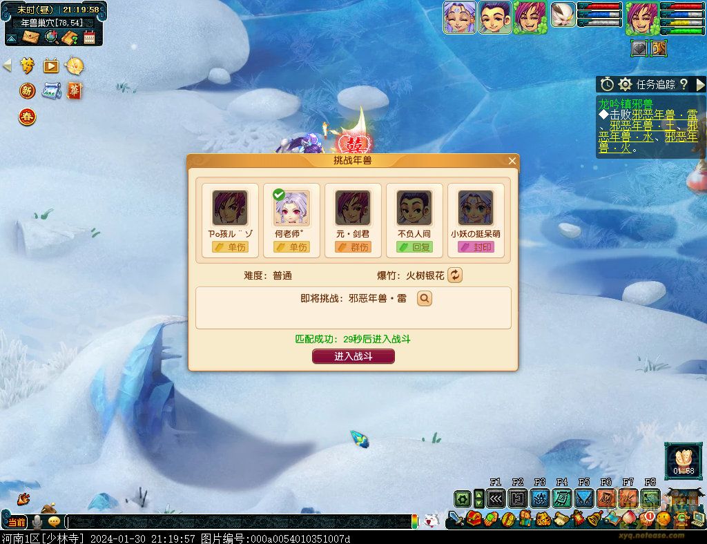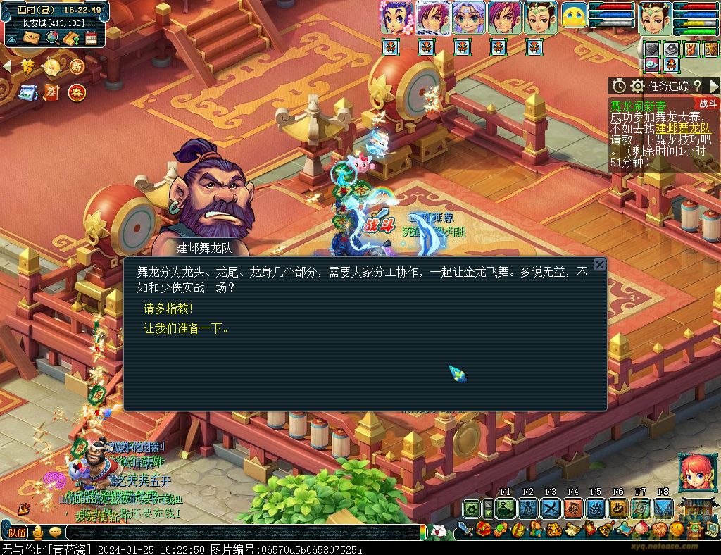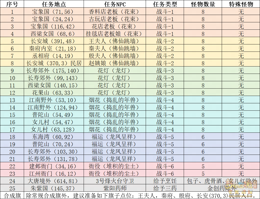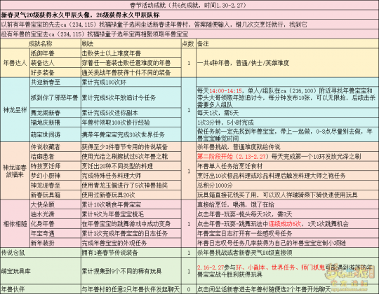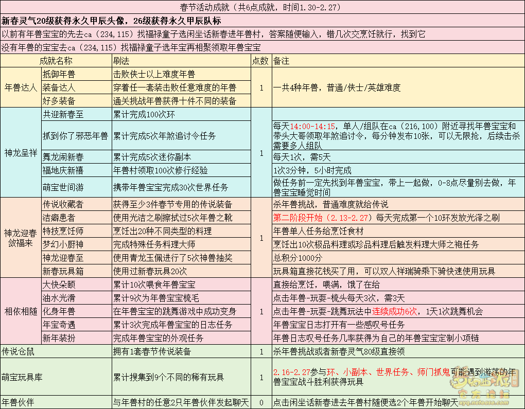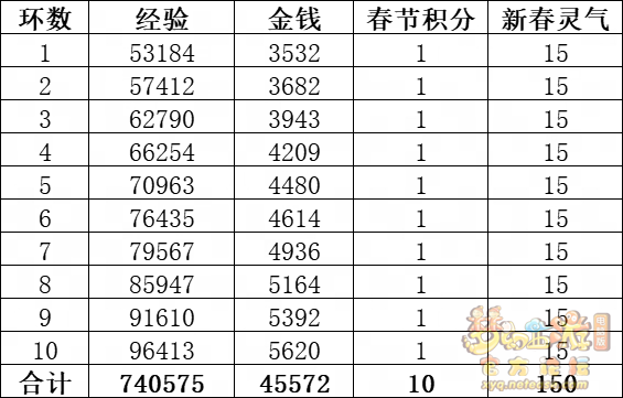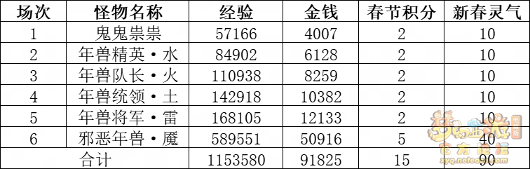 丹凤朝阳歌盛世,神龙赐福贺新春! 一、新春活动简介: 本次新春活动有多种组队任务和单人任务,以及趣味PVP玩法。 组队任务:三界迎新春(第一阶段环任务)、四海闻春风(第二阶段环任务)、舞龙闹新春(小副本)、年煞追讨令(限时挑战)、龙吟镇邪兽(年兽挑战)。 单人任务:龙年新玩具(玩具玩法)、新年小目标(累计奖励)、福地贺新年(挂机玩法)、年宝再团聚(年兽宝宝回归任务)、闲坐话新春(AI互动)、萌宝尘世游(单人世界任务)、年兽玩具库(彩蛋奖励)、春来启神兵(专属装备)、新春小当家(新春烹饪)、神龙迎春来(神兽抽奖)、烟花贺年岁(烟花拜年)、牧场庆团圆(牧场管理)。 趣味PVP:擂台单挑王(单挑模式擂台赛)、菁英挑战赛(剑会天下三界菁英模式)。 活动涵盖范围广,上手难度低,奖励非常丰厚,定能为这个春节增色良多。 二、共度团圆年 三界迎新春(环任务-第一阶段) 【参与条件】≥30级,队伍人数≥3。 【玩法介绍】重复领取式任务。1月30日12点至2月13日8点,玩家可在长安城(235,114)福禄童子处领取任务。前100环为双倍奖励,101至140环为1.4倍奖励,141环后无奖励。队长每次成功带队完成一轮环任务时,均获得一次旋转队长奖励转盘的机会,可获得丰富的物品奖励! 本次轮内环任务支持快速领取,无需返回活动主NPC处领取任务。环任务主要涉及NPC及合成旗点位推荐如下表格所示: 【活动详解】所有战斗均无特殊怪物,每场战斗均可使用爆竹技能,怪物存在对应易伤,使用对应类型的技能进行输出可以打出更高伤害。其中,黄色破盾:物理易伤;蓝色破盾:法术易伤;紫色破盾:固伤易伤,三种易伤状态可以叠加。合理利用怪物易伤,可以打出高额伤害! 战斗类型①:香料店老板、古玩店老板、花店老板、挂毯店老板(花束) 战斗类型②:王夫人、秦夫人、殷夫人、赵姨娘(佛仙跳墙) 战斗类型③:花灯(龙灯) 战斗类型④:烟花(捣乱的年兽) 战斗类型⑤:福运(龙凤呈祥) 战斗类型⑥:衙役(堆积的尘土) 给予烹饪(包子、虎骨酒、女儿红除外):3号烽火台守卫 给予三药(金创药除外):紫阳药师 【活动奖励】以109级为例,完成任务获得的基础奖励如下表格所示。每完成10环后,队长可以获得转盘奖励。转盘物品奖励如下: 此外,在环任务的过程中,还有可能获得全队的春节彩蛋哦~队员可以选择砸开一个金蛋,获得其中丰富奖励。 三、舞龙闹新春 【领取要求】等级≥50级,队伍人数=5 【活动介绍】2024年1月30日12点至2月27日12点,玩家(≥50级,5人组队)可在长安城(235,114)福禄童子处开启任务。 【任务详解】如下 测试阵容如上。 组队找福禄童子开启小副本任务,进入虚拟场景后点击大赛使者,经过一段对话后,点击建邺舞龙队,触发本任务的第一场战斗。 主怪固定使用二龙戏珠,雷龙固定使用水漫金山,虬龙固定使用天罗地网,左侧龙龟固定使用龙腾,右侧龙龟和前排中间的小龙女固定使用龙卷雨击,中间左右的小龙女固定使用水攻,最左最右的小龙女固定平砍,伤害均不高。 总体难度不大,硬件不强的需要注意回复,建议优先击杀最左最右的小龙女,只有这两个是物理攻击,会造成耐久损失。 战斗结束后,点击大赛使者进行变身,需要玩家五人均处于变身状态才能进行任务。大赛使者提供的变身为:小龙女、龙鲤、蛟龙、虬龙、雷龙。变身完毕后,点击建邺舞龙队,触发本任务的第二场战斗。 龙龟未见行动,左侧蛟龙固定使用龙卷雨击,右侧蛟龙固定使用龙腾,前排虬龙和雷龙开始蓄力三回合(可被打断),蓄力完成后使用百爪狂杀,伤害均不高。总体难度不大,建议优先打断前排蓄力,减少耐久损耗,硬件不强的需要注意回复。 战斗结束后,点击大赛使者,经过一段对话后传送至东海湾,点击愤怒的龙族护卫,触发本任务的第三场战斗。 蛟龙固定使用水漫金山,小龙女随机使用平砍或水攻,伤害不高。 总体难度不大,硬件不强的需要注意回复或者携带水属性吸收类装备或法宝。 战斗结束后传送至水晶宫,点击愤怒的龙王,触发本任务的第四场战斗。 主怪固定使用龙卷雨击,龟丞相固定使用水漫金山,虾兵固定使用平砍,小龙女固定使用水攻,蟹将随机使用平砍或破血狂攻,伤害均不高。 总体难度不大,硬件不强的建议封印龟丞相,重点击杀蟹将。 战斗结束后传送至天宫,点击守门天将,经过一段对话后传送至长安城,点击下凡的神仙,需要完成三个小任务才能继续进行。 穷汉任务:点击拾取掉落的年货。 张老财任务:答题。 孟大娘任务:临摹。 战斗结束后点击下凡的神仙复命,传送至水晶宫,点击愤怒的龙王,经过过场动画后传送至长安城,点击大赛使者,触发本任务的BOSS战。 战斗固定持续10回合,主怪固定使用龙卷雨击,被击杀后会出现两颗宝珠;龙龟固定使用水漫金山被击杀后出现一颗蓝色宝珠,击杀蓝色宝珠后会对全部宝珠造成伤害;虬龙会进行三回合蓄力,蓄力完成后使用百爪狂杀(可被打断);雷龙女儿村,般若天女固定平砍,被击杀后会出现一颗宝珠;所有宝珠不行动,前排宝珠每回合会补全,每击杀一颗宝珠得一分,击杀一颗大宝珠得五分,且场上会出现紫色宝珠,紫色宝珠被击杀后会随机炸掉一颗宝珠。 建议大家携带须弥开场,封系封印雷龙,防止其干扰行动,输出系优先击杀虬龙,以打断蓄力,然后可以击杀主怪、龙龟、般若天女,召唤更多的龙珠。总体难度不大,硬件不强的需要注意回复。 战斗结束后,任务完成。 四、年