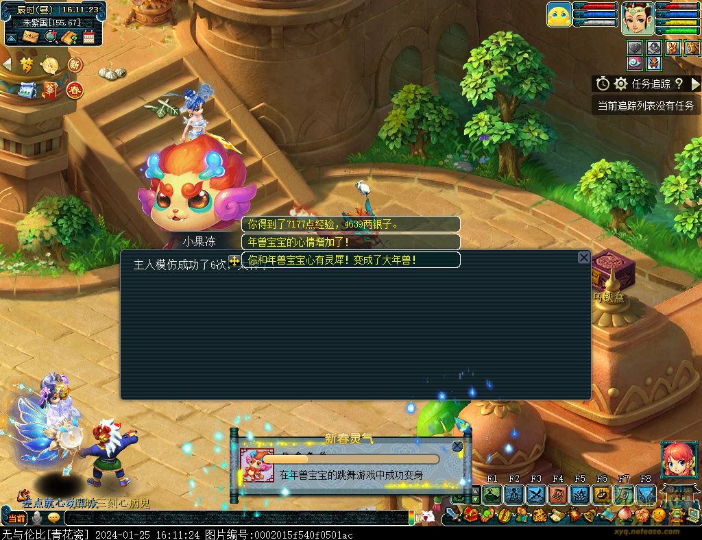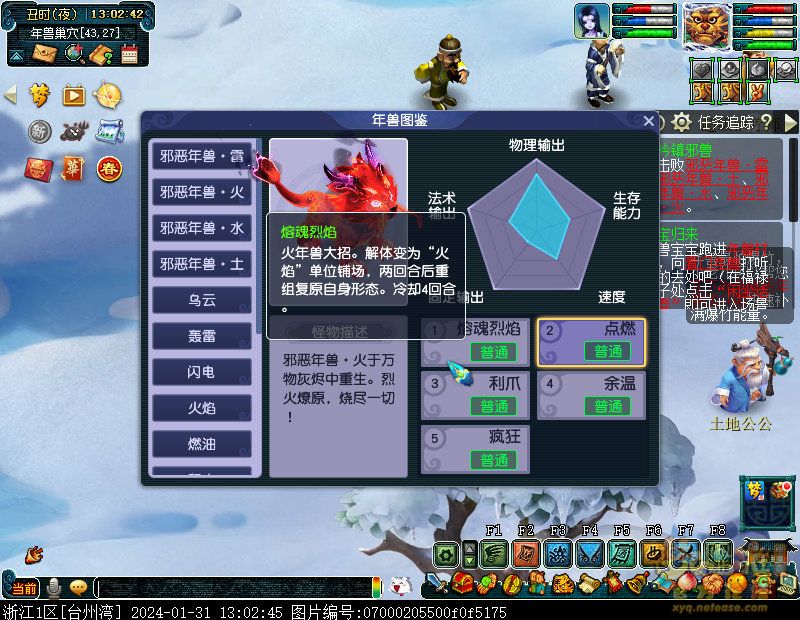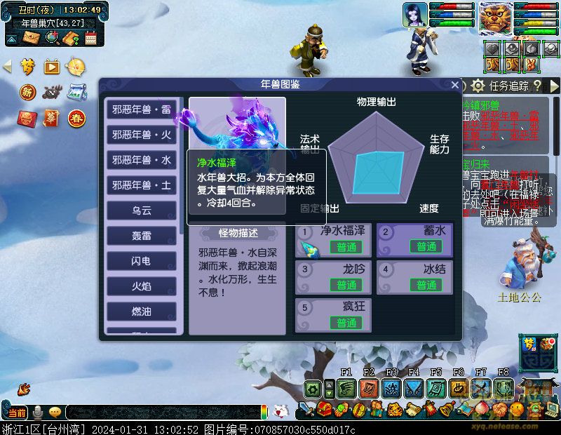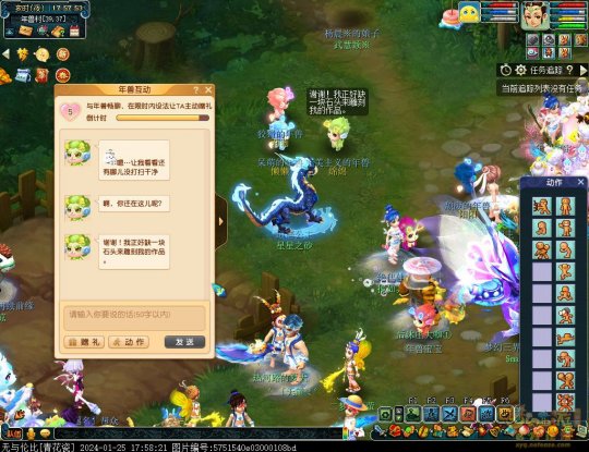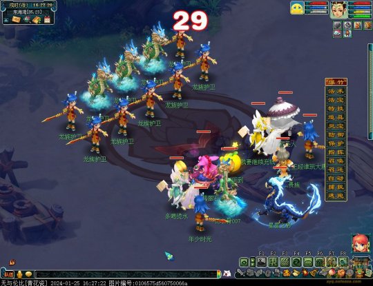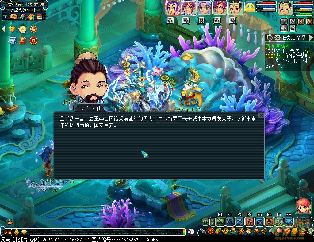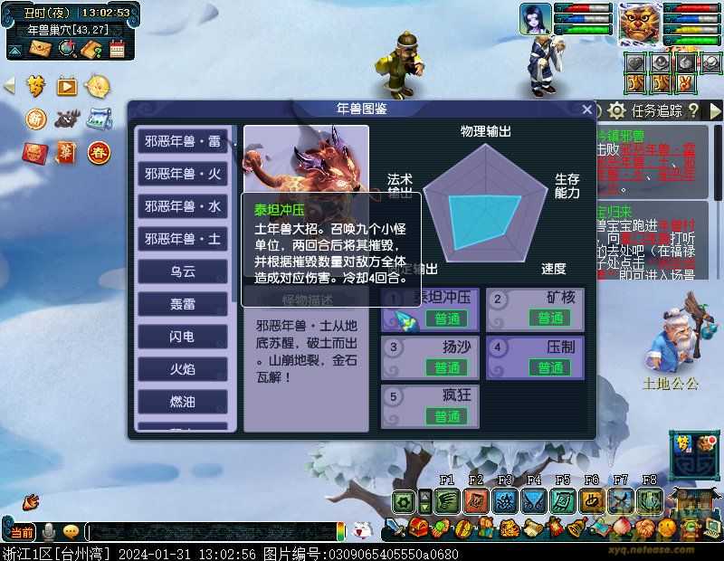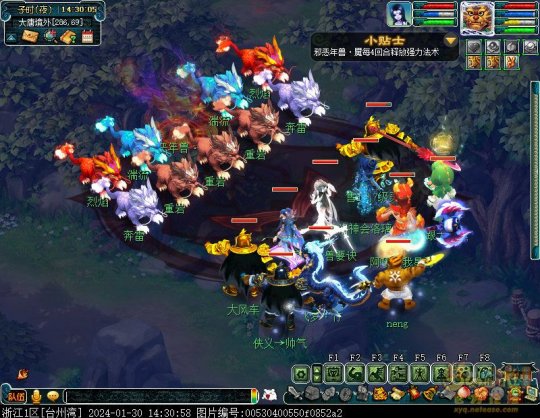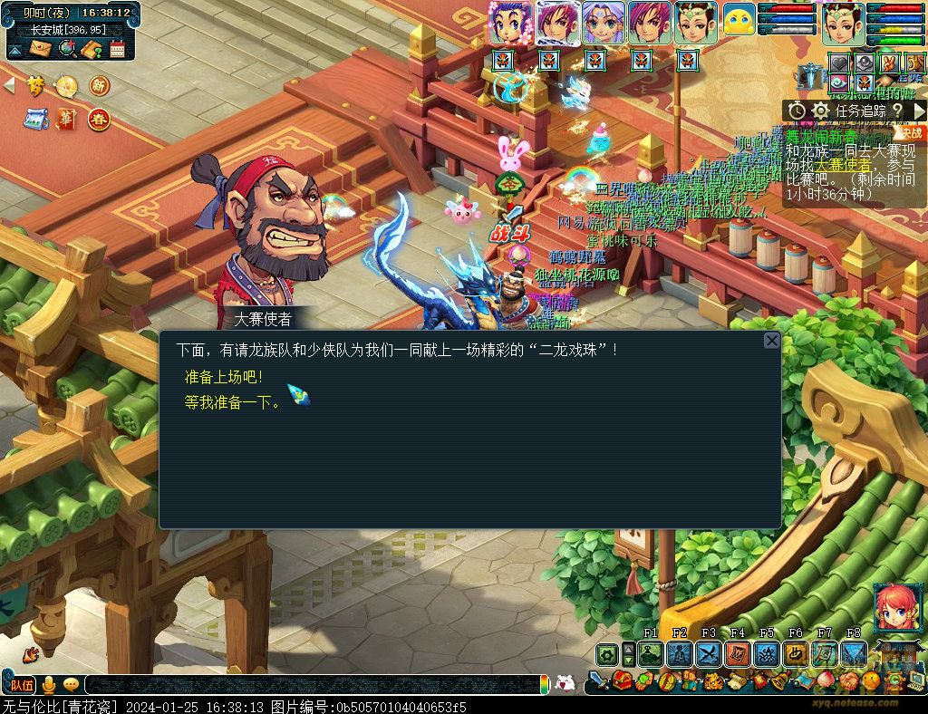 丹凤朝阳歌盛世,神龙赐福贺新春! 一、新春活动简介: 本次新春活动有多种组队任务和单人任务,以及趣味PVP玩法。 组队任务:三界迎新春(第一阶段环任务)、四海闻春风(第二阶段环任务)、舞龙闹新春(小副本)、年煞追讨令(限时挑战)、龙吟镇邪兽(年兽挑战)。 单人任务:龙年新玩具(玩具玩法)、新年小目标(累计奖励)、福地贺新年(挂机玩法)、年宝再团聚(年兽宝宝回归任务)、闲坐话新春(AI互动)、萌宝尘世游(单人世界任务)、年兽玩具库(彩蛋奖励)、春来启神兵(专属装备)、新春小当家(新春烹饪)、神龙迎春来(神兽抽奖)、烟花贺年岁(烟花拜年)、牧场庆团圆(牧场管理)。 趣味PVP:擂台单挑王(单挑模式擂台赛)、菁英挑战赛(剑会天下三界菁英模式)。 活动涵盖范围广,上手难度低,奖励非常丰厚,定能为这个春节增色良多。 二、共度团圆年 三界迎新春(环任务-第一阶段) 【参与条件】≥30级,队伍人数≥3。 【玩法介绍】重复领取式任务。1月30日12点至2月13日8点,玩家可在长安城(235,114)福禄童子处领取任务。前100环为双倍奖励,101至140环为1.4倍奖励,141环后无奖励。队长每次成功带队完成一轮环任务时,均获得一次旋转队长奖励转盘的机会,可获得丰富的物品奖励! 本次轮内环任务支持快速领取,无需返回活动主NPC处领取任务。环任务主要涉及NPC及合成旗点位推荐如下表格所示: 【活动详解】所有战斗均无特殊怪物,每场战斗均可使用爆竹技能,怪物存在对应易伤,使用对应类型的技能进行输出可以打出更高伤害。其中,黄色破盾:物理易伤;蓝色破盾:法术易伤;紫色破盾:固伤易伤,三种易伤状态可以叠加。合理利用怪物易伤,可以打出高额伤害! 战斗类型①:香料店老板、古玩店老板、花店老板、挂毯店老板(花束) 战斗类型②:王夫人、秦夫人、殷夫人、赵姨娘(佛仙跳墙) 战斗类型③:花灯(龙灯) 战斗类型④:烟花(捣乱的年兽) 战斗类型⑤:福运(龙凤呈祥) 战斗类型⑥:衙役(堆积的尘土) 给予烹饪(包子、虎骨酒、女儿红除外):3号烽火台守卫 给予三药(金创药除外):紫阳药师 【活动奖励】以109级为例,完成任务获得的基础奖励如下表格所示。每完成10环后,队长可以获得转盘奖励。转盘物品奖励如下: 此外,在环任务的过程中,还有可能获得全队的春节彩蛋哦~队员可以选择砸开一个金蛋,获得其中丰富奖励。 三、舞龙闹新春 【领取要求】等级≥50级,队伍人数=5 【活动介绍】2024年1月30日12点至2月27日12点,玩家(≥50级,5人组队)可在长安城(235,114)福禄童子处开启任务。 【任务详解】如下 测试阵容如上。 组队找福禄童子开启小副本任务,进入虚拟场景后点击大赛使者,经过一段对话后,点击建邺舞龙队,触发本任务的第一场战斗。 主怪固定使用二龙戏珠,雷龙固定使用水漫金山,虬龙固定使用天罗地网,左侧龙龟固定使用龙腾,右侧龙龟和前排中间的小龙女固定使用龙卷雨击,中间左右的小龙女固定使用水攻,最左最右的小龙女固定平砍,伤害均不高。 总体难度不大,硬件不强的需要注意回复,建议优先击杀最左最右的小龙女,只有这两个是物理攻击,会造成耐久损失。 战斗结束后,点击大赛使者进行变身,需要玩家五人均处于变身状态才能进行任务。大赛使者提供的变身为:小龙女、龙鲤、蛟龙、虬龙、雷龙。变身完毕后,点击建邺舞龙队,触发本任务的第二场战斗。 龙龟未见行动,左侧蛟龙固定使用龙卷雨击,右侧蛟龙固定使用龙腾,前排虬龙和雷龙开始蓄力三回合(可被打断),蓄力完成后使用百爪狂杀,伤害均不高。总体难度不大,建议优先打断前排蓄力,减少耐久损耗,硬件不强的需要注意回复。 战斗结束后,点击大赛使者,经过一段对话后传送至东海湾,点击愤怒的龙族护卫,触发本任务的第三场战斗。 蛟龙固定使用水漫金山,小龙女随机使用平砍或水攻,伤害不高。 总体难度不大,硬件不强的需要注意回复或者携带水属性吸收类装备或法宝。 战斗结束后传送至水晶宫,点击愤怒的龙王,触发本任务的第四场战斗。 主怪固定使用龙卷雨击,龟丞相固定使用水漫金山,虾兵固定使用平砍,小龙女固定使用水攻,蟹将随机使用平砍或破血狂攻,伤害均不高。 总体难度不大,硬件不强的建议封印龟丞相,重点击杀蟹将。 战斗结束后传送至天宫,点击守门天将,经过一段对话后传送至长安城,点击下凡的神仙,需要完成三个小任务才能继续进行。 穷汉任务:点击拾取掉落的年货。 张老财任务:答题。 孟大娘任务:临摹。 战斗结束后点击下凡的神仙复命,传送至水晶宫,点击愤怒的龙王,经过过场动画后传送至长安城,点击大赛使者,触发本任务的BOSS战。 战斗固定持续10回合,主怪固定使用龙卷雨击,被击杀后会出现两颗宝珠;龙龟固定使用水漫金山被击杀后出现一颗蓝色宝珠,击杀蓝色宝珠后会对全部宝珠造成伤害;虬龙会进行三回合蓄力,蓄力完成后使用百爪狂杀(可被打断);雷龙女儿村,般若天女固定平砍,被击杀后会出现一颗宝珠;所有宝珠不行动,前排宝珠每回合会补全,每击杀一颗宝珠得一分,击杀一颗大宝珠得五分,且场上会出现紫色宝珠,紫色宝珠被击杀后会随机炸掉一颗宝珠。 建议大家携带须弥开场,封系封印雷龙,防止其干扰行动,输出系优先击杀虬龙,以打断蓄力,然后可以击杀主怪、龙龟、般若天女,召唤更多的龙珠。总体难度不大,硬件不强的需要注意回复。 战斗结束后,任务完成。 四、年
