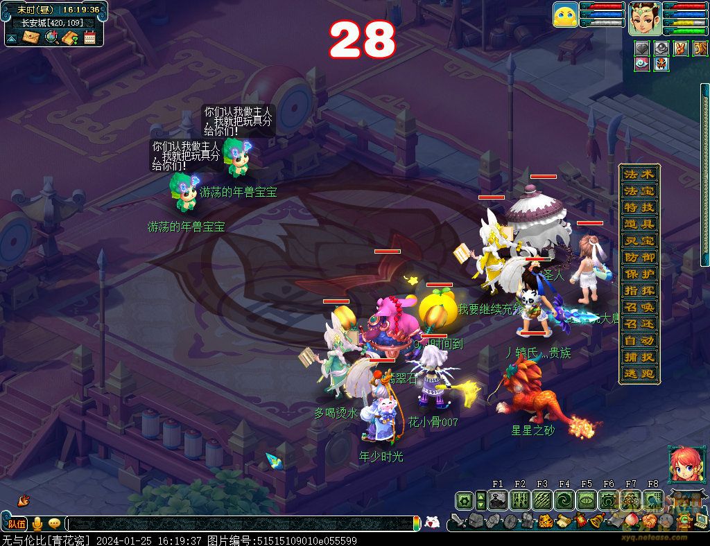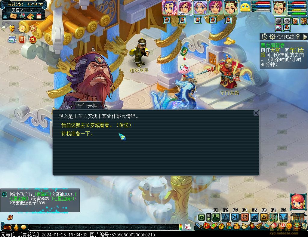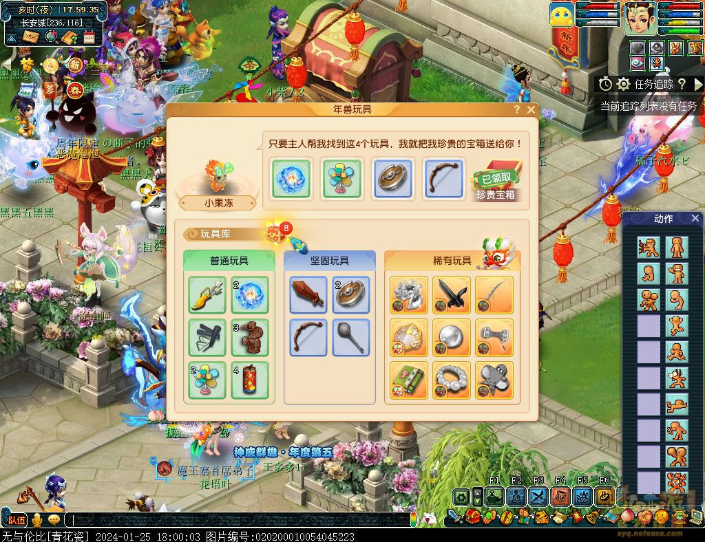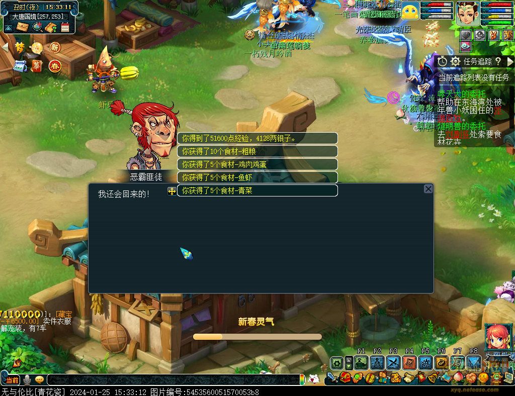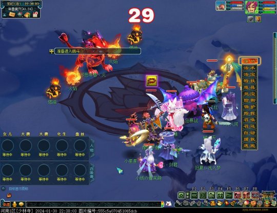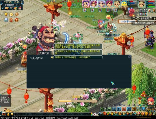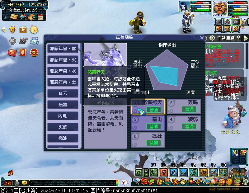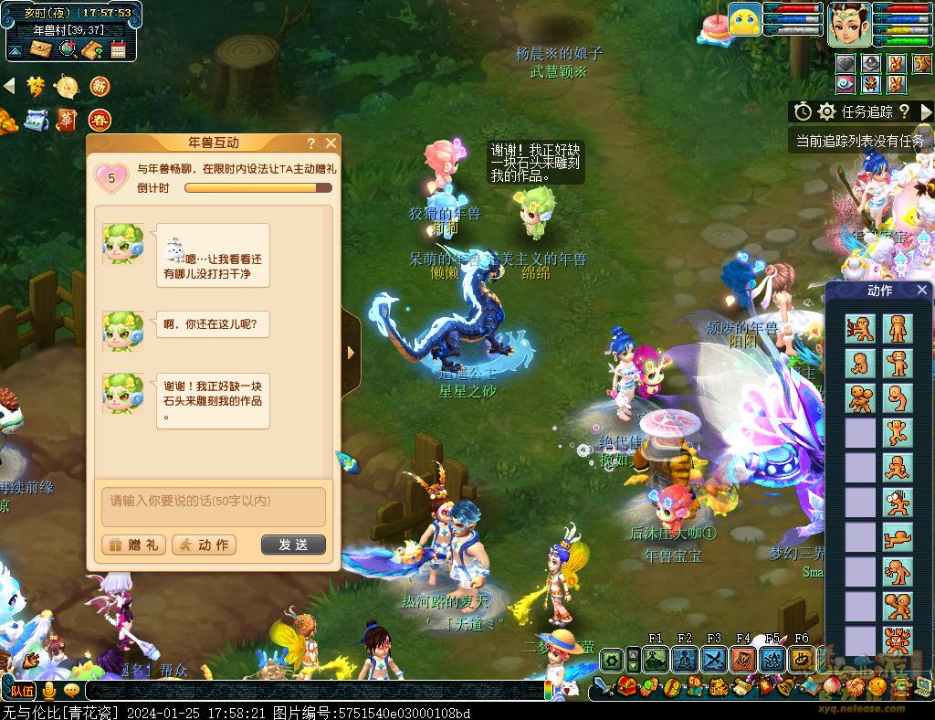 丹凤朝阳歌盛世,神龙赐福贺新春! 一、新春活动简介: 本次新春活动有多种组队任务和单人任务,以及趣味PVP玩法。 组队任务:三界迎新春(第一阶段环任务)、四海闻春风(第二阶段环任务)、舞龙闹新春(小副本)、年煞追讨令(限时挑战)、龙吟镇邪兽(年兽挑战)。 单人任务:龙年新玩具(玩具玩法)、新年小目标(累计奖励)、福地贺新年(挂机玩法)、年宝再团聚(年兽宝宝回归任务)、闲坐话新春(AI互动)、萌宝尘世游(单人世界任务)、年兽玩具库(彩蛋奖励)、春来启神兵(专属装备)、新春小当家(新春烹饪)、神龙迎春来(神兽抽奖)、烟花贺年岁(烟花拜年)、牧场庆团圆(牧场管理)。 趣味PVP:擂台单挑王(单挑模式擂台赛)、菁英挑战赛(剑会天下三界菁英模式)。 活动涵盖范围广,上手难度低,奖励非常丰厚,定能为这个春节增色良多。 二、共度团圆年 三界迎新春(环任务-第一阶段) 【参与条件】≥30级,队伍人数≥3。 【玩法介绍】重复领取式任务。1月30日12点至2月13日8点,玩家可在长安城(235,114)福禄童子处领取任务。前100环为双倍奖励,101至140环为1.4倍奖励,141环后无奖励。队长每次成功带队完成一轮环任务时,均获得一次旋转队长奖励转盘的机会,可获得丰富的物品奖励! 本次轮内环任务支持快速领取,无需返回活动主NPC处领取任务。环任务主要涉及NPC及合成旗点位推荐如下表格所示: 【活动详解】所有战斗均无特殊怪物,每场战斗均可使用爆竹技能,怪物存在对应易伤,使用对应类型的技能进行输出可以打出更高伤害。其中,黄色破盾:物理易伤;蓝色破盾:法术易伤;紫色破盾:固伤易伤,三种易伤状态可以叠加。合理利用怪物易伤,可以打出高额伤害! 战斗类型①:香料店老板、古玩店老板、花店老板、挂毯店老板(花束) 战斗类型②:王夫人、秦夫人、殷夫人、赵姨娘(佛仙跳墙) 战斗类型③:花灯(龙灯) 战斗类型④:烟花(捣乱的年兽) 战斗类型⑤:福运(龙凤呈祥) 战斗类型⑥:衙役(堆积的尘土) 给予烹饪(包子、虎骨酒、女儿红除外):3号烽火台守卫 给予三药(金创药除外):紫阳药师 【活动奖励】以109级为例,完成任务获得的基础奖励如下表格所示。每完成10环后,队长可以获得转盘奖励。转盘物品奖励如下: 此外,在环任务的过程中,还有可能获得全队的春节彩蛋哦~队员可以选择砸开一个金蛋,获得其中丰富奖励。 三、舞龙闹新春 【领取要求】等级≥50级,队伍人数=5 【活动介绍】2024年1月30日12点至2月27日12点,玩家(≥50级,5人组队)可在长安城(235,114)福禄童子处开启任务。 【任务详解】如下 测试阵容如上。 组队找福禄童子开启小副本任务,进入虚拟场景后点击大赛使者,经过一段对话后,点击建邺舞龙队,触发本任务的第一场战斗。 主怪固定使用二龙戏珠,雷龙固定使用水漫金山,虬龙固定使用天罗地网,左侧龙龟固定使用龙腾,右侧龙龟和前排中间的小龙女固定使用龙卷雨击,中间左右的小龙女固定使用水攻,最左最右的小龙女固定平砍,伤害均不高。 总体难度不大,硬件不强的需要注意回复,建议优先击杀最左最右的小龙女,只有这两个是物理攻击,会造成耐久损失。 战斗结束后,点击大赛使者进行变身,需要玩家五人均处于变身状态才能进行任务。大赛使者提供的变身为:小龙女、龙鲤、蛟龙、虬龙、雷龙。变身完毕后,点击建邺舞龙队,触发本任务的第二场战斗。 龙龟未见行动,左侧蛟龙固定使用龙卷雨击,右侧蛟龙固定使用龙腾,前排虬龙和雷龙开始蓄力三回合(可被打断),蓄力完成后使用百爪狂杀,伤害均不高。总体难度不大,建议优先打断前排蓄力,减少耐久损耗,硬件不强的需要注意回复。 战斗结束后,点击大赛使者,经过一段对话后传送至东海湾,点击愤怒的龙族护卫,触发本任务的第三场战斗。 蛟龙固定使用水漫金山,小龙女随机使用平砍或水攻,伤害不高。 总体难度不大,硬件不强的需要注意回复或者携带水属性吸收类装备或法宝。 战斗结束后传送至水晶宫,点击愤怒的龙王,触发本任务的第四场战斗。 主怪固定使用龙卷雨击,龟丞相固定使用水漫金山,虾兵固定使用平砍,小龙女固定使用水攻,蟹将随机使用平砍或破血狂攻,伤害均不高。 总体难度不大,硬件不强的建议封印龟丞相,重点击杀蟹将。 战斗结束后传送至天宫,点击守门天将,经过一段对话后传送至长安城,点击下凡的神仙,需要完成三个小任务才能继续进行。 穷汉任务:点击拾取掉落的年货。 张老财任务:答题。 孟大娘任务:临摹。 战斗结束后点击下凡的神仙复命,传送至水晶宫,点击愤怒的龙王,经过过场动画后传送至长安城,点击大赛使者,触发本任务的BOSS战。 战斗固定持续10回合,主怪固定使用龙卷雨击,被击杀后会出现两颗宝珠;龙龟固定使用水漫金山被击杀后出现一颗蓝色宝珠,击杀蓝色宝珠后会对全部宝珠造成伤害;虬龙会进行三回合蓄力,蓄力完成后使用百爪狂杀(可被打断);雷龙女儿村,般若天女固定平砍,被击杀后会出现一颗宝珠;所有宝珠不行动,前排宝珠每回合会补全,每击杀一颗宝珠得一分,击杀一颗大宝珠得五分,且场上会出现紫色宝珠,紫色宝珠被击杀后会随机炸掉一颗宝珠。 建议大家携带须弥开场,封系封印雷龙,防止其干扰行动,输出系优先击杀虬龙,以打断蓄力,然后可以击杀主怪、龙龟、般若天女,召唤更多的龙珠。总体难度不大,硬件不强的需要注意回复。 战斗结束后,任务完成。 四、年