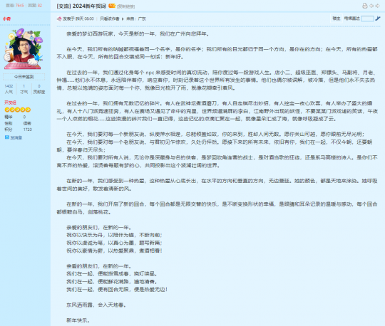 福启新岁,万事顺遂。家人闲坐,灯火可亲。新春已至,叶子猪梦幻猪祝各位少侠新年快乐,喜乐安宁。愿大家良辰吉日时时有,锦瑟年华岁岁拥,旧岁千般皆如意,新年万事定称心。下面,就让猪队长带大家去看看今天的梦幻新鲜事吧! 一、小奇发来新年祝福 昨日,梦幻西游主策划“小奇”在官方论坛发出寄语,在广州给所有梦幻西游玩家拜年。拜年内容同大家熟悉的NPC、日常玩法有关,还有梦幻西游未来的展望,也希望大家能在梦幻西游的世界里收获友谊和快乐。借此,猪队长也祝愿各位大家新年快乐哟! 二、新的一年被红孩儿制裁 今日凌晨,有位小伙伴开启了“红孩儿”副本,一轮顺分顺手的打到BOSS时却出了意外。简单来说,就是圣婴大王的输出太猛,接连将其斩杀两次,成功让其损失了197969两金钱和429万经验,战况可谓是非常惨烈。对此,猪队长希望大家一定要常备罗汉,避免被法伤较高的怪物制裁哦! 三、新年红包你拿到了么? 从昨日晚上开始,凡是进入跨服联赛赛场参加帮战的小伙伴都可以获得“春节红包”。红包内不仅有大量经验、金钱,还可以开出五宝、C66等高价值物品。据了解,这次的新春活动共计持续三天,有条件参与的小伙伴一定要抓住这次“致富机会”哦! 四、开耀眼碎片喜提高级强力 近日,有位小伙伴在结束同天罡星的战斗后,获得了一枚“耀眼的星辰碎片”。随手开启后,得到了一本“高级强力”,成功致富。猪队长觉得,随着大家的属性提升,如今的天罡地煞并不算难,只要有一定的装备、召唤兽基础,在了解天罡战斗机制的情况下就可以轻松通关,有条件的小伙伴可以多多尝试哦! 今天的新鲜事就到这里了,各位小伙伴如果在游戏内、外碰见什么有意思的事情,都可以给我们投稿哦! 叶子猪梦幻西游玩家群:1群 325703083 (2000人),2群: 330102322 (千人);3群: 424986787 (游戏疑难解答);4群: 330518295 (商人物价);5群: 1063086037 (疑难解答);6群: 1045753197 (春心萌动);7群: 787195090 (活跃互动);8群: 720665628 (全民PK)