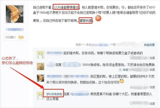 在梦幻西游中要想提高自己,首先要买到适合自己的装备,然后是拥有输出爆炸的宝宝,其实最根本的是需要提升一下自己的软实力,比如说点修!最近有玩家迫切的想要提升自己,于是乎就加了一个帮派跑商,进帮半个月,一直是猎术,点不了攻修,好不容易逮到帮主上线了,想请求一下能不能开攻修,就有了下面这么一段对话。 玩家表示,玩梦幻这么久就没有见过这样的规矩,开攻修还非要扔60个盒子,凭什么,我凭自己的本事加的帮,跑的商,点修的时候凭什么要在仍60个盒子呢?然后玩家继续追问! 心态爆炸的玩家感觉到在这个帮里受到了巨大的侮辱,不仅帮主“高冷”的要命,而且想开攻修点点攻击修炼还需要仍60个盒子,真是哑巴吃黄连,有苦说不出啊,表示让帮主把自己踢出帮,换个帮派。PS:被踢出帮的人在加帮的时候保留帮贡,在跑商的时候可以重新补回来原来的帮贡!但是帮主不仅不搭理他,而且下线了,本来心态就爆炸的玩家这下子心态就崩了,买了一车黄纸扔到帮里。。。。 玩家想把自己的遭遇说给大家,让大家控诉一下这个极品帮主,并且安慰一下自己受伤的小心灵。。。然而网友们的评论缺。。。 想想还真是这么个道理了,帮派是大部分玩家意志的统一,并不能为了某个人的利益而改变现状,做人不能太自私了,要有那种舍小家为大家的精神,不能有走自己的路让别人无路可走的心里! 将心比心啊,不在其位不谋其政,没有当过帮主就不知道要维持一个帮的正常运营是不容易的,要是每个人都来要求开这个修炼那个修炼的话,每更换一个修炼都需要消耗帮派资金300万,并不是随便来来回回开着玩的,除非是符合绝大数人的意愿的话,可以更换修炼类型,不然要是为了一个人的话,那有点小题大做,如果个人愿意补上300万梦幻币的消耗的话,帮主也是会考虑给你开的,现在只是让你仍60个盒子,单算钱的话才180万,比起300万的话不知道少多少,而且扔盒子还有帮贡补贴,帮主做的一点也不过分,帅编倒是认为这个帮众是个极品,你觉得呢? 叶子猪梦幻西游玩家群:1群 325703083 (2000人),2群: 330102322 (千人);3群: 424986787 (游戏疑难解答);4群: 330518295 (商人物价);5群: 1063086037 (疑难解答);6群: 1045753197 (春心萌动);7群: 787195090 (活跃互动);8群: 720665628 (全民PK) [编辑:极光]