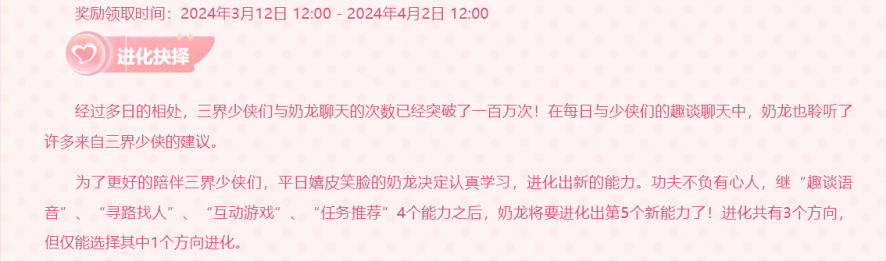 福气融融暖三界,齐乐龙龙过大年!《梦幻西游》电脑版近期精彩与福利倍出,其中备受少侠瞩目的集齐外观返仙玉和奶龙升级迭代投票。 奶龙迭代,全民选功能 “奶龙”作为与情人节礼盒一同推出的祥瑞,其呆萌可爱的造型吸引无数少侠。此次《梦幻西游》电脑版官方以“奶龙坐骑形态升级迭代”向全体少侠发出选择邀请,共有3种方案给予少侠选择: 面临重要的人生抉择,奶龙却犯了难,到底该选哪个方向进化呢?还是请各位“龙头老大”们来做主吧!活动期间,等级≥30的少侠们前往【宝象国(40,28)】奶龙处,即可支持奶龙进化。 1. 组队小秘。当少侠在骑乘奶龙时,奶龙在趣谈框中提醒少侠有人在某处地点喊话,少侠可点击确认前往某地进行查看。 2.双骑乘姿势。少侠在地面骑乘时,在当前频道喊出趴下,奶龙将会切换骑乘姿势。 3.节日惊喜。在端午节期间与奶龙玩“讨要食物”小游戏时,有概率获得“梦幻精品粽”。 “奶龙”祥瑞的三种功能都有各自的作用,都能够提升少侠们畅游三界的幸福感。因此少侠们可以自行投票给自己心仪的功能,让它成为现实。 新春礼盒返仙玉 情人节推出的“龙卷风锦衣礼盒”男款帅气迷人,女款高贵优雅,深受少侠喜爱。恰逢全服友好度在2024年2月14日成功突破了163亿,2024年2月17日至2月22日开启的“新年利是许愿池”活动中,少侠们许愿仙玉返利的心愿我们收到啦,为庆祝这一崭新里程碑,福利满满的新年利是已为各位少侠准备好!齐乐龙龙礼盒”售卖期间可享受79折优惠(售价28776仙玉),在2024年4月2日12:00前集齐全套“齐乐龙龙礼盒”的玩家,不但可享受之前的大礼盒物品全部馈赠,还将获得等同于以折扣价格直接购买大礼盒的仙玉回馈(将以免费仙玉的形式发放) 值得注意的是以任意方式集齐“齐乐龙龙礼盒”,将获得的额外馈赠奖励包括:永久称谓“龙卷风·稀世”、永久限定专属头像框“龙卷风·稀世”、永久限定全新头顶小宠物“小奶龙”、奶龙限定外观服饰、双人交互动作、限定永久彩饰“星星眼”、3D秀妆容六件套“琢玉断金”(男)/“窈窕无双”(女)、3D限定场景“心悦臣服”、限时组队框“同心结”(使用有效期:2024年7月2日08:00)。还不快来集齐全套“齐乐龙龙礼盒”享受超多额外馈赠奖励! 少侠们对《梦幻西游》的热爱与官方特别推出的福利功能,双赢的同时又让三界中充满情义与趣味。随着《梦幻西游》的一往无前,相信更多少侠们都将继续在三界中遨游驰骋,享受三界中的美好与梦想,再度编织出独属自身的特别回忆。 叶子猪梦幻西游玩家群:1群 325703083 (2000人),2群: 330102322 (千人);3群: 424986787 (游戏疑难解答);4群: 330518295 (商人物价);5群: 1063086037 (疑难解答);6群: 1045753197 (春心萌动);7群: 787195090 (活跃互动);8群: 720665628 (全民PK)