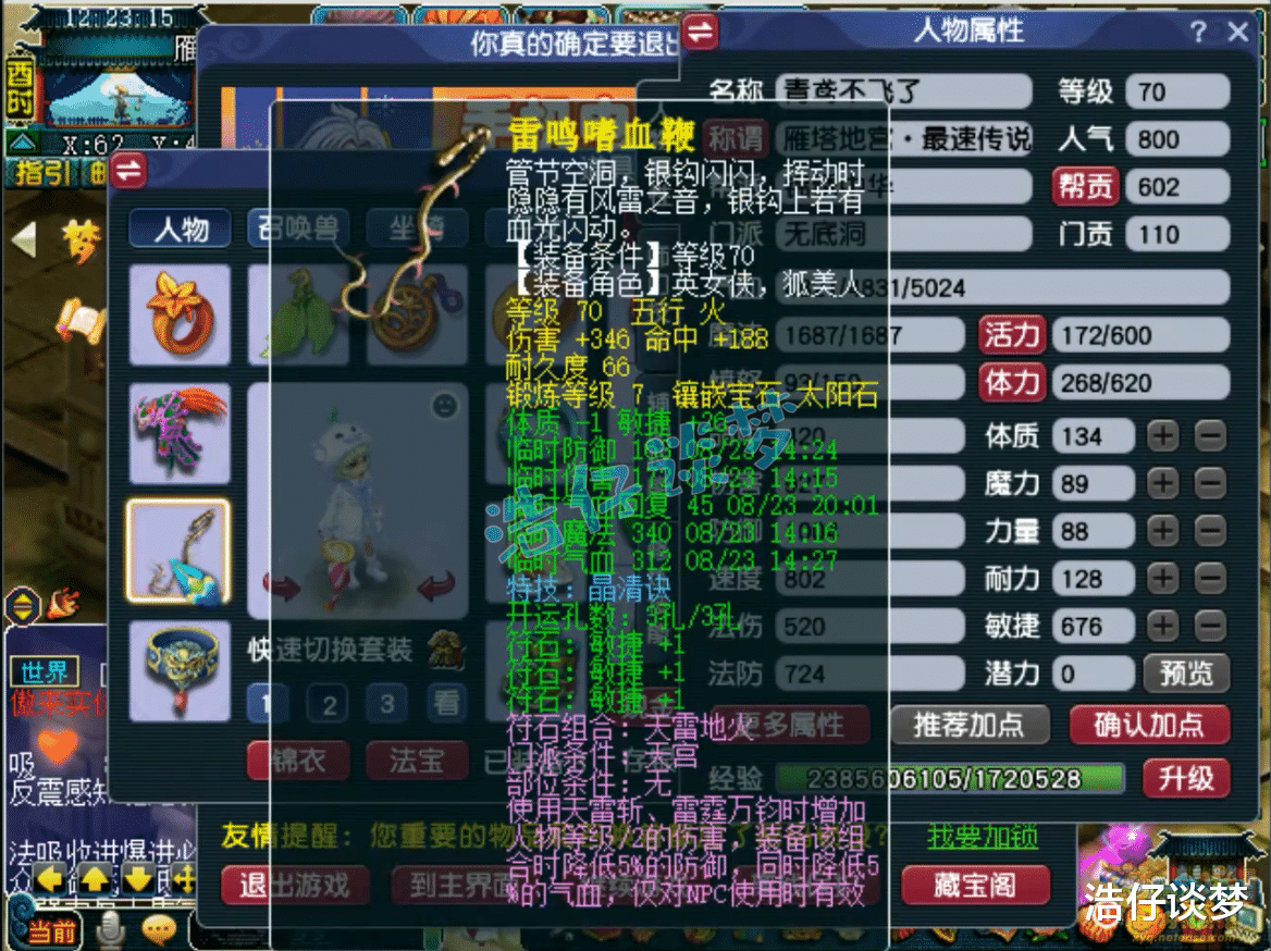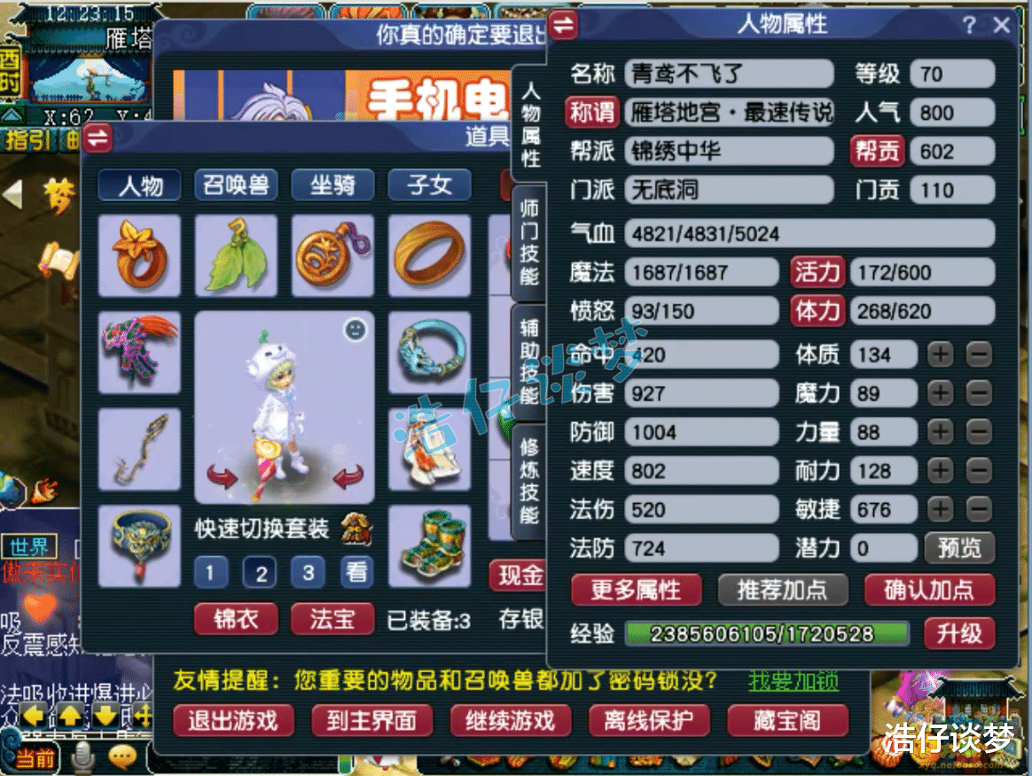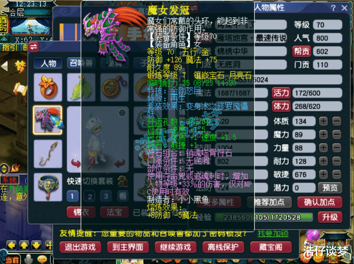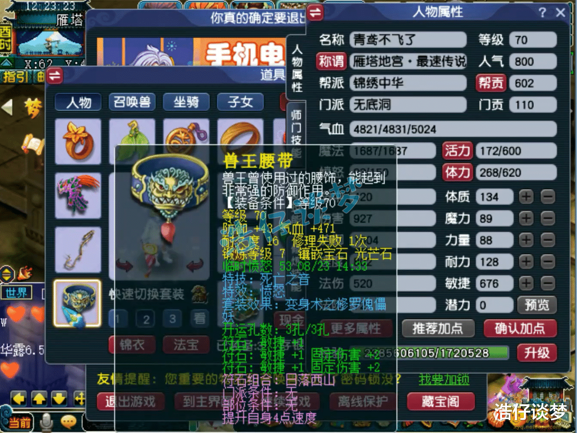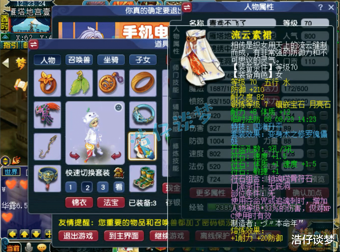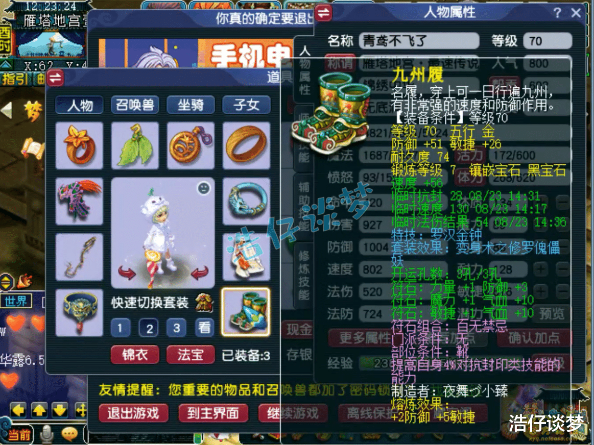 Hello大家好,我是浩仔!关注浩仔,每天给你带来最新梦幻西游游戏资讯!以下点评仅代表个人意见,不代表官方或平台立场。 各位还记得前几天我给大家展示的那个通过了雁塔地宫130层的70级五开队伍吗?之前一共给大家展示了他队伍的4个角色,今天终于迎来完结了!本篇文章浩仔将给大家展示他队伍的最后一名成员,也是队伍的辅助门派无底洞!说到无底洞这个门派,算是全能门派的代表!可以根据需要切换流派,能回血、能输出,关键时候还可以作为封系上场,非常灵活!那么他是如何搭配自己的无底洞的呢?话不多说,开始展示! 70级无底洞打符之后的面板属性,这是刷普通任务的全敏属性,刷难度任务会切成血耐属性! 70级带金刚怒目的再生修罗傀儡妖套女头,打了7锻月亮石! 70级带河东狮吼的精致修罗傀儡妖套项链,熔炼后初灵117,打了7锻舍利子! 70级带四海升平的修罗傀儡妖套女衣,熔炼后耐体双加21,打了7锻月亮石! 70级带罗汉金钟的修罗傀儡妖套鞋子,打了7锻黑宝石! 70级愤怒死亡之音修罗傀儡妖套腰带,打了7锻光芒石,这也是他队伍中的第四个死亡之音特技! 70级晶清诀武器,减1体、加26敏,打了7锻太阳石! 戒指下排双固伤一狂暴,耳饰下排双固伤一速度,配饰下排双法防一气血,手镯下排双法防一防御,难度任务还会切换成速度治疗的戒指和耳饰! 9技能高连血攻雷鸟人,赐福了3个超级技能,高级神迹是他必备的技能! 8技能低连血攻雷鸟人,同样是打了高级神迹,杀地宫很好用! 5技能高连全力龙鲤,杀普通任务用的攻宠! 8技能法防配速血宠雷鸟人! 9技能血耐雷鸟人,法宠改造成的血宠! 5技能法防血宠雷鸟人,杀难度任务用来扛伤害的宝宝!好了,这70级无底洞展示完毕,愤怒6特技加身,各种搭配还是很细节的!这个队伍最令人难忘的是他的4个死亡之音特技,杀难度任务有的时候很好用,不需要封印出手,就有几率封印多个怪物,降低战斗的难度!由此可以看出,这位玩家还是很会玩的!各位觉得这个号怎么样呢? 叶子猪梦幻西游玩家群:1群 325703083 (2000人),2群: 330102322 (千人);3群: 424986787 (游戏疑难解答);4群: 330518295 (商人物价);5群: 1063086037 (疑难解答);6群: 1045753197 (春心萌动);7群: 787195090 (活跃互动);8群: 720665628 (全民PK)