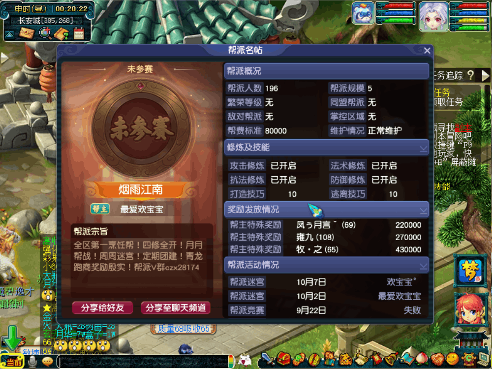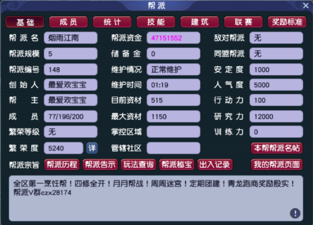 对于多数梦幻西游的小伙伴来说,帮派是一个可以点技能、点修炼、认识新朋友的地方。但对于今天这位帮主来说,本因是方便自己的帮派,却变成了帮助大家的梦想。下面,就给大家分享他的游戏的故事。 一、小小梦想生根发芽 对于【烟雨江南】的帮主来说,这是他第一次创立帮派。一开始,他只是想方便自己点技能、点修炼,但随着帮内聚集了越来越多有梦想的玩家,让帮派不断变强、让大家待得更加自在变成了他梦想。 在这个目标的驱使下,他不断请人跑商、发放青龙奖励,并逐渐加大对帮派的投入。目前,【烟雨江南】已经达到了5级规模,聚集了196位追梦玩家。在这里,他们不仅可以享受帮派带来的方便,还可以畅玩帮派竞赛、帮派迷宫,整体氛围非常好! 二、冲级要的速度,技能研究的快才是王道 【烟雨江南】始建于2024年8月28日,于2024年9月13日成功冲刺五级帮。从时间上来说,【烟雨江南】从建帮到冲上5级,仅用了半个月时间。这份速度背后,不仅有一众帮众、商人的努力,还有帮主大量的资金支持。 【烟雨江南】的帮主觉得,帮派就是让大家开开心心玩梦幻的地方,并不需要条条框框。因此,在他的帮派中,各位成员平等的享受资材、药品和帮派任务。除此之外,为了让大家早日提升技能等级,帮主还开设了多个书院。 要知道,书院越多,帮派日常的维护费用也就越高。在其他帮派都冲等级的情况下,跑商商人处的东西是不够分的。因此,维护费用通常只能依靠大家点技能、点修炼、丢盒子,综合成本极高。 帮主还透露,新区帮派想要发展强盛,离不开大家的支持。因此,在技能选择、帮派建筑方面,都是大家需要什么,他就开什么、研究什么。当一个技能达到一定程度后,他就会根据大家的情况换成另一个。目前,他们正在为了冲刺6级帮而努力。 三、采访小结 总的来说,【烟雨江南】的帮主觉得,帮派本身就是一个大家庭,虽然他建帮的想法源于方便自己,但在建设帮派的过程中,认识了许许多多的小伙伴,他们一起经历了许多风风雨雨,让共同成长成为了帮主的目标。对于他来说,最开心的时刻就是看到帮派成员们在帮派活动中相互帮助,共同进步。他相信,只要大家齐心协力,就没有克服不了的困难,希望【烟雨江南】能够成为一个让成员们感到温暖和归属感的大家庭。 叶子猪梦幻西游玩家群:1群 325703083 (2000人),2群: 330102322 (千人);3群: 424986787 (游戏疑难解答);4群: 330518295 (商人物价);5群: 1063086037 (疑难解答);6群: 1045753197 (春心萌动);7群: 787195090 (活跃互动);8群: 720665628 (全民PK)