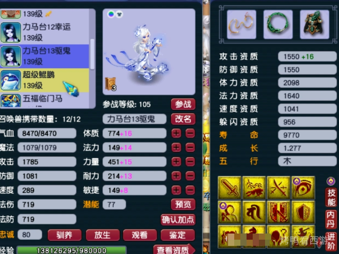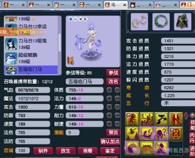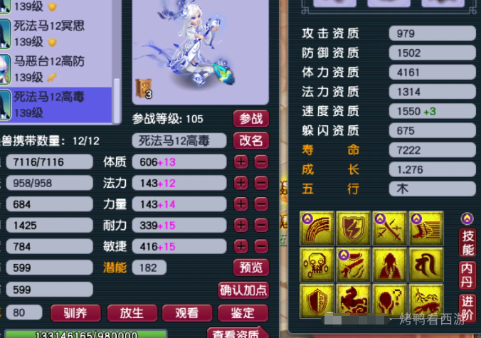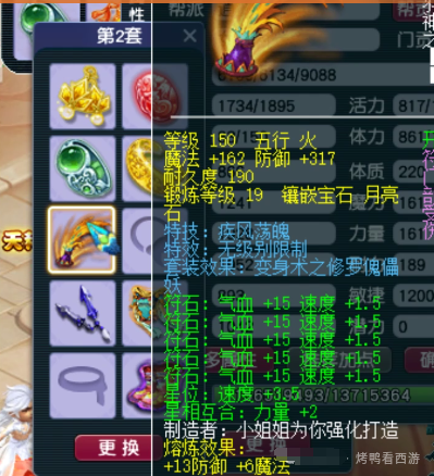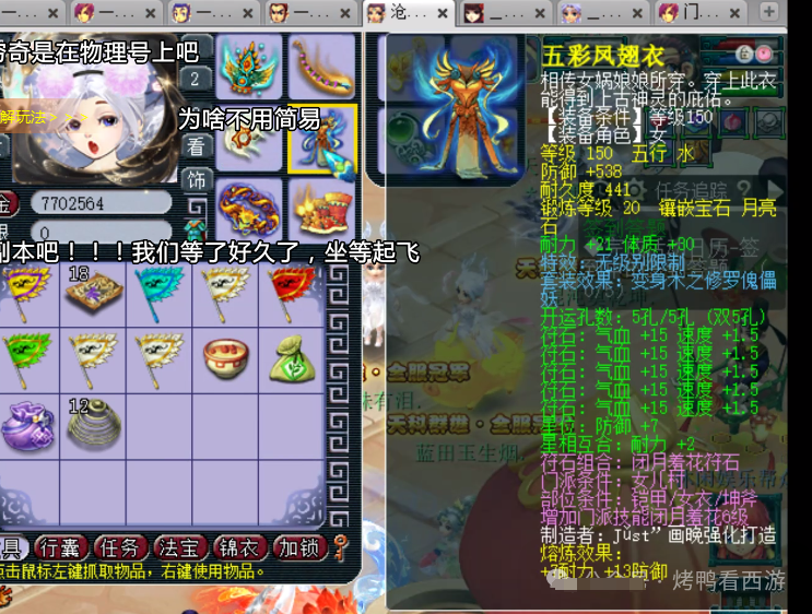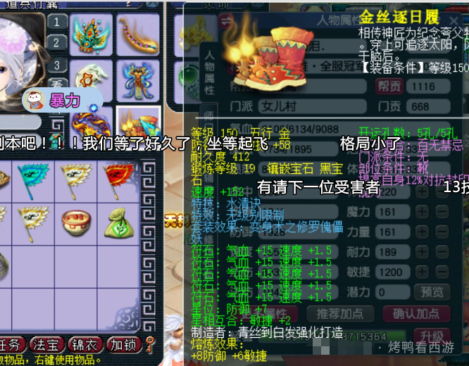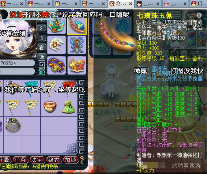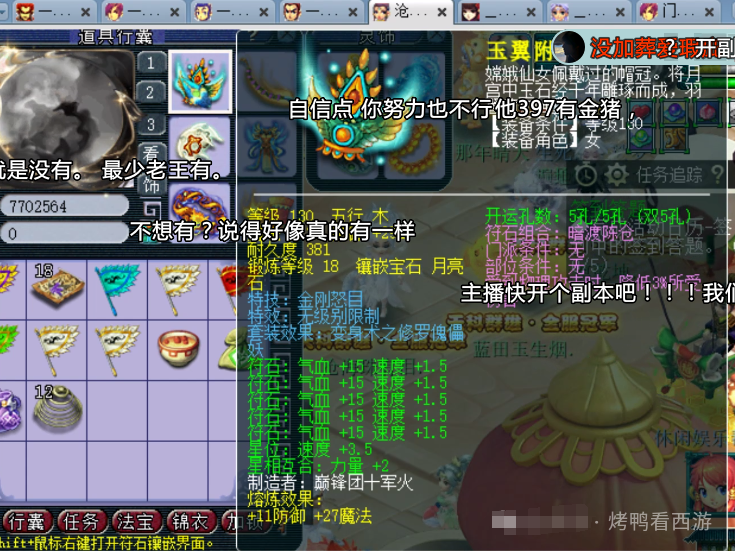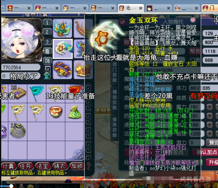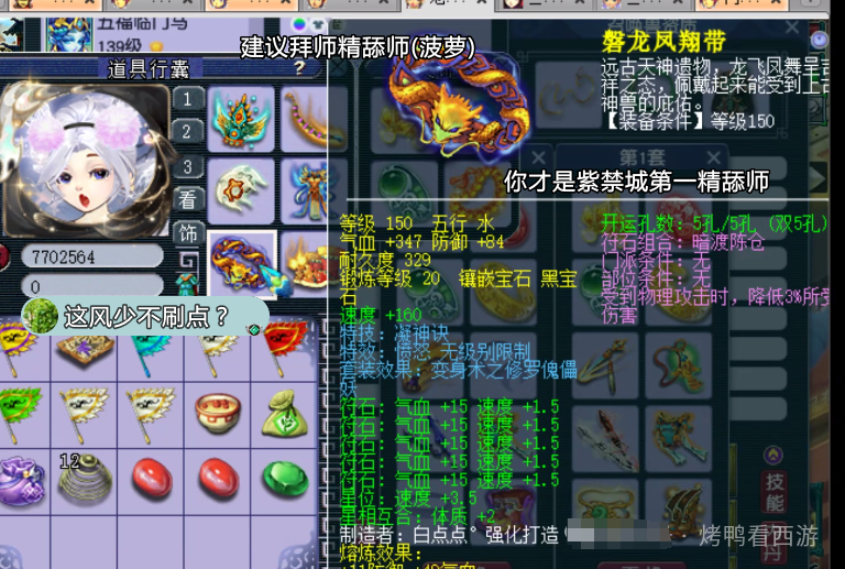 大家好!「烤鸭看西游」每天为你带来不一样的故事,这次老王展示了F哥的129第一女儿村全部硬件。 130无级别金刚怒目女头,18锻月亮石+熔炼总防御305。 130无级别晶清项链,18锻舍利子+熔炼总灵317。 150熔炼后体耐双加58的无级别女衣,20锻月亮石+熔炼总防551。 150无级别水清鞋子,19锻黑宝石离极限只是时间问题。 120神佑笑里双圈,体敏双加54、12锻太阳伤害484。 还有一把武器是120神佑罗汉鞭子。 重量级装备,150无级别腰带愤怒,带凝滞特技还是全服唯一20锻黑宝石。 备用装备有150无级别疾风荡魄女头。 140无级别乾坤挪移鞋子。 150无级别不锈钢女衣,打了19锻舍利子也是秀。 140级主属性34封印,下排三法防97的超级简易手镯。 140级主属性28速度,下排双法防一防御的超级简易佩饰。 后排灵饰就是6速度,都爆了很多点属性。 12JN净台力劈神马画魂。 又一只12JN净台力劈神马画魂。 翻页净台力劈神马画魂。 12JN净台力劈神马月魅。 2只12JN4特殊血画魂,太豪横了 传说中的全服第一23技能泪妖,技能秀到没朋友。 叶子猪梦幻西游玩家群:1群 325703083 (2000人),2群: 330102322 (千人);3群: 424986787 (游戏疑难解答);4群: 330518295 (商人物价);5群: 1063086037 (疑难解答);6群: 1045753197 (春心萌动);7群: 787195090 (活跃互动);8群: 720665628 (全民PK)