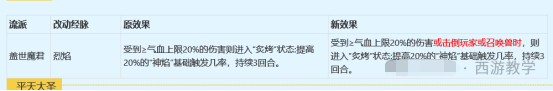 大家好,我是无邪,资深老玩家给你带来梦幻故事!今天总结了四月大改20门派所有改动最详细的介绍。 大唐官府 大唐官府PK加强增加新技能斩草除根,单挑能力进一步提升。 方寸山 魔方寸山落雷符秒5的几率增加5%。 化生寺 化生寺主要改法系玩法,法宝调整息息相关。 女儿村 女儿村的物理流派改动较多,值得注意。 神木林 没啥变化。 天机城 天机城改动较多,法宝也有调整。 阴曹地府 没啥变化。 魔王寨 没啥变化。 狮驼岭 狮驼岭改了魔息和展翅,好像有点影响。 盘丝洞 没啥变化。 无底洞 无底洞大招增加10%固伤暴击几率。 女魃墓 没啥变化。 天宫 魔天宫史诗级加强,天上天神护体套可开局秒6! 龙宫 没啥变化。 五庄观 五庄观新增师门技能气御剑身,可以增加护盾值。 普陀山 力普陀大削伤害。 凌波城 凌波城改动主要与战意有关,物理系整体清宠能力都下降了。 花果山 花果山新增大圣降临技能,强化你的下个如意神通。 九黎城 九黎城惨遭大削,以后难以多开了。 东海渊 东海渊有点逗了,改个经脉名字也算改。 其余改动总结 1.新增8个特技,分别是增加己方的单人跟群体得法伤、法防、降低敌方单人跟群体的法伤、法防。 2.只有八个满级的四级法宝可以进行附灵,附灵的法宝升级需要海量经验,碧藕价格要飞涨,崇明战鼓平常不会掉法宝灵气,但是辅灵后会掉法宝灵气。 3.可以用钱洗练命魂之玉,每次100万切换命魂之玉的基础属性,用经验修炼命魂之玉的等级有了命魂之玉以后在日常战斗中,新增一个奇袭按钮有概率让玩家在1回合内释放2次操作,例如同时使用特技和师门技能。可以在女娲神使这里更换特技跟药品。 4.新出天神护体套装,可以让魔天宫第一回合秒6 5.法宝调整:仅限无量尊者流派,慈悲只增加法伤,不增加恢复气血效果; 在五行咒师的流派下,法宝普渡,可以同时对两个目标释放普度众生变成了紧箍咒。 叶子猪梦幻西游玩家群:1群 325703083 (2000人),2群: 330102322 (千人);3群: 424986787 (游戏疑难解答);4群: 330518295 (商人物价);5群: 1063086037 (疑难解答);6群: 1045753197 (春心萌动);7群: 787195090 (活跃互动);8群: 720665628 (全民PK) [编辑:百晓生]