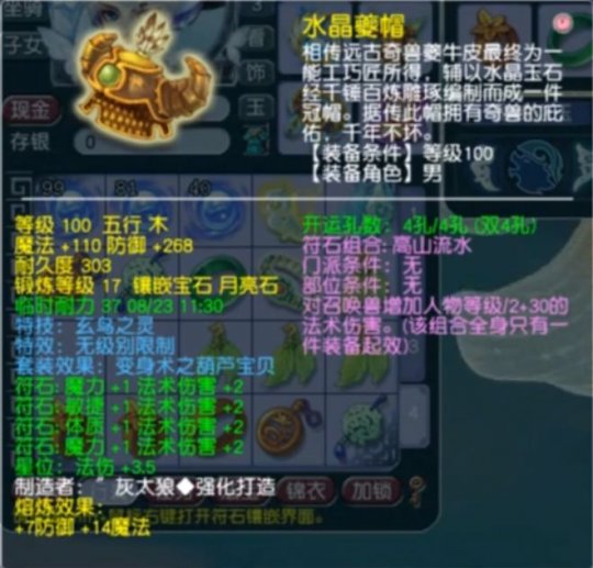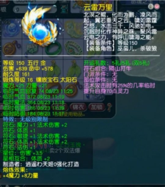 很久没有展示过精锐组玩家的风采啦! 今天,小美将为大家展示一位拥有1750极高法伤的同时竟然还有11.59%的法爆几率的精锐魔王!咱就说,如果遮住等级,你敢信这是69级的面板属性吗! 话不多说,来吧!展示! 【装备展示】 综合防御275,镶嵌17锻月亮石,附加特技玄鸟之灵的100级无级别头盔。 综合灵力331,镶嵌17锻舍利子的150级无级别项链。 综合伤害(不计算命中)639,力魔双加58,镶嵌16锻太阳石的150级无级别武器。 基础防御258,体魔双加48,镶嵌17锻舍利子的130级无级别铠甲。 基础防御97,综合气血1028,镶嵌17锻光芒石的140级无级别腰带。 基础防御95,基础敏捷55,镶嵌15锻黑宝石的140级无级别鞋子。 基础防御63,基础气血263,镶嵌15锻黑宝石,附加特技罗汉金钟的100级无级别腰带。 【灵饰展示】 “法爆+法爆+法伤”属性组合的80级超级简易耳饰。 “法伤+法伤+法伤”属性组合的60级戒指。 “防御+防御+抗封”属性组合的80级超级简易手镯。 “防御+防御+抗封”属性组合的80级超级简易配饰。 【命魂之玉】 【上古玉魄·阳】选择了“法伤+法伤+法伤”的属性组合,镶嵌了12锻五色灵尘。 【上古玉魄·阴】选择了“气血+抗封+防御”的属性组合,附带2.2%奇袭法术,镶嵌了10段五色灵尘。 【宝宝展示】 9技能净台金蝉配速雷鸟人 10技能净台死亡金蝉夜舞配速雷鸟人 12技能壁垒力劈雷鸟人 9技能净台凝光金蝉配速雷鸟人 9技能出其须弥雷鸟人 好啦,今天的展示就到这里,咱评论区不见不散哦~ 叶子猪梦幻西游玩家群:1群 325703083 (2000人),2群: 330102322 (千人);3群: 424986787 (游戏疑难解答);4群: 330518295 (商人物价);5群: 1063086037 (疑难解答);6群: 1045753197 (春心萌动);7群: 787195090 (活跃互动);8群: 720665628 (全民PK)