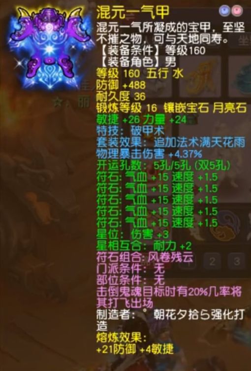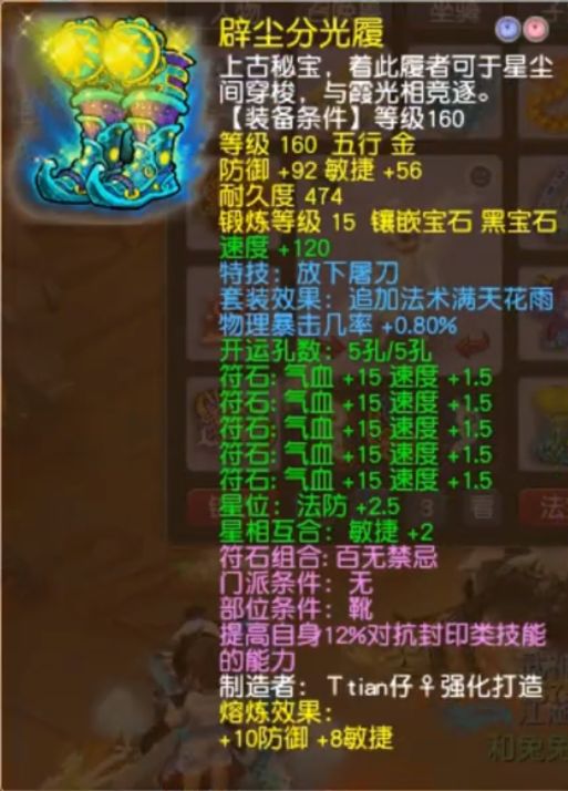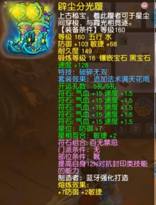 纵观梦幻各大物理门派,要说单体爆发最高的还得是叠满“归真”状态的万寿五庄。在刚刚结束的230届武神坛之战中,灵隐寺凭借双五庄体系大放异彩,万寿五庄在赛场上凌风而战,锋芒如切金断玉,势不可挡。 今天,就让我们一起欣赏欣赏,灵隐寺万寿五庄的风采吧! 【装备展示】 综合伤害(计算命中、附加属性和宝石属性)高达1076的160级专用武器。 各位玩家注意,这把武器的综合伤害是大家口中的“纯伤”,“纯伤”达到1076的专用武器放眼三界可都是凤毛麟角哦。 基础防御108,镶嵌17锻红玛瑙,附加特技野兽之力的160级精致头盔。 综合防御107,综合气血416,镶嵌17锻黑宝石的160级愤怒、精致腰带。 基础防御110,基础敏捷70,镶嵌16锻黑宝石,附加特技破碎无双的160级鞋子。 这双鞋子虽没有精致特效,但两项基础属性非常出色(武神坛赛场上,80%160级鞋子的敏捷熔炼为66点)。 综合灵力328,镶嵌16锻舍利子,附加特技晶清诀的160级项链。 综合防御509,力敏双加54,镶嵌16锻月亮石,附加特技破甲术的160级铠甲。 全新特技时代,辅助门派的特技位置显得捉襟见肘,因此,物理门派帮忙分担部分“小特技”是非常必要的。除了这件衣服,灵隐寺的万寿五庄还准备了其他“小特技”装备留作备用。 综合灵力314,镶嵌14锻舍利子,附带0.79%穿刺特性,附加特技光辉之甲的160级项链。 基础防御102,基础敏捷64,镶嵌15锻黑宝石,附带0.80%物理暴击几率特性,附加特技放下屠刀的160级鞋子。 【灵饰展示】 灵隐寺万寿五庄的前排灵饰选择了“7伤害”的属性组合,镶嵌了11锻星辉石。 灵隐寺万寿五庄的后排灵饰选择了“2气血+4防御”的属性组合,配饰镶嵌了11锻星辉石,手镯镶嵌了10锻星辉石。 关于钟灵石套装的选择,他选择了更利于赛场竞速的健步如飞。这主要是为了在实战中利用速度优势配合破碎无双针对九黎。 【命魂之玉展示】 【上古玉魄·阳】的属性组合为“伤害+伤害+伤害”,镶嵌了12锻五色灵尘。 【上古玉魄·阴】的属性组合为“防御+防御+气血”并附带2.9%物伤化劲,镶嵌了10锻五色灵尘。 【宝宝展示】 超级隐身+超级合纵的林中鸟隐攻翻页魔童 9技能高速四轮须弥法谛听 翻页死亡法防神马童子 10技能净台死亡法防神马童子 8技能净台法防凝光童子 好啦,今天的展示就到这里,咱评论区不见不散哦。 叶子猪梦幻西游玩家群:1群 325703083 (2000人),2群: 330102322 (千人);3群: 424986787 (游戏疑难解答);4群: 330518295 (商人物价);5群: 1063086037 (疑难解答);6群: 1045753197 (春心萌动);7群: 787195090 (活跃互动);8群: 720665628 (全民PK)