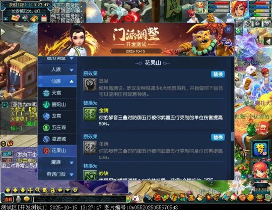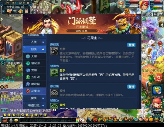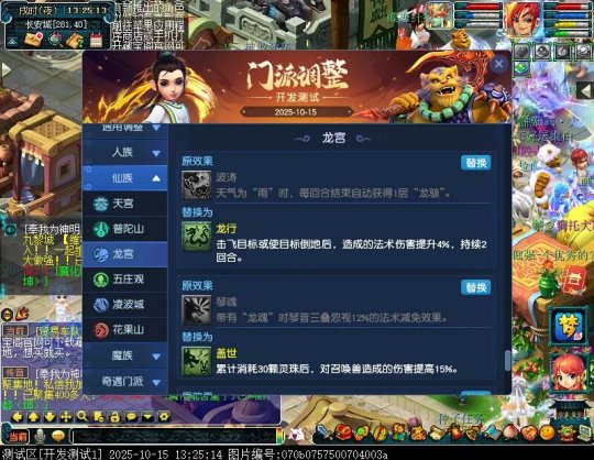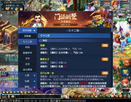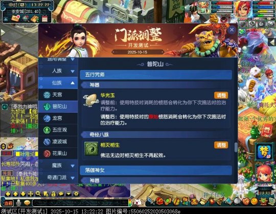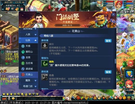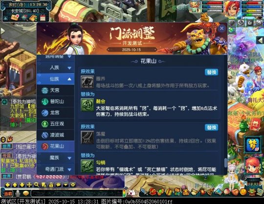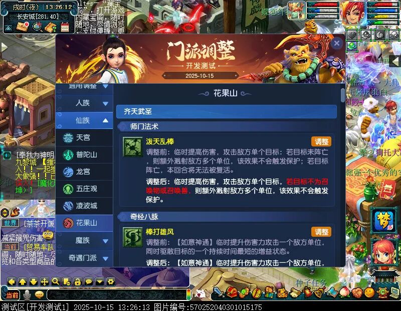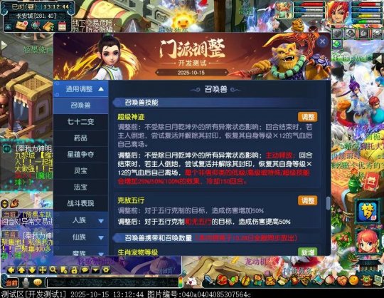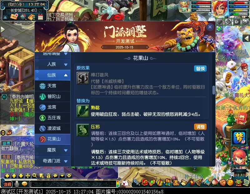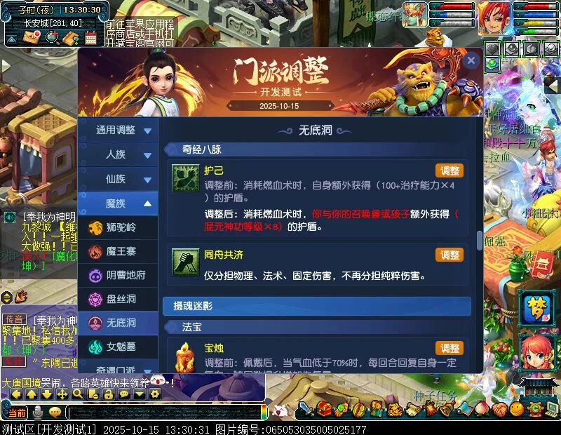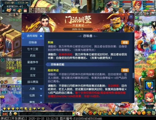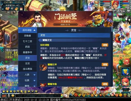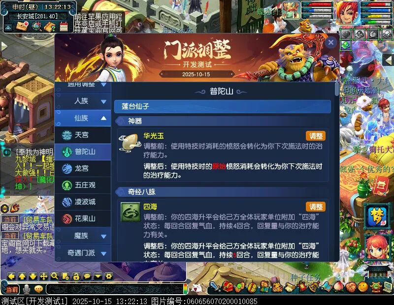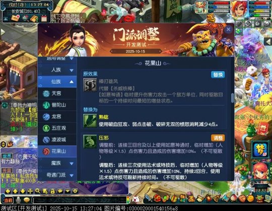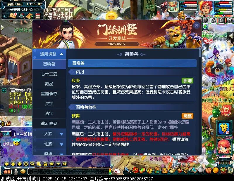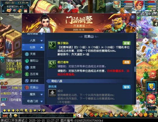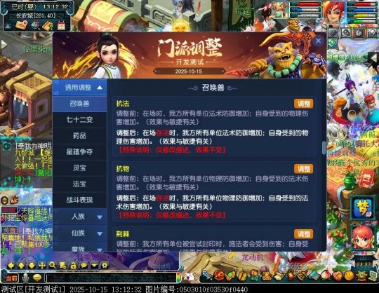 10月15日12:00,门派调整已在开发服放出,这次官方直接把调整内容以汇总的形式呈现了出来,玩家一进入游戏,立刻可以看到改动的完整版。这对于探索者而言,是个利好的改动,不然每次调整要不停对比原版,脑袋都要炸了!通过粗略浏览,这次主改动的门派有龙宫、花果山、天宫等门派,同时新增了不少防御类型的法宝、小幅改动灵宝等通用调整。 大家可以保存此页面,按CTRL+F输入关键字,即可快速跳转到你关注的门派区块。但最终改动请以全服放出为准。 召唤兽 七十二变 药品 星蕴争夺 灵宝 法宝 战斗表现 东海渊 九黎城 大唐官府 化生寺 女儿村 方寸山 神木林 天机城 天宫 普陀山 龙宫 五庄观 凌波城 花果山 狮驼岭 魔王寨 阴曹地府 盘丝洞 无底洞 女魃墓 叶子猪梦幻西游玩家群:1群 325703083 (2000人),2群: 330102322 (千人);3群: 424986787 (游戏疑难解答);4群: 330518295 (商人物价);5群: 1063086037 (疑难解答);6群: 1045753197 (春心萌动);7群: 787195090 (活跃互动);8群: 720665628 (全民PK)
