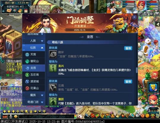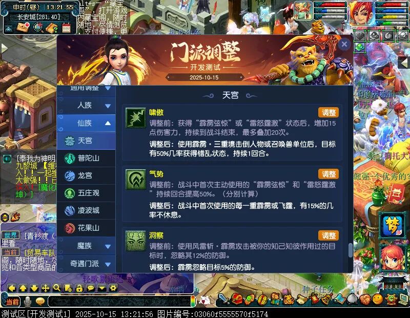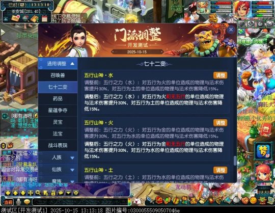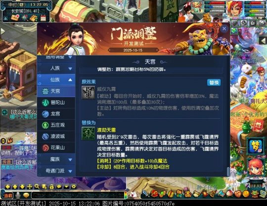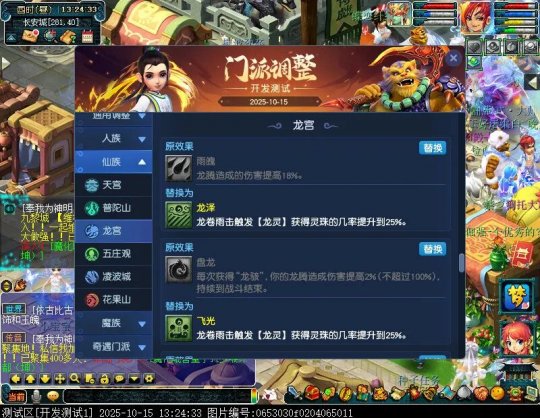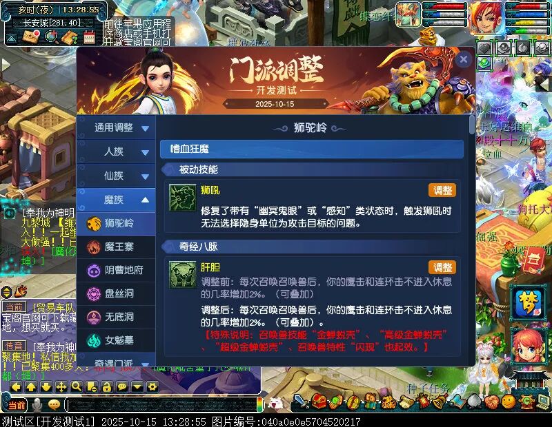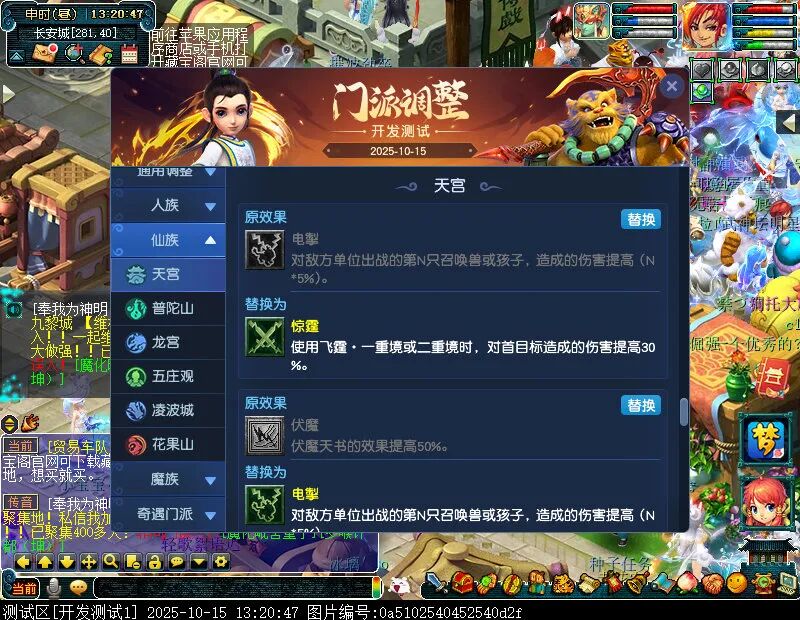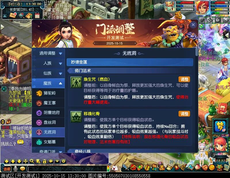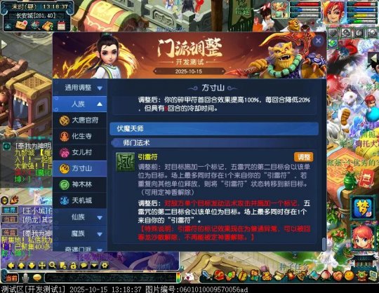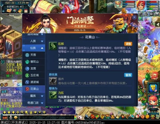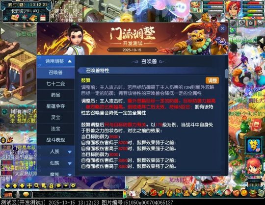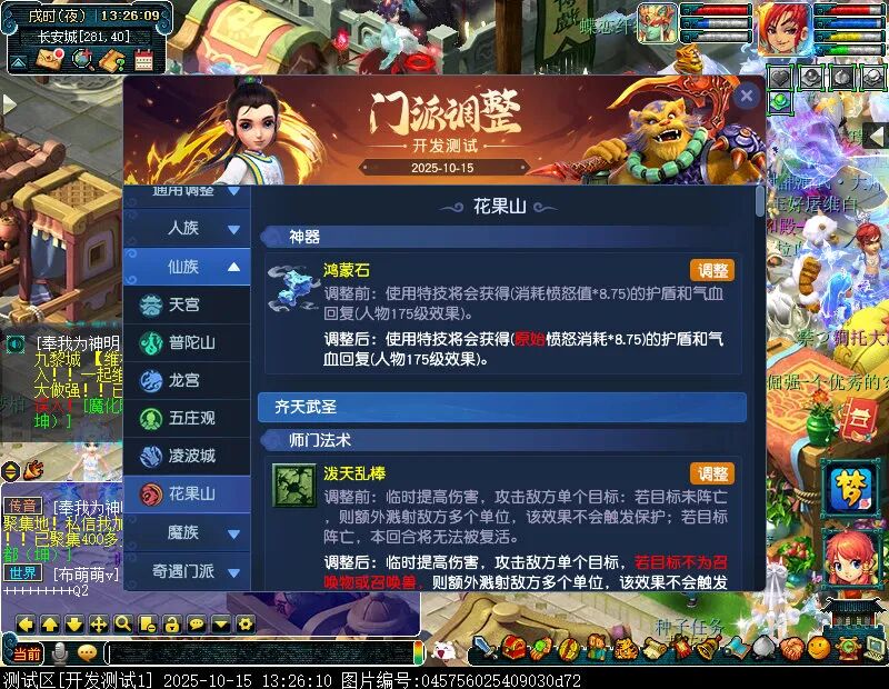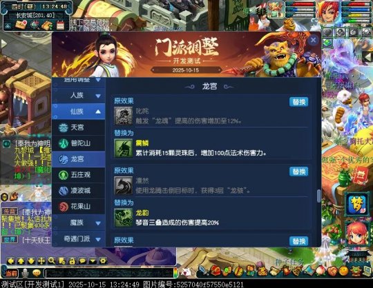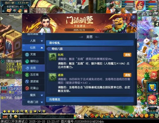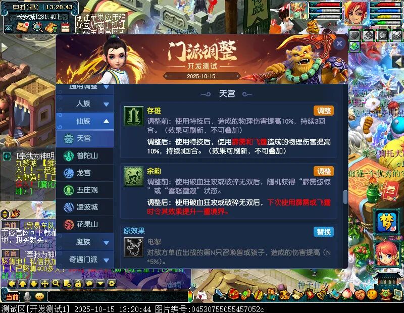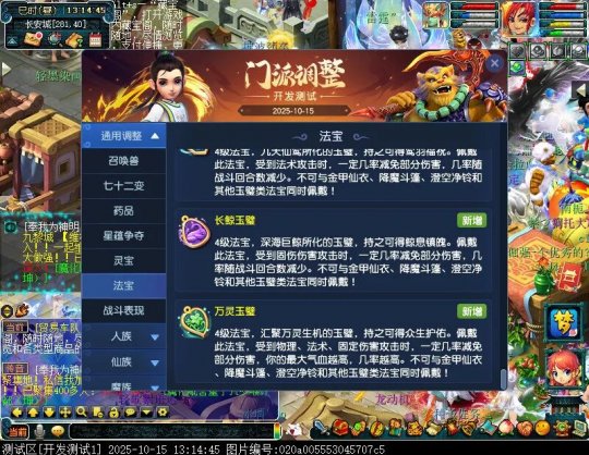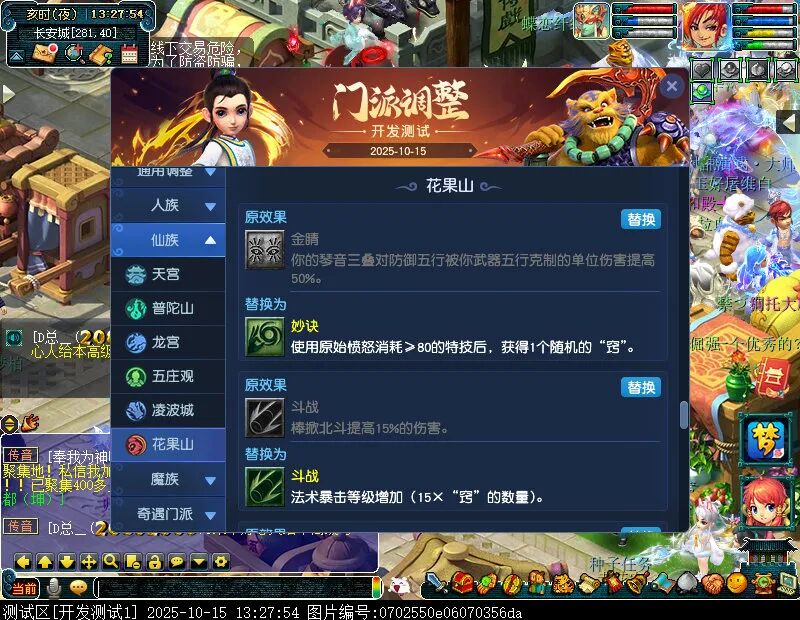 10月15日12:00,门派调整已在开发服放出,这次官方直接把调整内容以汇总的形式呈现了出来,玩家一进入游戏,立刻可以看到改动的完整版。这对于探索者而言,是个利好的改动,不然每次调整要不停对比原版,脑袋都要炸了!通过粗略浏览,这次主改动的门派有龙宫、花果山、天宫等门派,同时新增了不少防御类型的法宝、小幅改动灵宝等通用调整。 大家可以保存此页面,按CTRL+F输入关键字,即可快速跳转到你关注的门派区块。但最终改动请以全服放出为准。 召唤兽 七十二变 药品 星蕴争夺 灵宝 法宝 战斗表现 东海渊 九黎城 大唐官府 化生寺 女儿村 方寸山 神木林 天机城 天宫 普陀山 龙宫 五庄观 凌波城 花果山 狮驼岭 魔王寨 阴曹地府 盘丝洞 无底洞 女魃墓 叶子猪梦幻西游玩家群:1群 325703083 (2000人),2群: 330102322 (千人);3群: 424986787 (游戏疑难解答);4群: 330518295 (商人物价);5群: 1063086037 (疑难解答);6群: 1045753197 (春心萌动);7群: 787195090 (活跃互动);8群: 720665628 (全民PK)