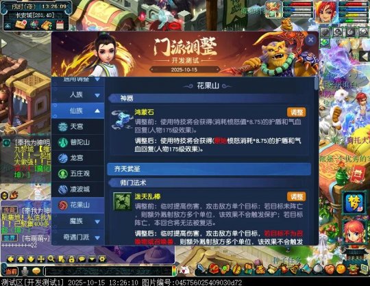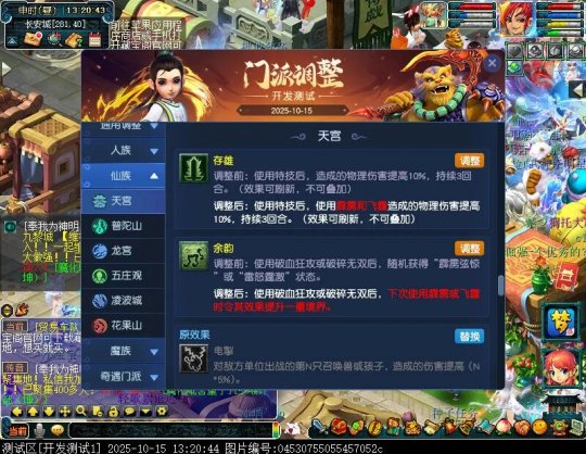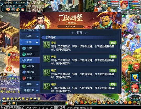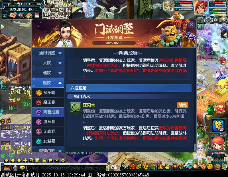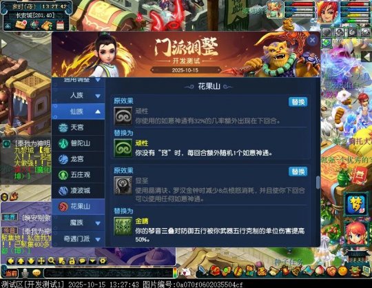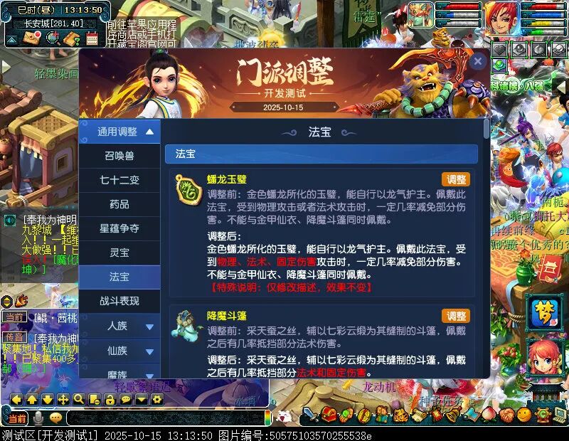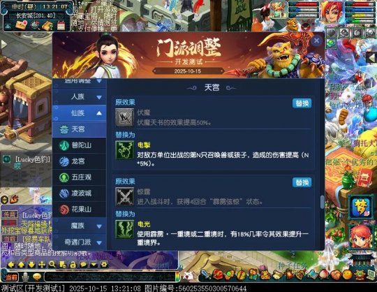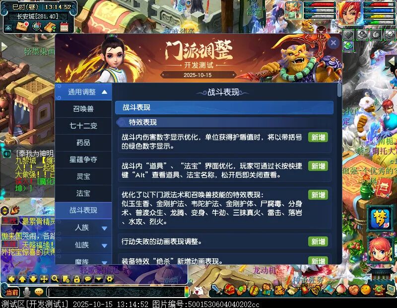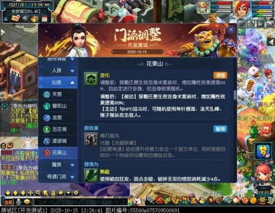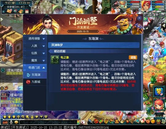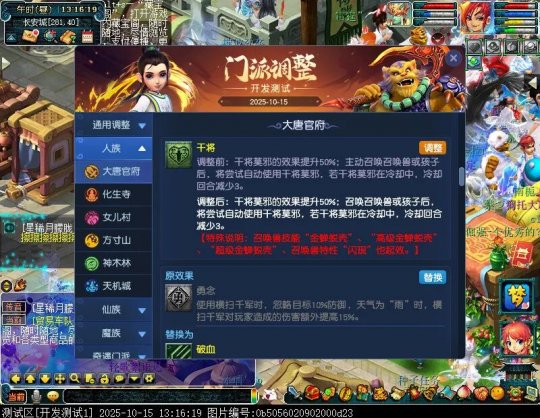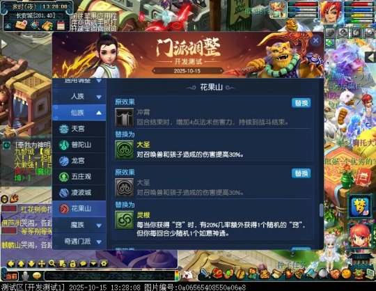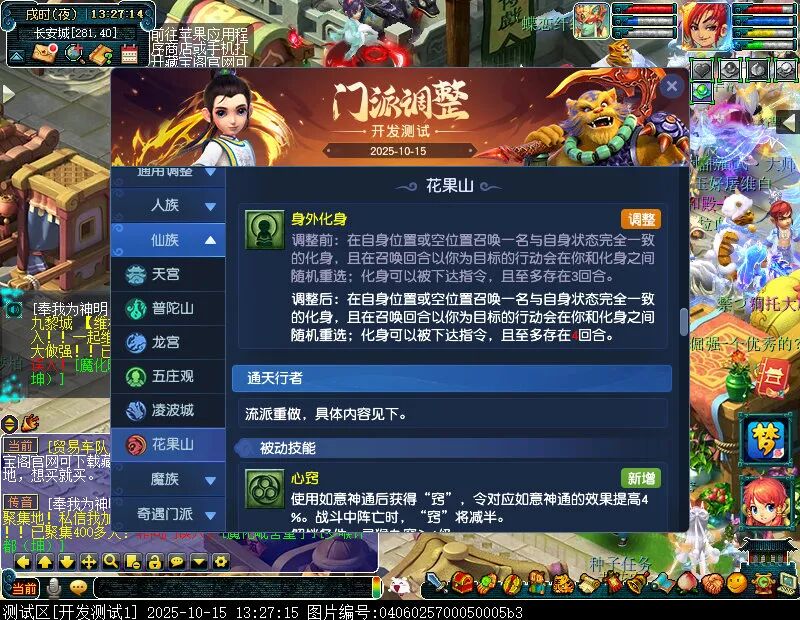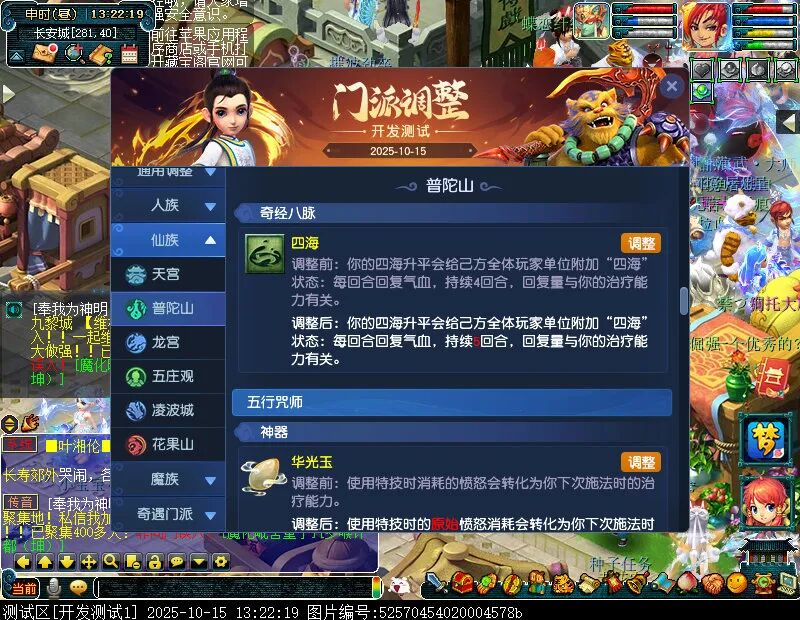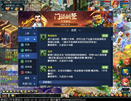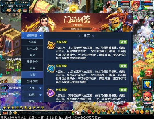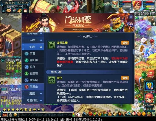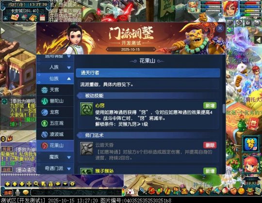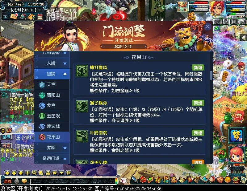 10月15日12:00,门派调整已在开发服放出,这次官方直接把调整内容以汇总的形式呈现了出来,玩家一进入游戏,立刻可以看到改动的完整版。这对于探索者而言,是个利好的改动,不然每次调整要不停对比原版,脑袋都要炸了!通过粗略浏览,这次主改动的门派有龙宫、花果山、天宫等门派,同时新增了不少防御类型的法宝、小幅改动灵宝等通用调整。 大家可以保存此页面,按CTRL+F输入关键字,即可快速跳转到你关注的门派区块。但最终改动请以全服放出为准。 召唤兽 七十二变 药品 星蕴争夺 灵宝 法宝 战斗表现 东海渊 九黎城 大唐官府 化生寺 女儿村 方寸山 神木林 天机城 天宫 普陀山 龙宫 五庄观 凌波城 花果山 狮驼岭 魔王寨 阴曹地府 盘丝洞 无底洞 女魃墓 叶子猪梦幻西游玩家群:1群 325703083 (2000人),2群: 330102322 (千人);3群: 424986787 (游戏疑难解答);4群: 330518295 (商人物价);5群: 1063086037 (疑难解答);6群: 1045753197 (春心萌动);7群: 787195090 (活跃互动);8群: 720665628 (全民PK)