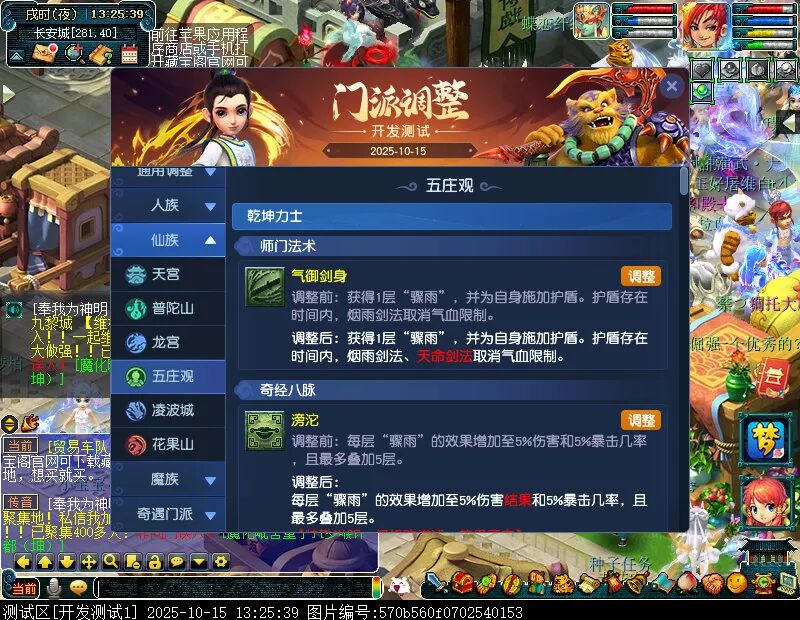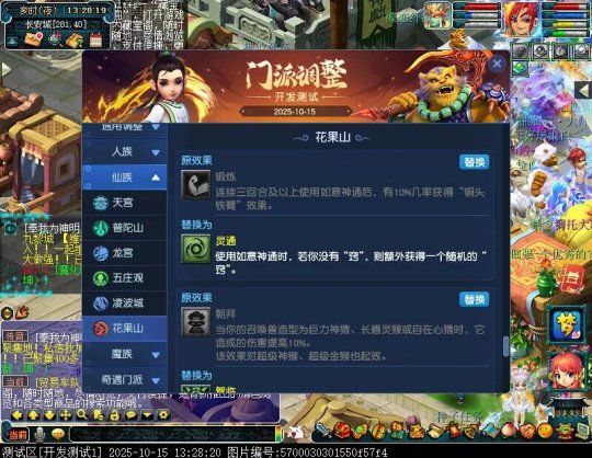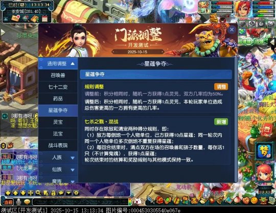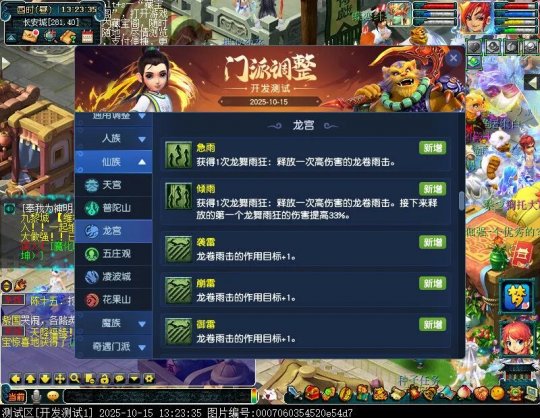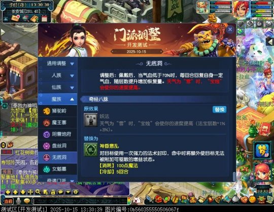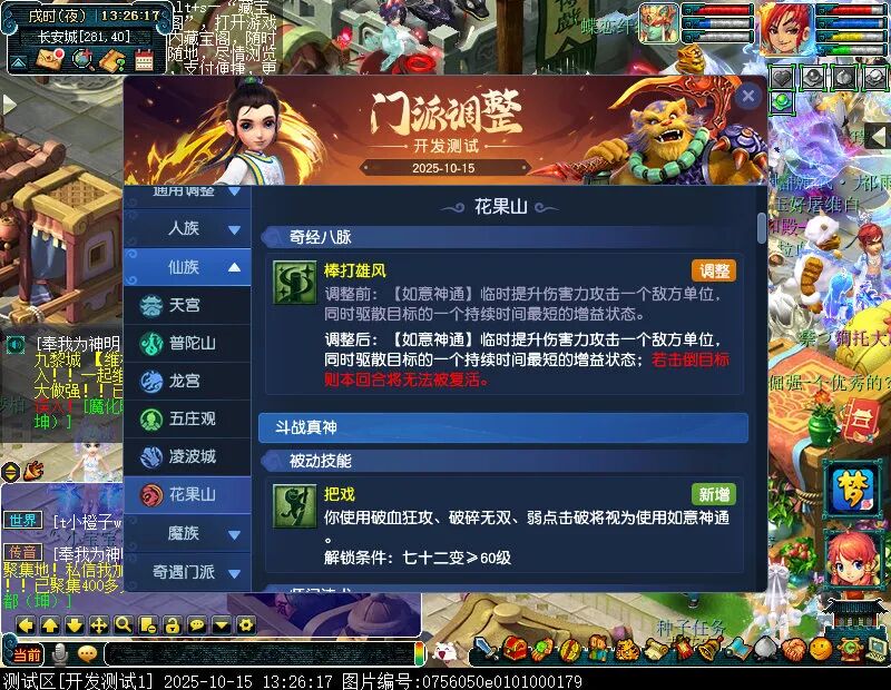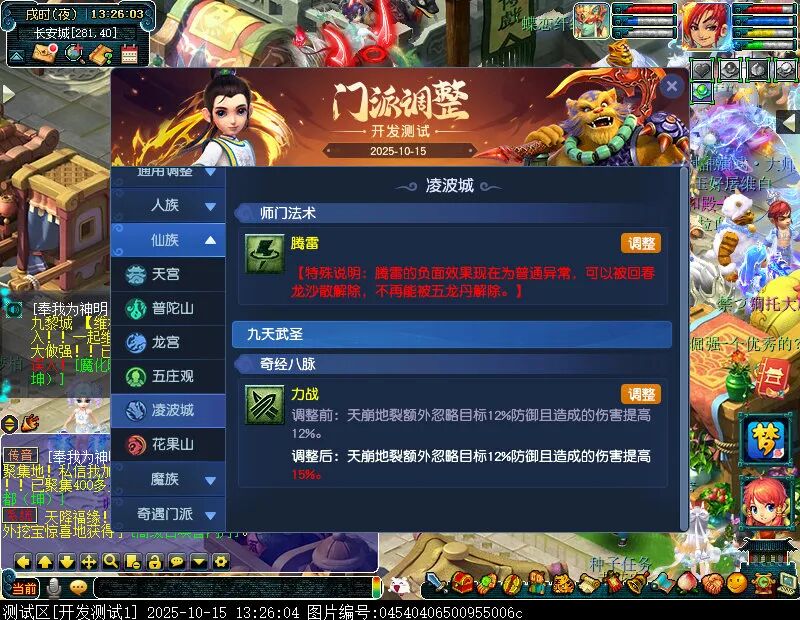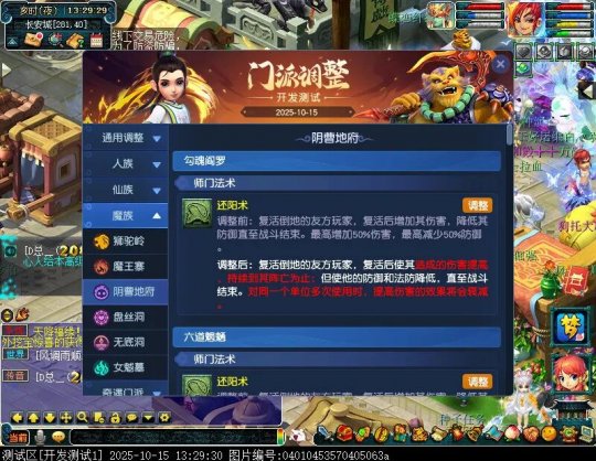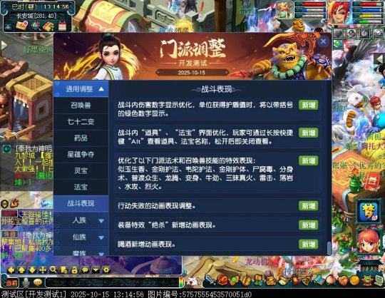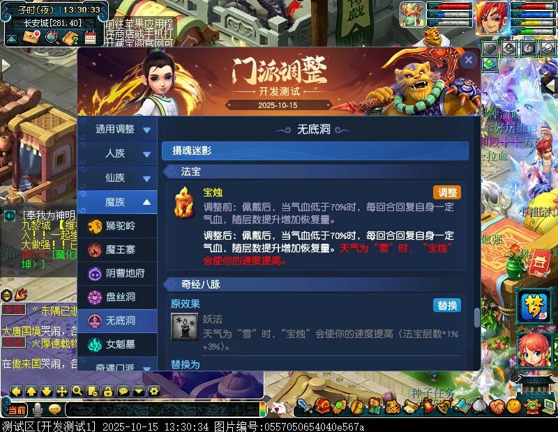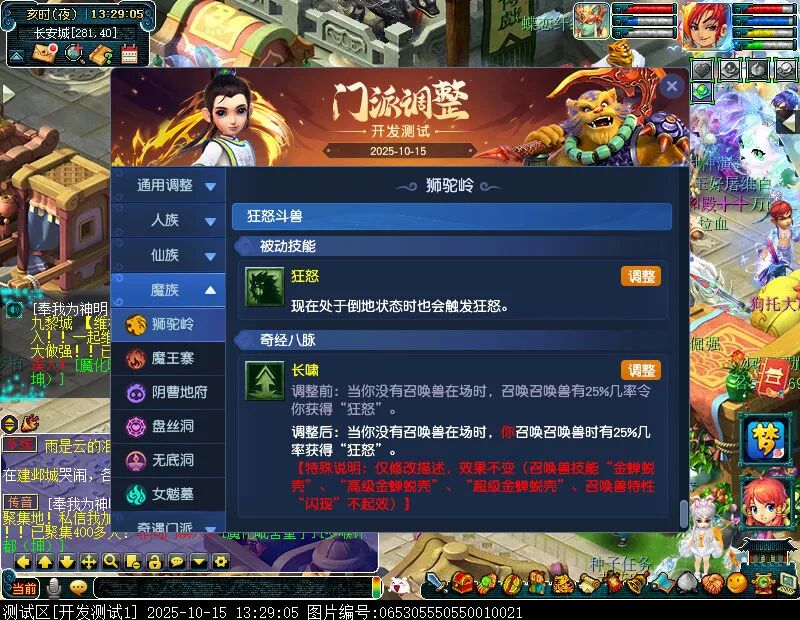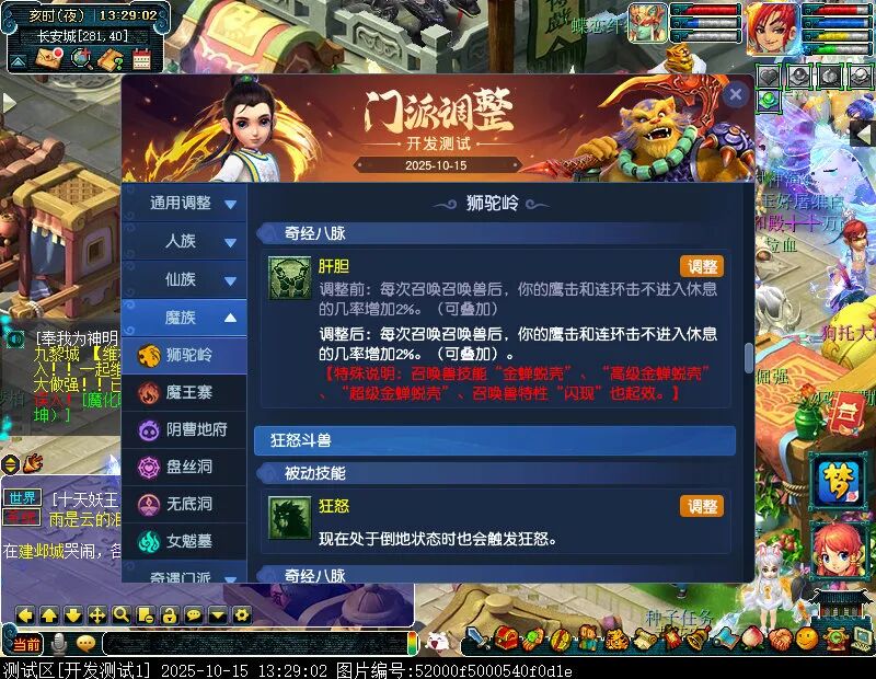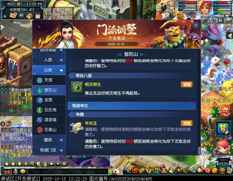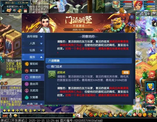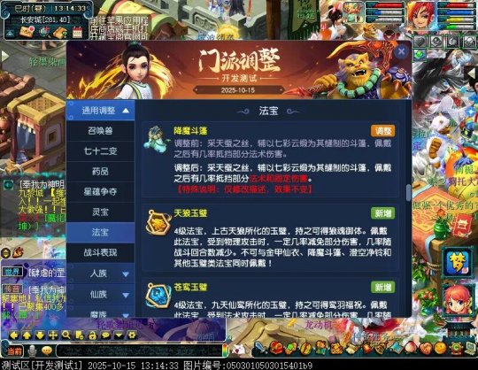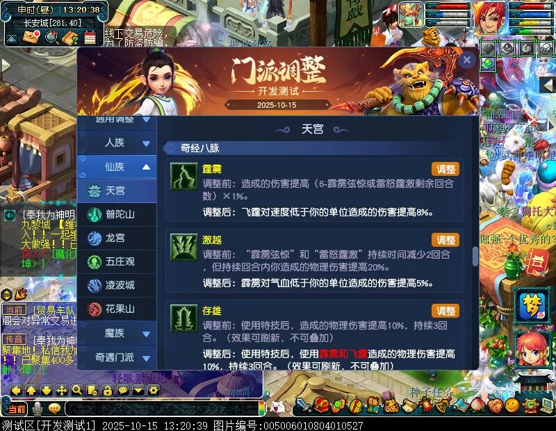 10月15日12:00,门派调整已在开发服放出,这次官方直接把调整内容以汇总的形式呈现了出来,玩家一进入游戏,立刻可以看到改动的完整版。这对于探索者而言,是个利好的改动,不然每次调整要不停对比原版,脑袋都要炸了!通过粗略浏览,这次主改动的门派有龙宫、花果山、天宫等门派,同时新增了不少防御类型的法宝、小幅改动灵宝等通用调整。 大家可以保存此页面,按CTRL+F输入关键字,即可快速跳转到你关注的门派区块。但最终改动请以全服放出为准。 召唤兽 七十二变 药品 星蕴争夺 灵宝 法宝 战斗表现 东海渊 九黎城 大唐官府 化生寺 女儿村 方寸山 神木林 天机城 天宫 普陀山 龙宫 五庄观 凌波城 花果山 狮驼岭 魔王寨 阴曹地府 盘丝洞 无底洞 女魃墓 叶子猪梦幻西游玩家群:1群 325703083 (2000人),2群: 330102322 (千人);3群: 424986787 (游戏疑难解答);4群: 330518295 (商人物价);5群: 1063086037 (疑难解答);6群: 1045753197 (春心萌动);7群: 787195090 (活跃互动);8群: 720665628 (全民PK)