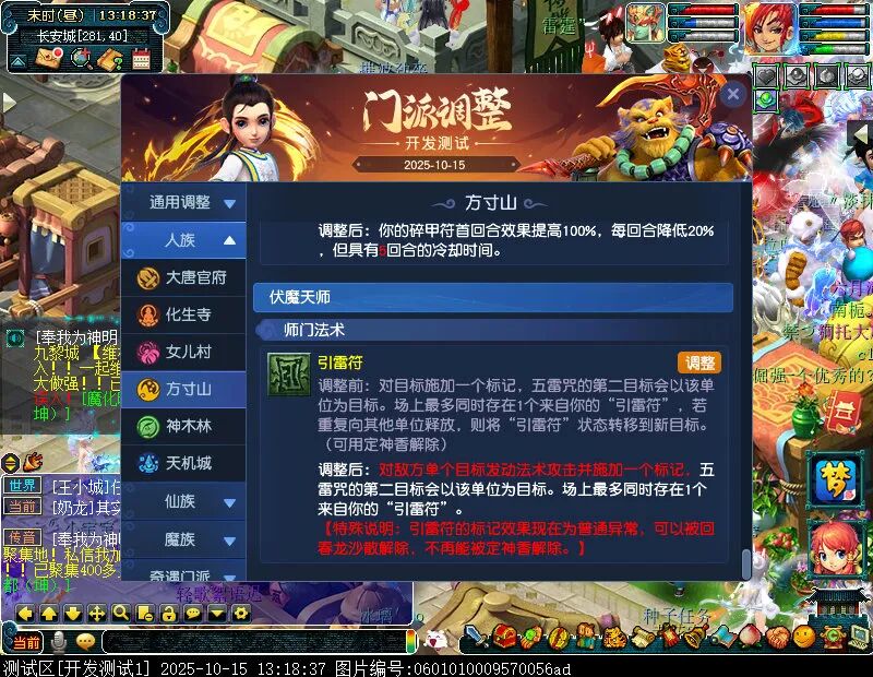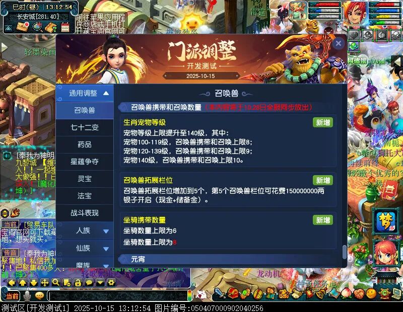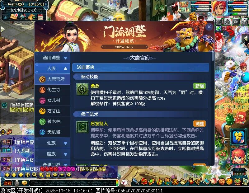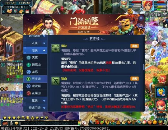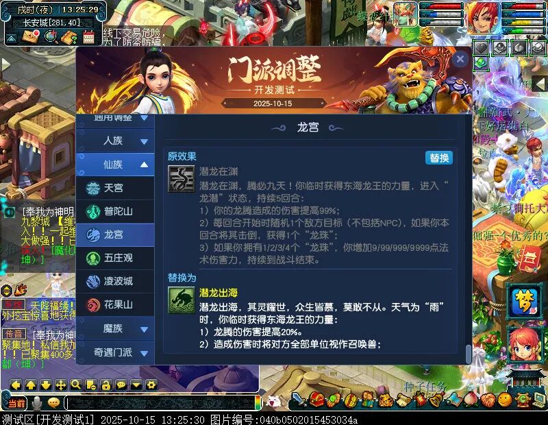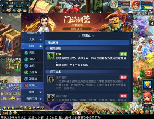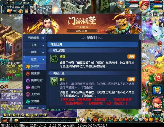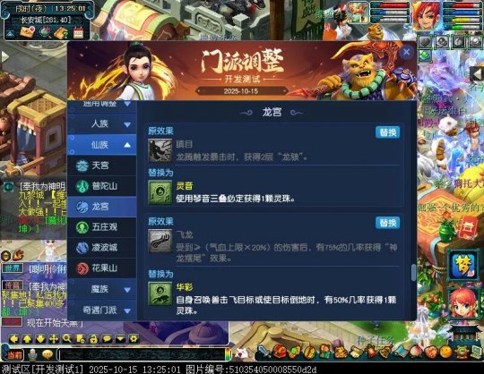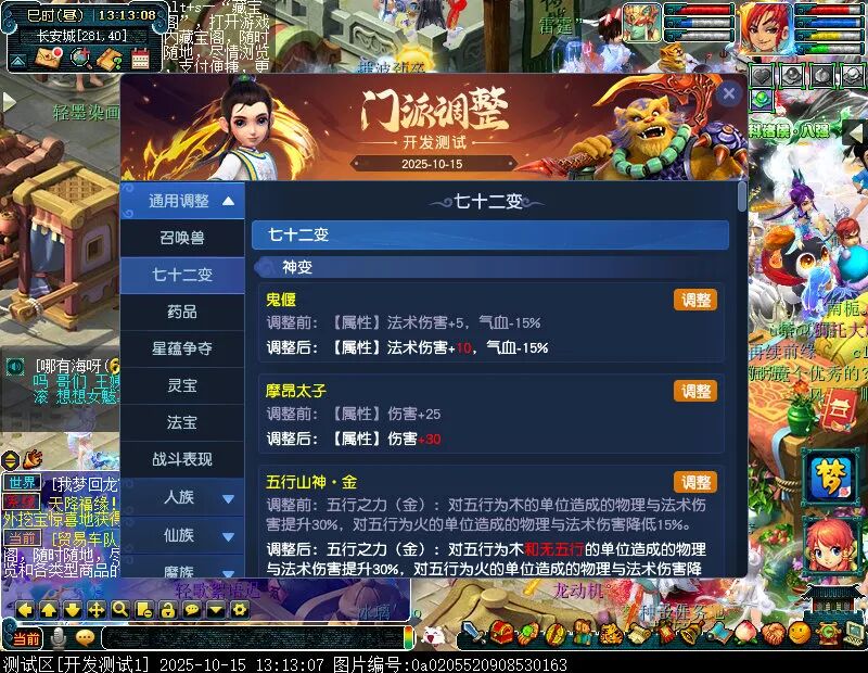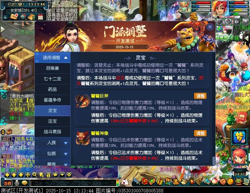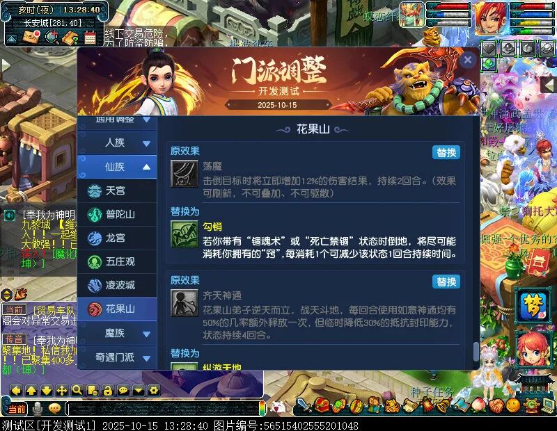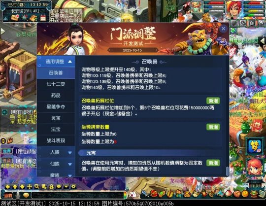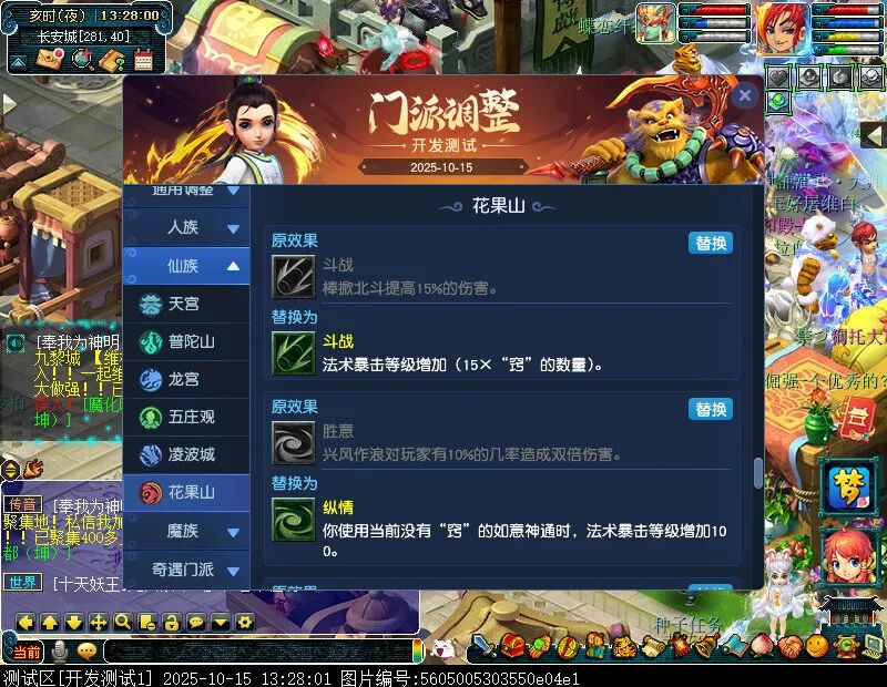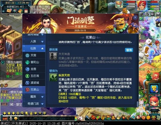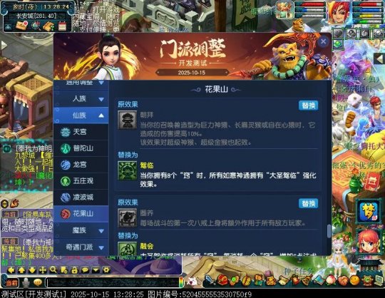 10月15日12:00,门派调整已在开发服放出,这次官方直接把调整内容以汇总的形式呈现了出来,玩家一进入游戏,立刻可以看到改动的完整版。这对于探索者而言,是个利好的改动,不然每次调整要不停对比原版,脑袋都要炸了!通过粗略浏览,这次主改动的门派有龙宫、花果山、天宫等门派,同时新增了不少防御类型的法宝、小幅改动灵宝等通用调整。 大家可以保存此页面,按CTRL+F输入关键字,即可快速跳转到你关注的门派区块。但最终改动请以全服放出为准。 召唤兽 七十二变 药品 星蕴争夺 灵宝 法宝 战斗表现 东海渊 九黎城 大唐官府 化生寺 女儿村 方寸山 神木林 天机城 天宫 普陀山 龙宫 五庄观 凌波城 花果山 狮驼岭 魔王寨 阴曹地府 盘丝洞 无底洞 女魃墓 叶子猪梦幻西游玩家群:1群 325703083 (2000人),2群: 330102322 (千人);3群: 424986787 (游戏疑难解答);4群: 330518295 (商人物价);5群: 1063086037 (疑难解答);6群: 1045753197 (春心萌动);7群: 787195090 (活跃互动);8群: 720665628 (全民PK)