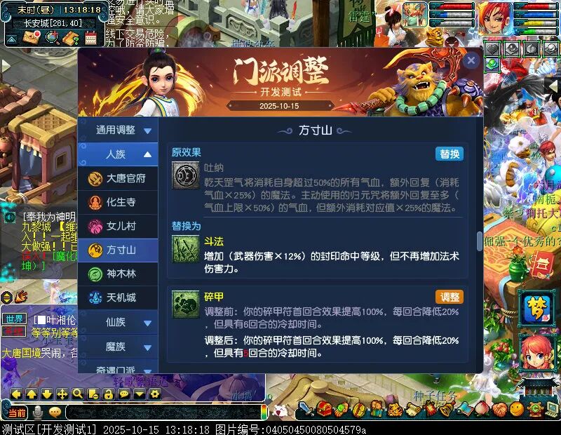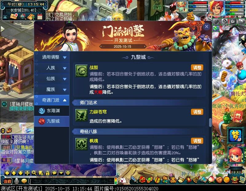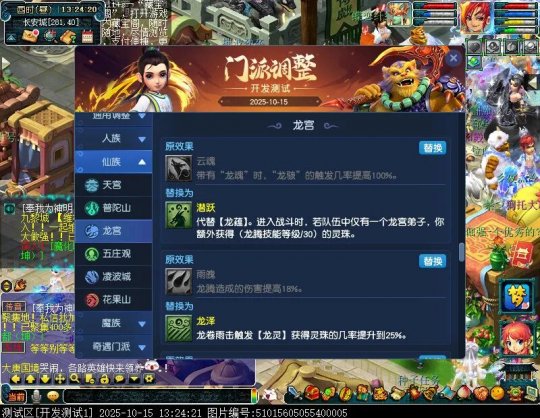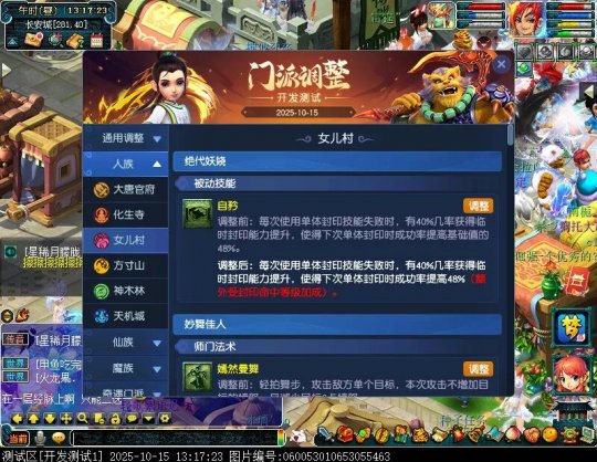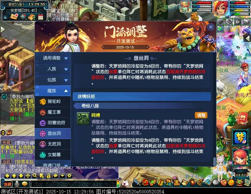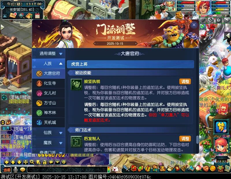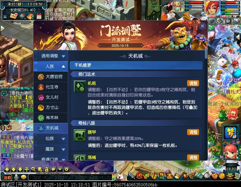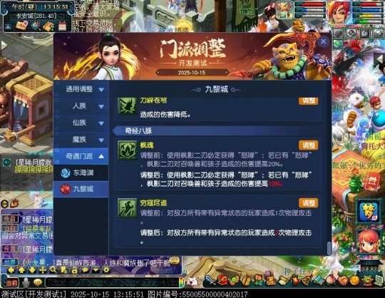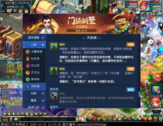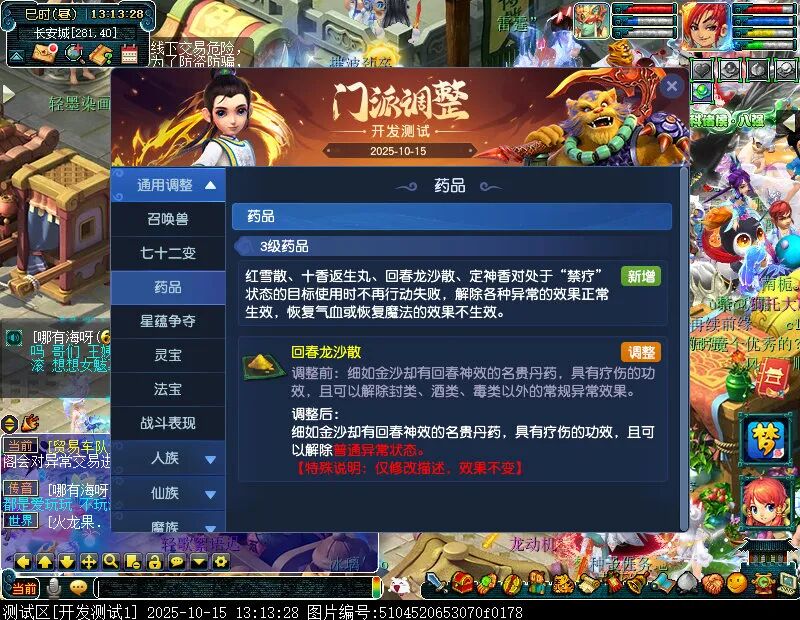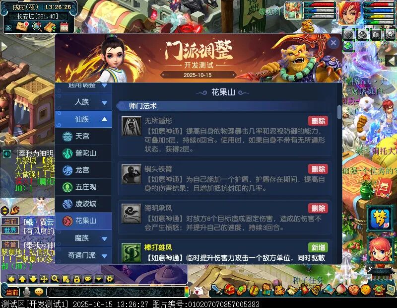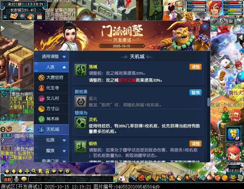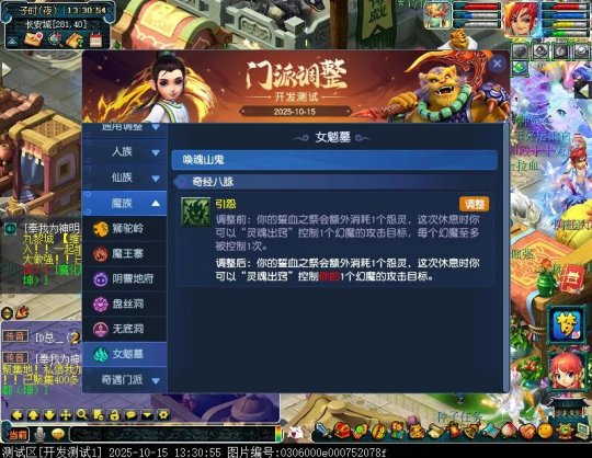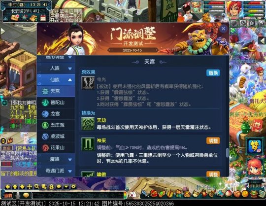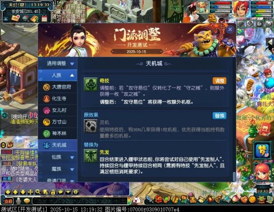 10月15日12:00,门派调整已在开发服放出,这次官方直接把调整内容以汇总的形式呈现了出来,玩家一进入游戏,立刻可以看到改动的完整版。这对于探索者而言,是个利好的改动,不然每次调整要不停对比原版,脑袋都要炸了!通过粗略浏览,这次主改动的门派有龙宫、花果山、天宫等门派,同时新增了不少防御类型的法宝、小幅改动灵宝等通用调整。 大家可以保存此页面,按CTRL+F输入关键字,即可快速跳转到你关注的门派区块。但最终改动请以全服放出为准。 召唤兽 七十二变 药品 星蕴争夺 灵宝 法宝 战斗表现 东海渊 九黎城 大唐官府 化生寺 女儿村 方寸山 神木林 天机城 天宫 普陀山 龙宫 五庄观 凌波城 花果山 狮驼岭 魔王寨 阴曹地府 盘丝洞 无底洞 女魃墓 叶子猪梦幻西游玩家群:1群 325703083 (2000人),2群: 330102322 (千人);3群: 424986787 (游戏疑难解答);4群: 330518295 (商人物价);5群: 1063086037 (疑难解答);6群: 1045753197 (春心萌动);7群: 787195090 (活跃互动);8群: 720665628 (全民PK)