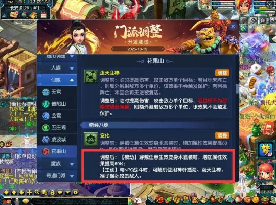 十月门派调整测试进行时,通过昨天的汇总,我们可以总结下部分门派主要的变化: 大唐:浴血流派破血2次变3次,乘势状态下横扫无消耗 天宫:力脉重做,改得有点像凌波城,一重秒三,二重秒四,三重秒五,但是伤害系数比凌波低、输出会衰减,比如凌波飞六个5000,天宫大概是5000-4000-3500-3000-2500这样,且有概率休息,最后的大招有点幽默,渡劫劈自己,然后把自己劈死了。。。 凌波城:提升了抓鬼能力 九黎城:因为输出太超模,再一次被削弱 龙宫:沧海流派改成PK向,玩家可以在战斗中点选技能,多一种输出手段 花果山:优化力花果烧双能力,魔花果流派重做 东海渊:有一个类似皮皮龙的改动,海龟有几率跑出来复活主人 地府:削弱拉人增伤能力,同时通过其余门派(如奶脉神木)削弱其死亡禁锢能力 接下来将透过截图给大家呈现一些可视化信息,首先是各种技能动画表现的优化。 金刚护法: 韦陀护法: 金刚护体: 似玉生香: 普度众生: 龙腾: 变身: 牛劲: 三昧真火: 四系法术,仅呈现烈火、水攻,似乎同步普陀的五行法术了。 行动失败表现,如被封印。 喝女儿红,出现醉酒昏睡状态。 喝醉生梦死,出现醉酒癫狂状态。 大唐点选新经脉后,破血可变为三次攻击,有部分玩家认为,这是专门针对九黎城的,这不点谁谁死啊? 据说商人见势囤起了破血钟灵石。 另外一个利好任务的改动,花果山穿戴套装后,可随机使用各种群秒技能烧双了,目前普遍认为神针撼海伤害系数太低,不太适合挂,秒四的技能可能会成为主流,而魔花果围绕“窍”有了不少提升输出的玩法,玩家担心走不出测试区。 无底洞这边,护盾优化,显示数值。 无底洞新增技能神昏意乱。 龙宫第二流派重做,玩家初始有两个龙珠,通过被动技能及经脉强化后可获得更多龙珠。点选第一行第二个经脉后,单龙宫进入战斗会获得8个龙珠,玩家可在战斗中通过消耗龙珠获得强化能力,点亮左下角的新技能,之后自由选择技能释放,该流派偏向PK,看大招就是叠龙珠释放群体的龙腾,但是感觉希望有点渺茫,具体要等大佬开发新打法了,就不知能不能召唤神龙? 叶子猪梦幻西游玩家群:1群 325703083 (2000人),2群: 330102322 (千人);3群: 424986787 (游戏疑难解答);4群: 330518295 (商人物价);5群: 1063086037 (疑难解答);6群: 1045753197 (春心萌动);7群: 787195090 (活跃互动);8群: 720665628 (全民PK)