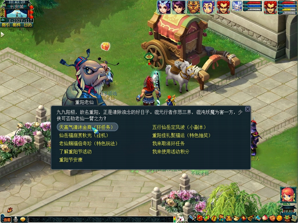 重九登临秋满川,金风净世焕祥晖。2025重阳节活动将于2025年10月21日12:00至10月22日12:00在部分服务器测试。并将于2025年10月28日12:00至11月4日12:00全服放出! 一、天高气清沐金商(环任务) 活动时间:2025年10月28日12:00至2025年11月4日12:00 参与条件:角色等级≥30级,队伍人数≥3人 玩法介绍 九九阳极,故名重阳,正是清除浊念的好日子。因清气上扬、浊气下沉,故高山之巅最适辟邪。趁重阳佳节,少侠可协助三界净化天地,开坛设法。 重复领取式任务。活动期间玩家(≥30级,至少3人组队)可以在长安城(226,120)的重阳老仙处选择“天高气清沐金商(环任务)”领取任务,完成任务后可获得丰厚的经验、金钱、物品奖励与重阳节活动积分。 每日前100环为双倍奖励,100至140环为1.4倍奖励,141环后无奖励。队长在环任务带队中每回合将累计无双值,积攒满后可释放无双技能帮助战斗。队长每次成功带队完成一轮环任务时,均获得一次旋转队长奖励转盘的机会。 在重阳节环任务中,玩家每完成一次环任务均有概率获得抽奖道具“驱邪细绢”,且每场战斗中有概率出现怪物“飘散的细绢”,击败怪物的玩家必定获得“驱邪细绢”奖励。 特别说明 1、任务不受双倍、精修时间影响,死亡计算为非正常死亡,原地复活无损失。若使用800*600、1024*768、1024*768(HD)、1280*960(HD)分辨率、全屏客户端或互通版参与活动,则经验、金钱和获得物品概率都将提升10%。 2、任务时限40分钟,可在重阳节老仙处取消任务,取消任务后3分钟内不能再次领取任务。 3、完成任务将获得重阳节积分,可于2025年11月18日08:00前兑换召唤兽寿命。
