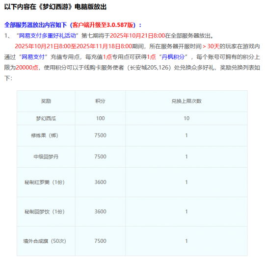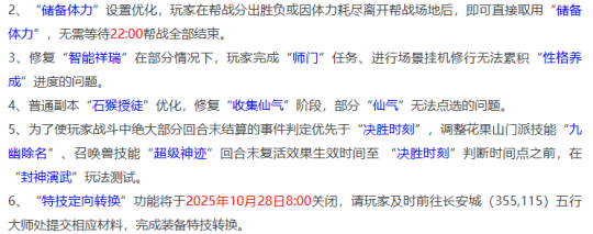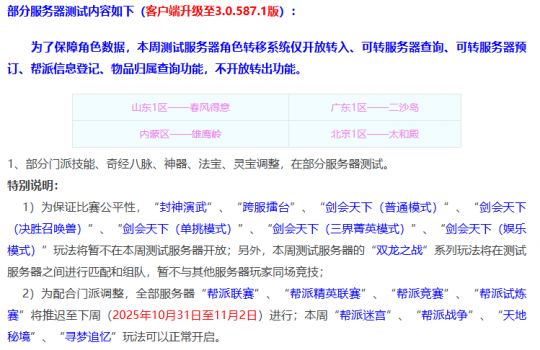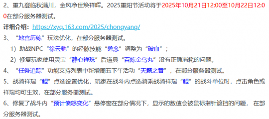 今年十月大改策划对大多数门派都不同程度进行了加强,其中最让玩家想象不到的是大唐官府破血打3下,龙宫龙腾可以秒到10个单位。随着十月大改正式进入了测试服,今年改动基本是尘埃落定了。本周除了大改内容之外,还有一些常规性的维护,一起来看看吧。 首先是全服开放内容,丹枫积分兑换情况,有修炼果、秘制红蓝以及郊外旗子,对于竞速玩家来说,境外旗子是必备的,可以少跑很多路程,大大缩短任务时间。 帮战的储备体力设置优化,玩家在帮战分出胜负或体力耗尽离场,可以直接使用储备体力,不再等到帮战结束;修复智能祥瑞部分情况下无法累积性格养成进度问题;石猴授徒副本优化;战斗中决胜时刻门派、召唤兽技能情况调整;特技定向转换功能将在10月28日关闭。 测试服的维护情况,今年十月大改内容进入测试,正式测试后,1-2周就会全服开放,今年大改最期待的莫过于大唐官府玩家,破血三刀的吸引力还是比较大的,破血+横扫综合点杀能力很强。唯一不舒服的就是破血丹要129级才可以使用,低等级玩家依旧无缘大改。 今年的重阳节活动也将到来,重阳节活动不外乎环式任务、小副本、单人挂机这些常规无法,除此之外还有开驱邪细绢玩法,开驱邪细绢可以获得物品奖励,包含牌子、五宝等。 任务追踪系统增加了天籁之音任务,天籁之音绝对是很多五开低估的一个日常;战骑祥瑞鲲点选设置优化;修复战斗内预计愤怒变化情况。 好了,本期的内容到此就结束了,喜欢表弟的记得点赞。 叶子猪梦幻西游玩家群:1群 325703083 (2000人),2群: 330102322 (千人);3群: 424986787 (游戏疑难解答);4群: 330518295 (商人物价);5群: 1063086037 (疑难解答);6群: 1045753197 (春心萌动);7群: 787195090 (活跃互动);8群: 720665628 (全民PK)