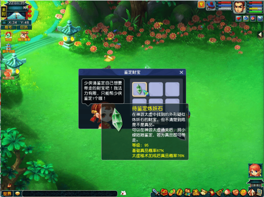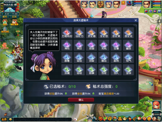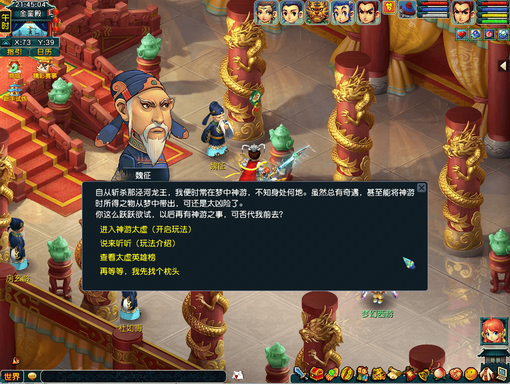 3)灵石合成至6级以上(包含6级)时有概率合成失败,失败则回收一颗精魄灵石; 4)每件召唤兽装备只允许镶嵌一种效果的灵石。 三、神游太虚 参与条件 玩家等级≥100级,服务器开启时间≥60天,队伍人数=5 任务领取 领取地点:长安城-金銮殿(70,42) 任务NPC:魏征 玩法介绍 魏征梦斩泾河龙王,无师自通,掌握了“神游”之法,偶尔还能将神游所得之物带回。少侠听闻也跃跃欲试,请求魏征帮助自己进入“神游”状态。正巧魏征最近总会梦到一处神仙洞府,那洞府金碧辉煌,却内藏玄机,他一直百思不得其解,就请少侠代为前去,探查一番了。谈话间,一阵睡意袭来…… 待醒来,发现少侠已经身处一个华美庭院的入口。在洞府门口,有个小女孩自称“小绿”,说这里是自家主人——春晴夫人的洞府。春晴夫人不知所踪,洞府中又出现了极其诡异的东西,希望能破解洞府中的迷障。 “如果你真能做到,作为回报,那就可以从洞府中挑选一个宝贝带走。” 满足条件的少侠可以通过金銮殿(70,42)的魏征开启神游太虚玩法,玩法需要5人组队开启。每周可以使用神游太虚通宝券参与1次,神游太虚通宝券定价为10仙玉。 进入玩法后,需要找npc小绿定制本次挑战的太虚秘术选择。太虚秘术会加强本次挑战中怪物的能力,分为不同分值,分值越高的太虚秘术对强化效果越强。根据所选太虚秘术的总强度,怪物还会额外获得属性提升。同时根据秘术总强度也会增加玩法的经验与金钱奖励,且在鉴定财宝时有更高概率为真品。 玩家进入春晴夫人的洞府,消灭扰乱洞府的妖怪的同时,寻找春晴夫人的踪迹。 除了怪物挑战,玩家还会在洞府中遇到不同的事件,完成事件也可以获得经验和金钱奖励。还请各位少侠在挑战中多多留意。 怪物挑战胜利与完成事件有概率获得春晴夫人府中的财宝,每件财宝对应一项道具奖励。在完成神游太虚挑战后,每个玩家可以找小绿选择最多1件财宝鉴定。若鉴定结果为真品,则可以获得对应的道具奖励;若鉴定为赝品将无法获得。 特别说明 1、玩法中死亡为正常死亡,会掉落经验金钱,并在原地复活。 2、玩法每周维护时刷新挑战次数,每周可以使用通宝券挑战1次。 3、队长可以消耗太虚之匙为全队额外开启1次神游太虚挑战,每名玩家每周最多额外挑战1次。使用太虚之匙将不会消耗队伍当周通宝券挑战次数,也不需要消耗通宝券。太虚之匙可以在副本官员处使用2000副本积分兑换。 4、选择完太虚秘术后,本次挑战将无法修改选择的太虚秘术,少侠请谨慎选择。 四、新增场景 1、碗子山 特别说明 碗子山,可以从宝象国(150,10)处传送进入,或从大唐境外(12,28)处通过驿站老板传送进入 场景满经验烧双等级:129-139级 额外说明 碗子山场景,在有妖的路牌下方,不使用摄妖香也不会遭遇暗雷战斗 2、波月洞 波月洞,可以从碗子山(63,173)处传送进入 场景满经验烧双等级:150-155级 额外说明 1)新增场景剧情任务“宝象国剧情” 2)新增变身卡“葫芦宝贝变身卡”