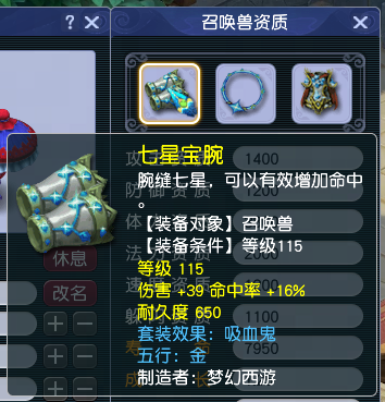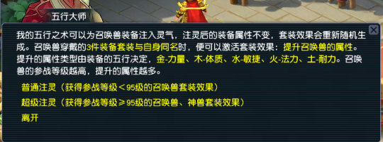 ⑦套装产出途径 1、打造召唤兽装备时有一定几率直接出现套装效果。 2、注灵:在长安(355,115)的五行大师处,可对召唤兽装备进行“注灵”,注灵后即可得到套装效果。 注灵说明: 普通注灵:消耗15万金钱,可为1件召唤兽装备注灵出参战等级<95级的召唤兽套装,类型随机。每次注灵后,增加1点祈福值,祈福值达到30后,下次普通注灵时可选择任一参战等级<95级的召唤兽套装效果。 超级注灵:消耗60万金钱,可为1件召唤兽装备注灵出参战等级≥95级的召唤兽、神兽套装,类型随机。每次注灵后,增加1点祈福值,祈福值达到30后,下次超级注灵时可选择任一参战等级≥95级的召唤兽、神兽套装效果。 3、更改五行:获得套装效果后,如果对套装的五行不满意,可以去长安(355,115)的五行大师处进行修改。每次修改需消耗一定金钱,结果随机,且必定与上一次不同。 ⑧精魄灵石 1、精魄灵石效果 一种拥有特殊能力的宝石,镶嵌过精魄灵石的召唤兽装备,在能力上会有显著提升,效果如下: