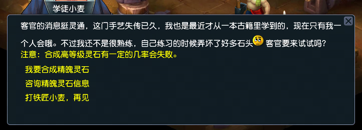 2、精魄灵石合成 长安铁匠铺(24,10)处的学徒小麦掌握着合成精魄灵石的技巧,只有他一个人会哦! 特别说明: 1)灵石合成时必须为同种类,且必须从1级开始,逐级合成(与人物宝石合成规则相同); 2)精魄灵石的合成上限初始为2级,随开服天数逐步提升至10级;